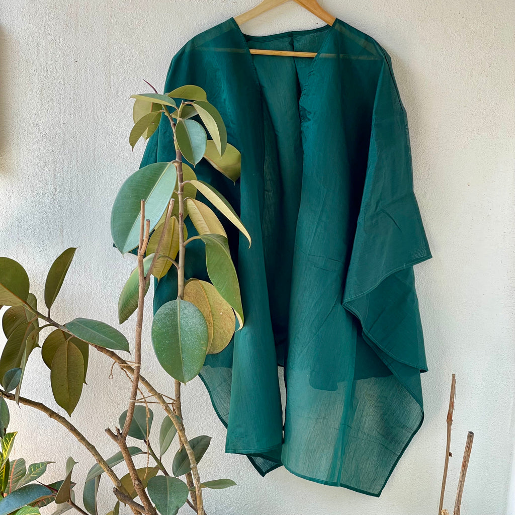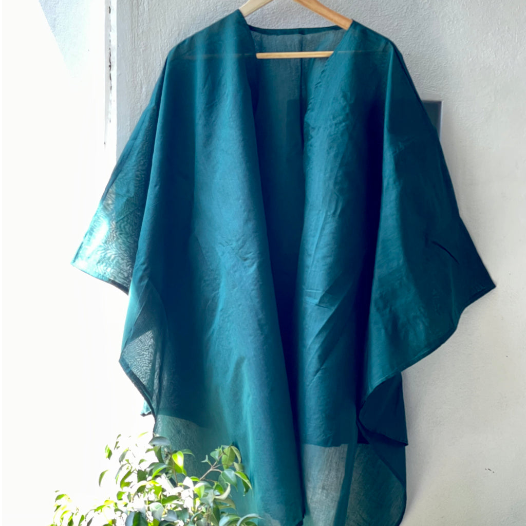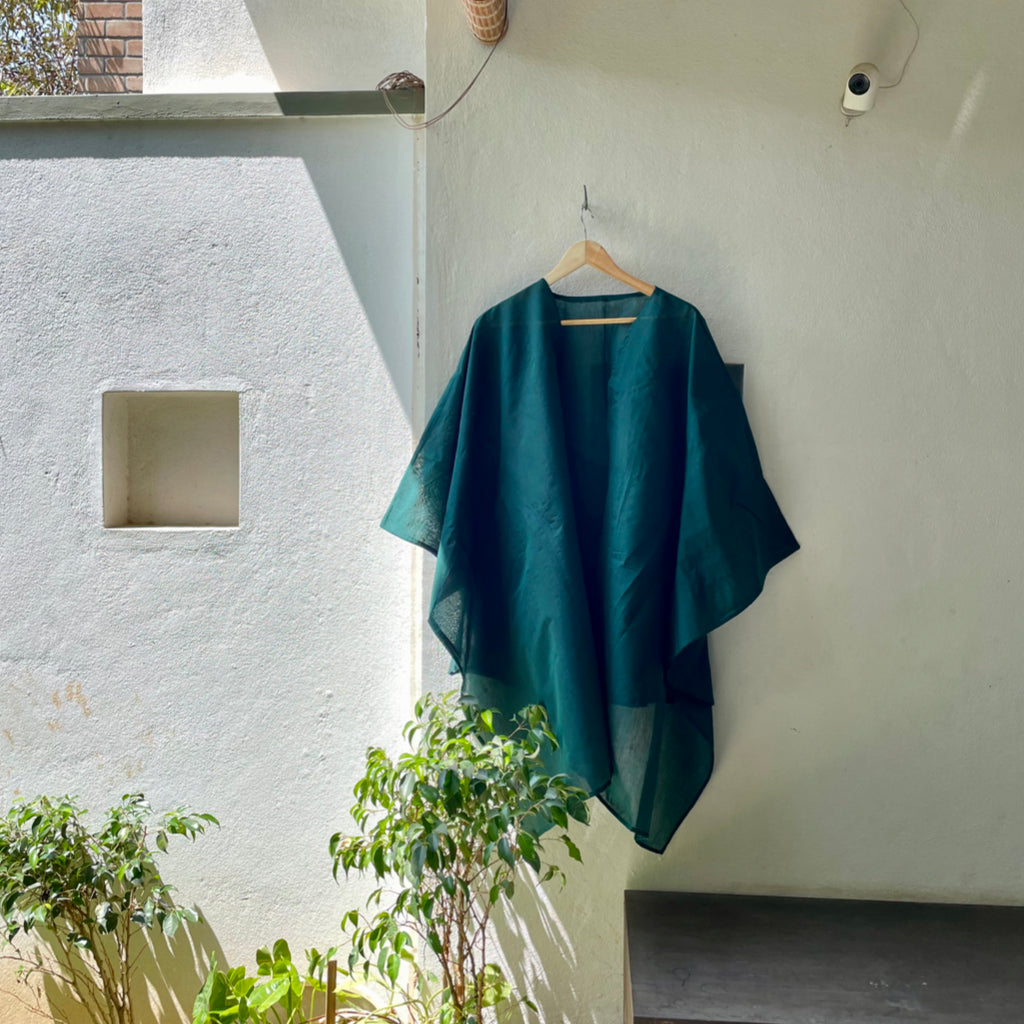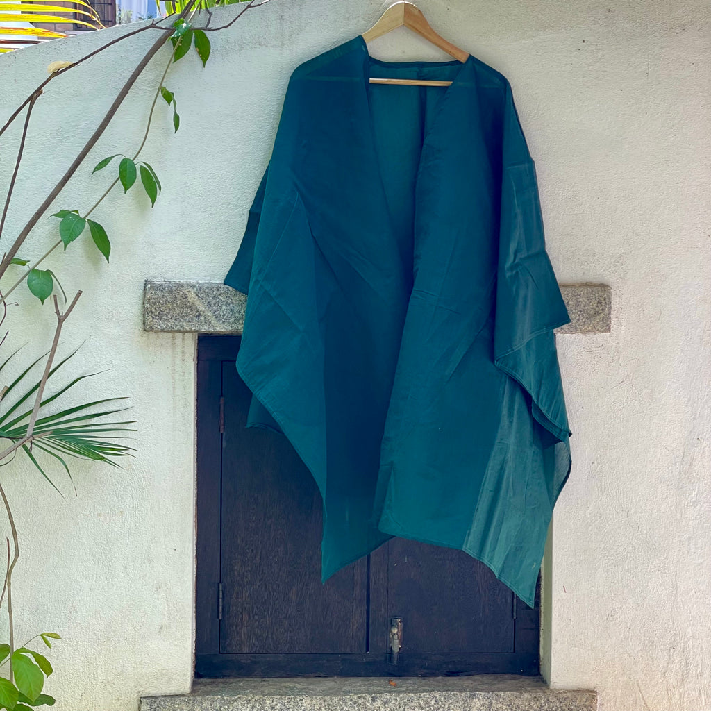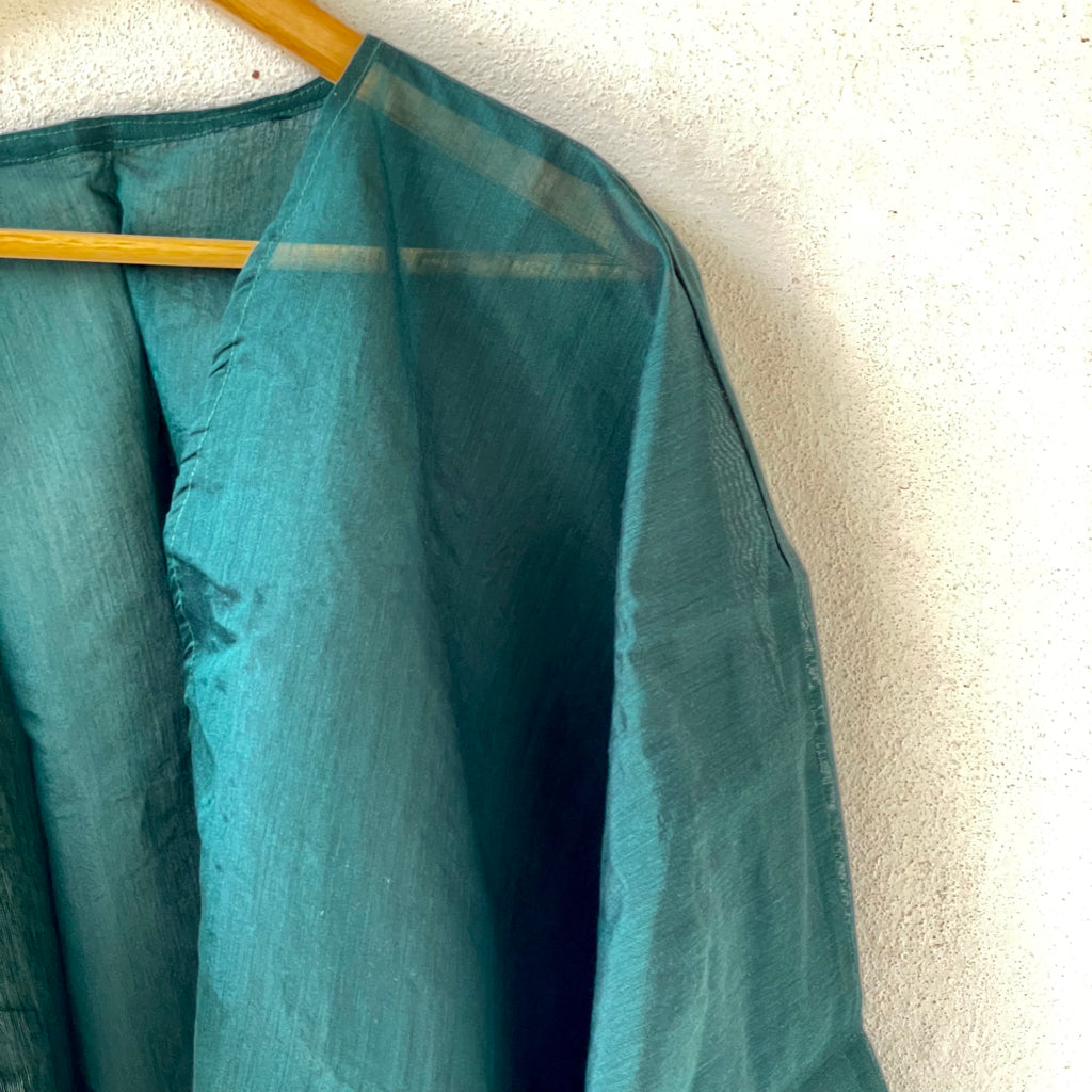 Chanderi—a fabric known for its sheer texture, delicate shine, and regal drape—meets modern styling in teal-hued contemporary shrugs, creating the perfect blend of tradition and trend for elevated evening wear. Contemporary cuts like longline shrugs, cape styles, and structured overlays add a fashion-forward edge to the classic Chanderi. Pair it with -A black slip dress or palazzo set for a glam night out. High-waisted trousers and a crop top for an Indo-western vibe. Chanderi fabric exudes a subtle shimmer that catches the light just right, making it ideal for evening settings. The teal tone brings a sense of freshness and sophistication—calm, confident, and undeniably graceful. Unlike heavy evening layers, Chanderi shrugs are weightless yet impactful. They bring elegance without effort—perfect for dinners, festive evenings, or formal events where you want to shine subtly. The color teal bridges the calm of blue and the energy of green. In Chanderi, it becomes a statement—rich, refined, and ideal for transitioning from daytime subtlety to evening charm. In essence, contemporary Chanderi shrugs in teal offer the best of both worlds: the grandeur of heritage and the simplicity of modern design. They’re perfect for women who want to turn heads without trying too hard.