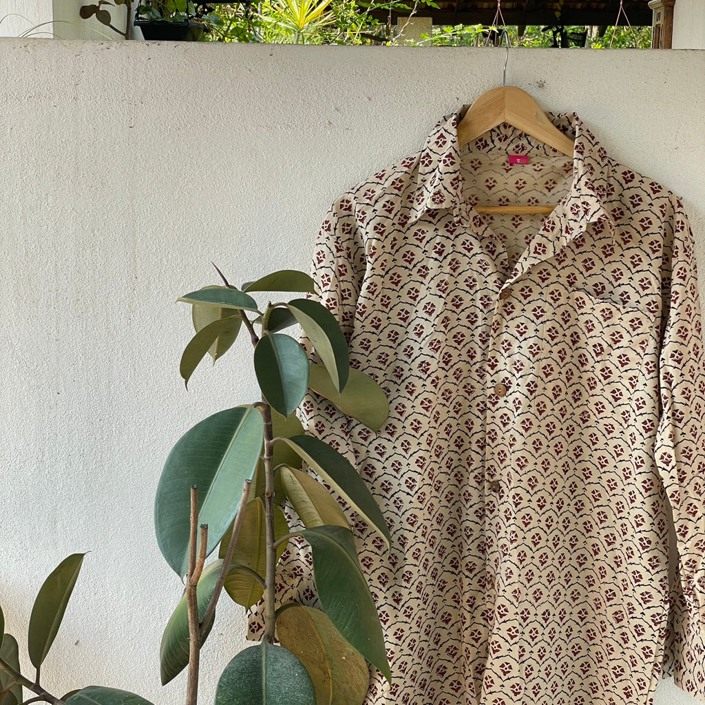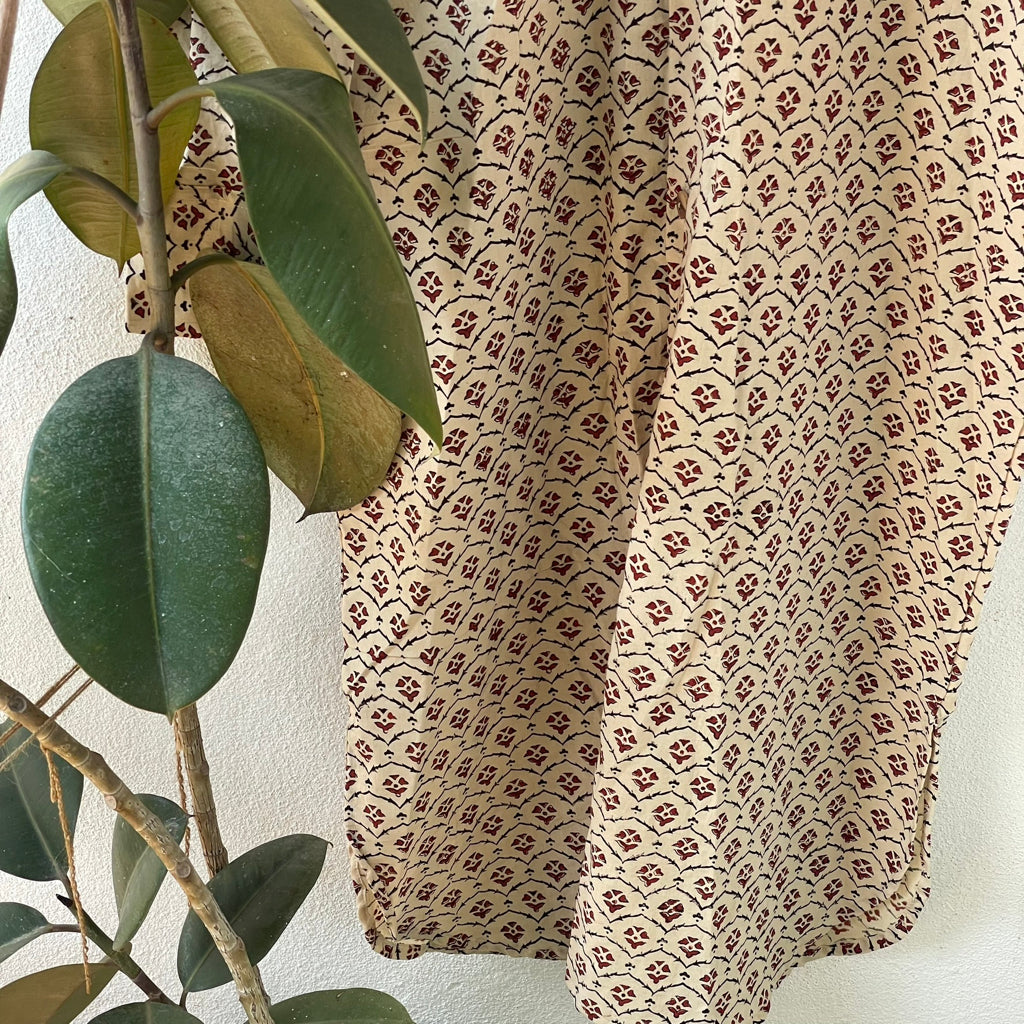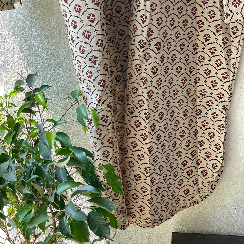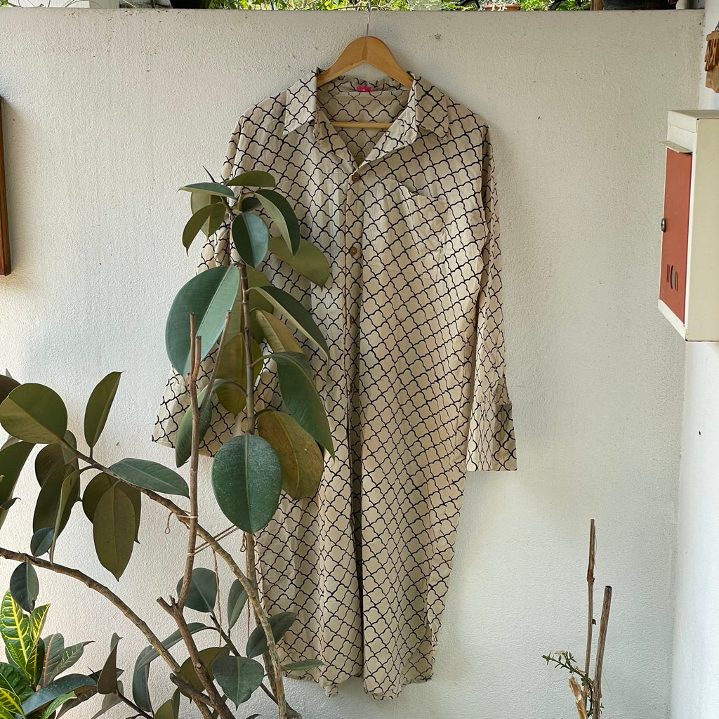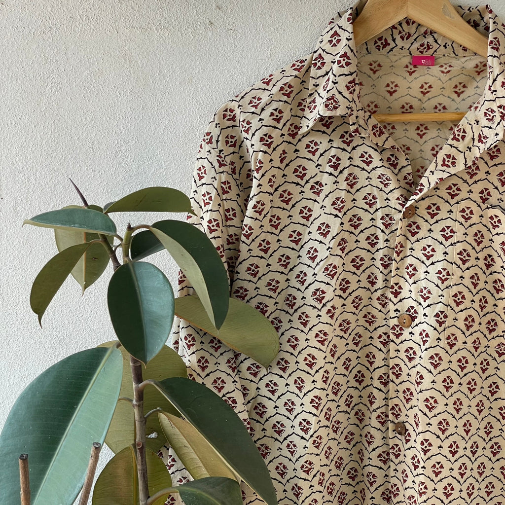 This modern shirt dress is an all timer. You could wear it with a belt or club it on a sheath dress as a shrug. Modern designers and brands have embraced block printing, integrating traditional patterns into contemporary fashion. For example, Anokhi, a retailer based in Jaipur, has been instrumental in reviving and popularizing hand-block prints, blending age-old techniques with modern aesthetics. The enduring appeal of block-printed fabrics lies in their unique imperfections and the human touch evident in each piece, making them cherished elements of Indian apparel that celebrate the nation’s rich artisanal legacy. Block-printed fabrics are integral to Indian fashion, offering both aesthetic appeal and comfort. The lightweight nature of block-printed cotton makes it particularly suitable for India’s varied climates, providing breathable comfort and are appreciated for their softness and versatility. Block printing is a centuries-old textile art form in India, where intricate designs are hand-carved onto wooden blocks and then stamped onto fabrics, primarily cotton and silk. This meticulous process results in textiles adorned with vibrant patterns and motifs, each reflecting the cultural heritage of its region. Shirt Dimensions: 42” x 22” x 44” ( Dress Length x Sleeve Length x Bust )