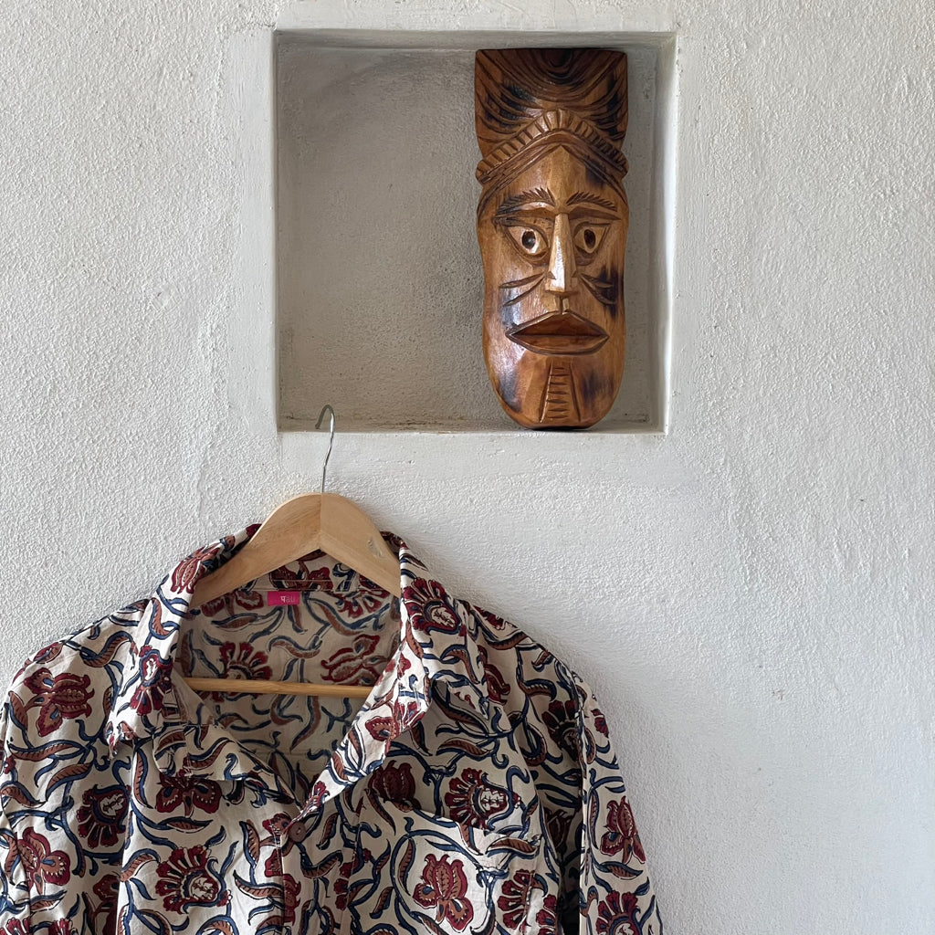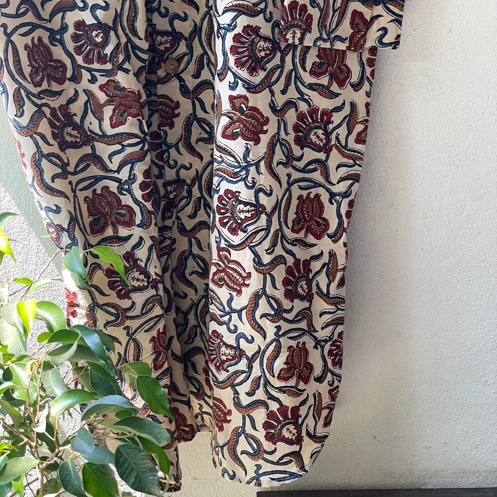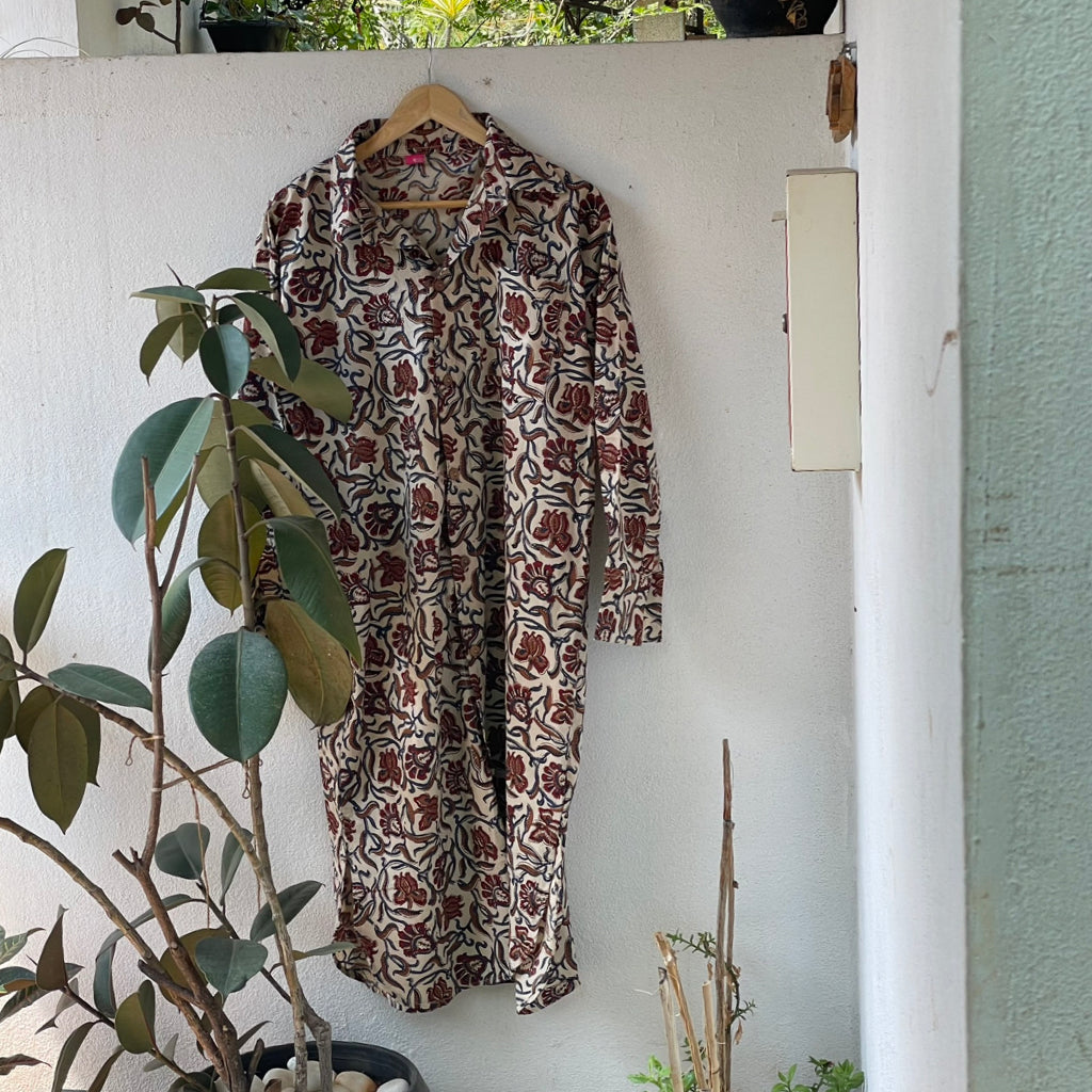 This modern shirt dress is an all timer. You could wear it with a belt or club it on a sheath dress as a shrug. Modern designers and brands have embraced block printing, integrating traditional patterns into contemporary fashion. For example, Anokhi, a retailer based in Jaipur, has been instrumental in reviving and popularizing hand-block prints, blending age-old techniques with modern aesthetics. The enduring appeal of block-printed fabrics lies in their unique imperfections and the human touch evident in each piece, making them cherished elements of Indian apparel that celebrate the nation’s rich artisanal legacy. Block-printed fabrics are integral to Indian fashion, offering both aesthetic appeal and comfort. The lightweight nature of block-printed cotton makes it particularly suitable for India’s varied climates, providing breathable comfort and are appreciated for their softness and versatility. Block printing is a centuries-old textile art form in India, where intricate designs are hand-carved onto wooden blocks and then stamped onto fabrics, primarily cotton and silk. This meticulous process results in textiles adorned with vibrant patterns and motifs, each reflecting the cultural heritage of its region. Shirt Dimensions: 42” x 22” x 44” ( Dress Length x Sleeve Length x Bust )