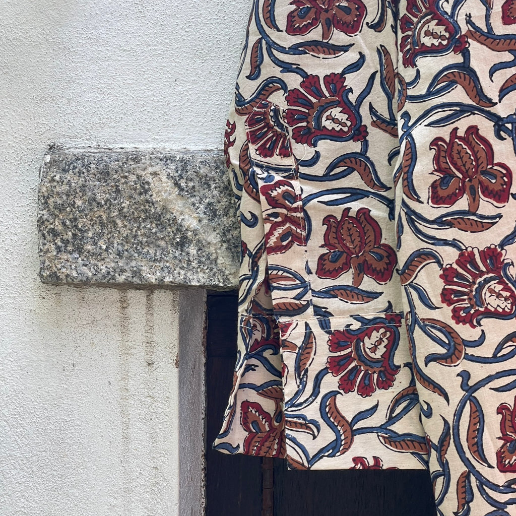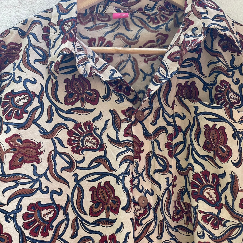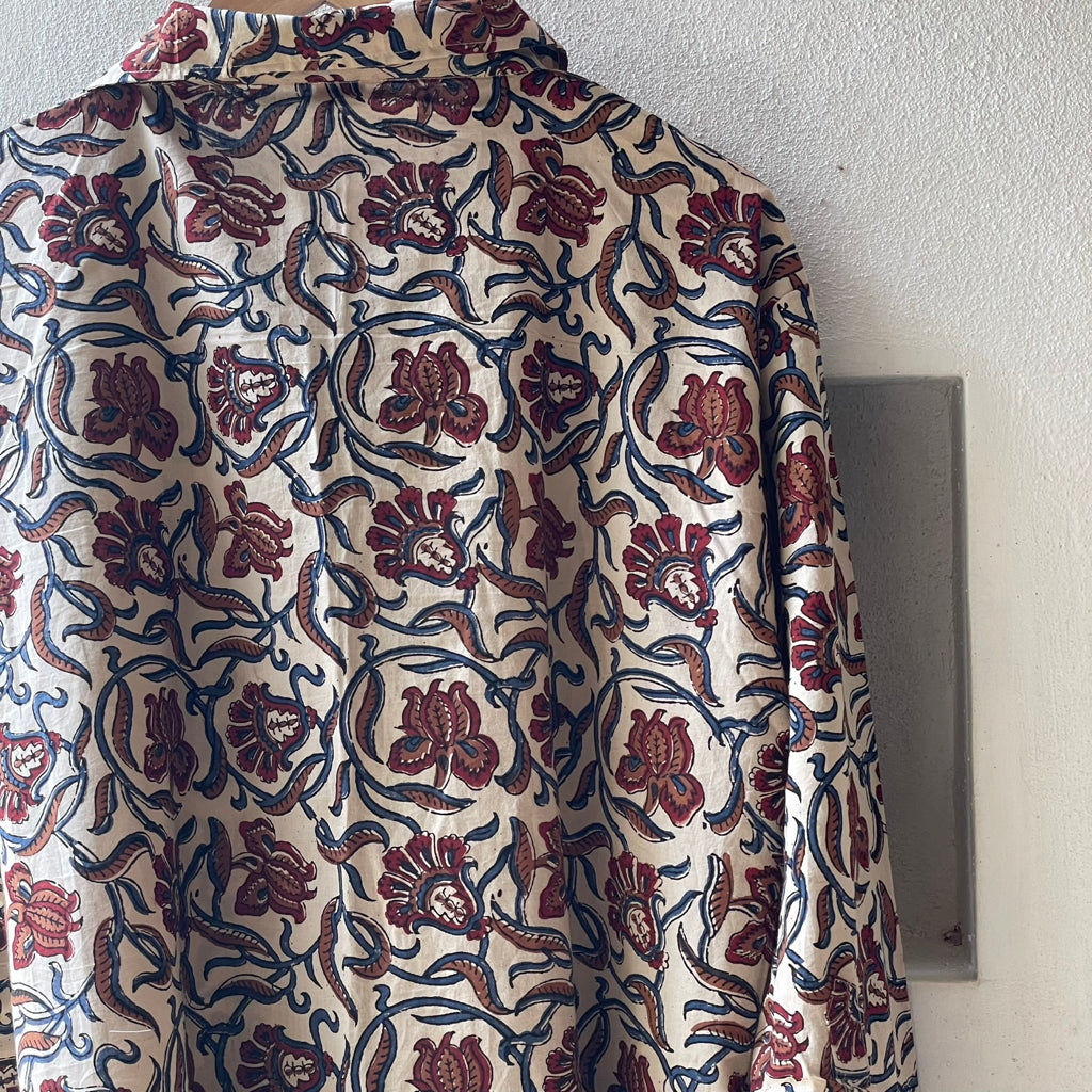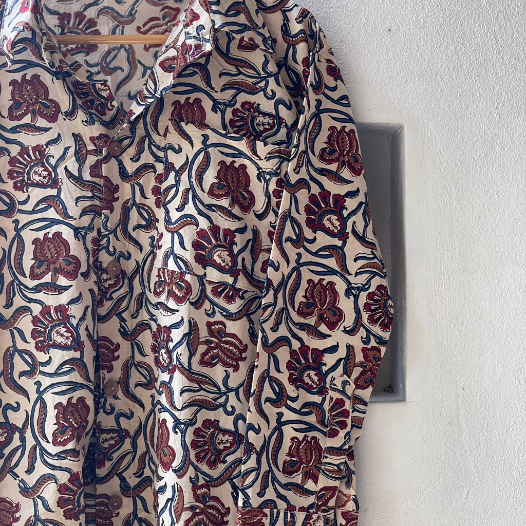 This modern shirt dress is an all timer. You could wear it with a belt or club it on a sheath dress as a shrug. Modern designers and brands have embraced block printing, integrating traditional patterns into contemporary fashion. For example, Anokhi, a retailer based in Jaipur, has been instrumental in reviving and popularizing hand-block prints, blending age-old techniques with modern aesthetics. The enduring appeal of block-printed fabrics lies in their unique imperfections and the human touch evident in each piece, making them cherished elements of Indian apparel that celebrate the nation’s rich artisanal legacy. Block-printed fabrics are integral to Indian fashion, offering both aesthetic appeal and comfort. The lightweight nature of block-printed cotton makes it particularly suitable for India’s varied climates, providing breathable comfort and are appreciated for their softness and versatility. Block printing is a centuries-old textile art form in India, where intricate designs are hand-carved onto wooden blocks and then stamped onto fabrics, primarily cotton and silk. This meticulous process results in textiles adorned with vibrant patterns and motifs, each reflecting the cultural heritage of its region. Shirt Dimensions: 42” x 22” x 44” ( Dress Length x Sleeve Length x Bust )