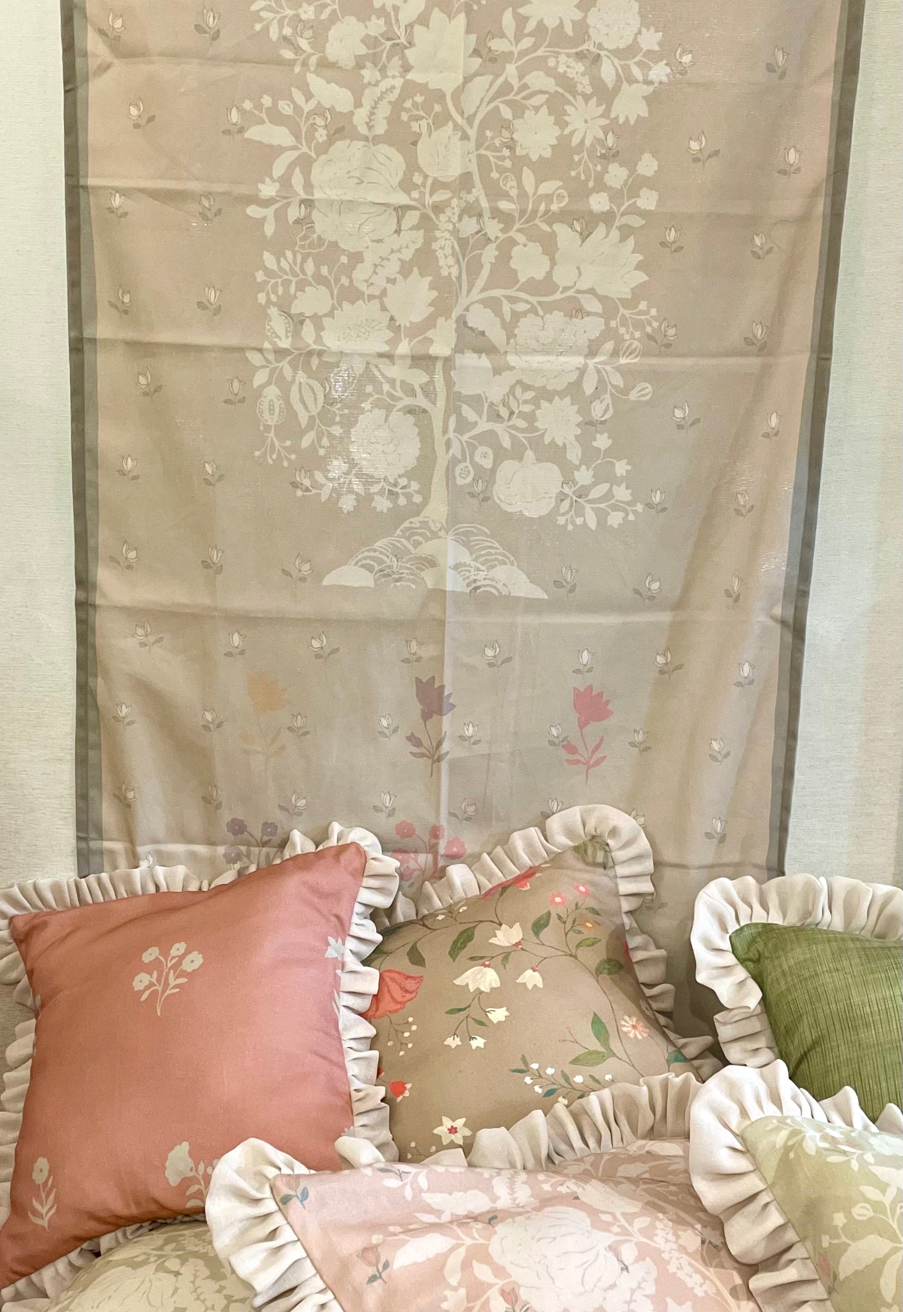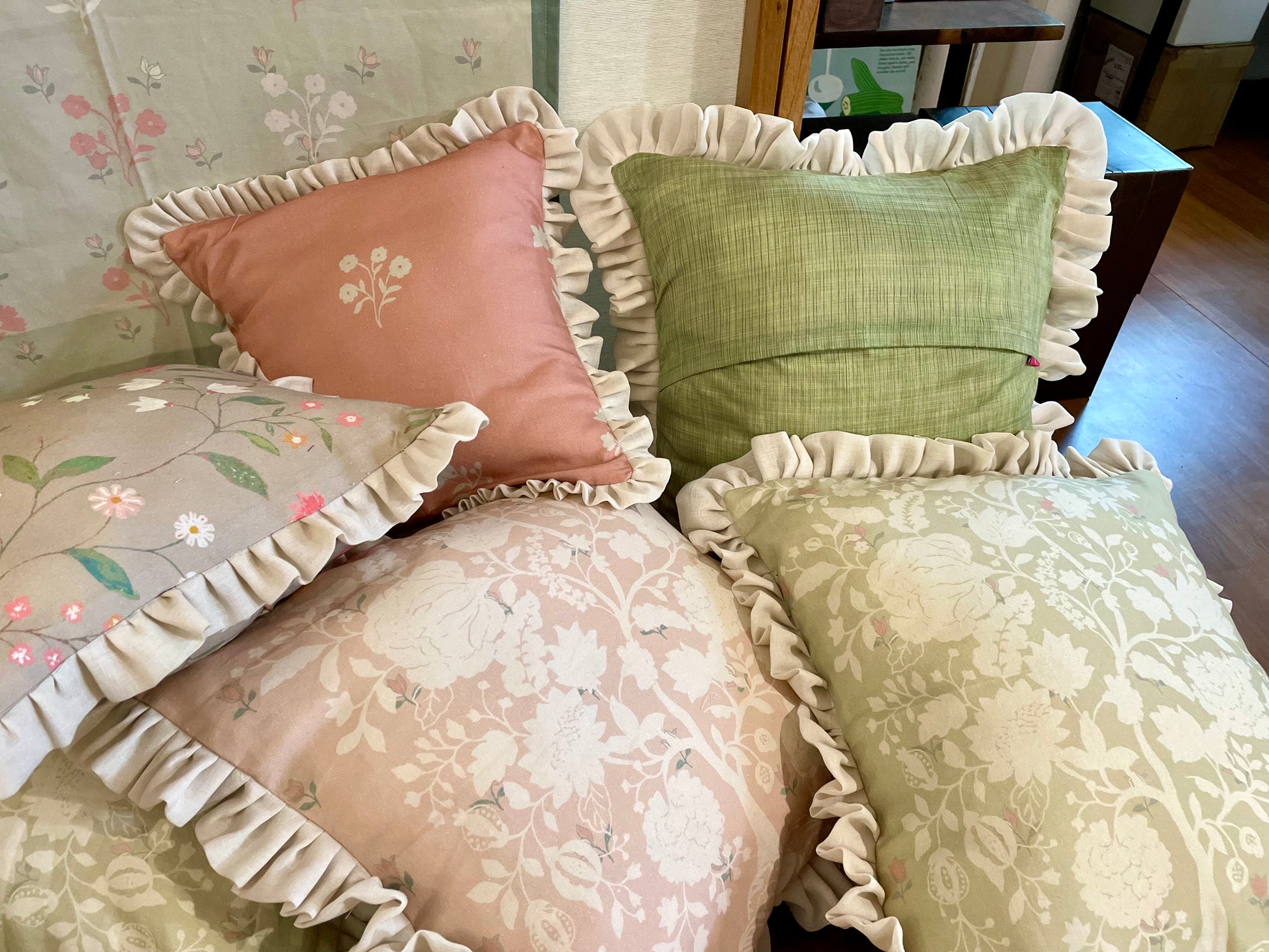 Frilly cushions and ruffles bring a vintage charm to interior spaces by adding a touch of romance, elegance, and nostalgia. They evoke a classic & timeless Look. Ruffles and frills are reminiscent of Victorian, French country, and shabby chic styles. They add a sense of softness and luxury, perfect for creating a cozy, vintage-inspired ambiance. The delicate ruffles, lace trims, and soft fabrics like cotton, linen, or silk give cushions a dreamy, elegant feel. Pairs beautifully with floral prints, pastel tones, and vintage furniture. They add Texture & Depth. Ruffled cushions create layers and movement, making a space feel more plush and sophisticated. Combining different textures like lace, embroidery, or crochet further enhances the vintage appeal. Mix solid-colored ruffled cushions with floral or toile prints for a balanced look. Soft colors like cream, blush pink, dusty blue, or sage green work best for a vintage-inspired space.