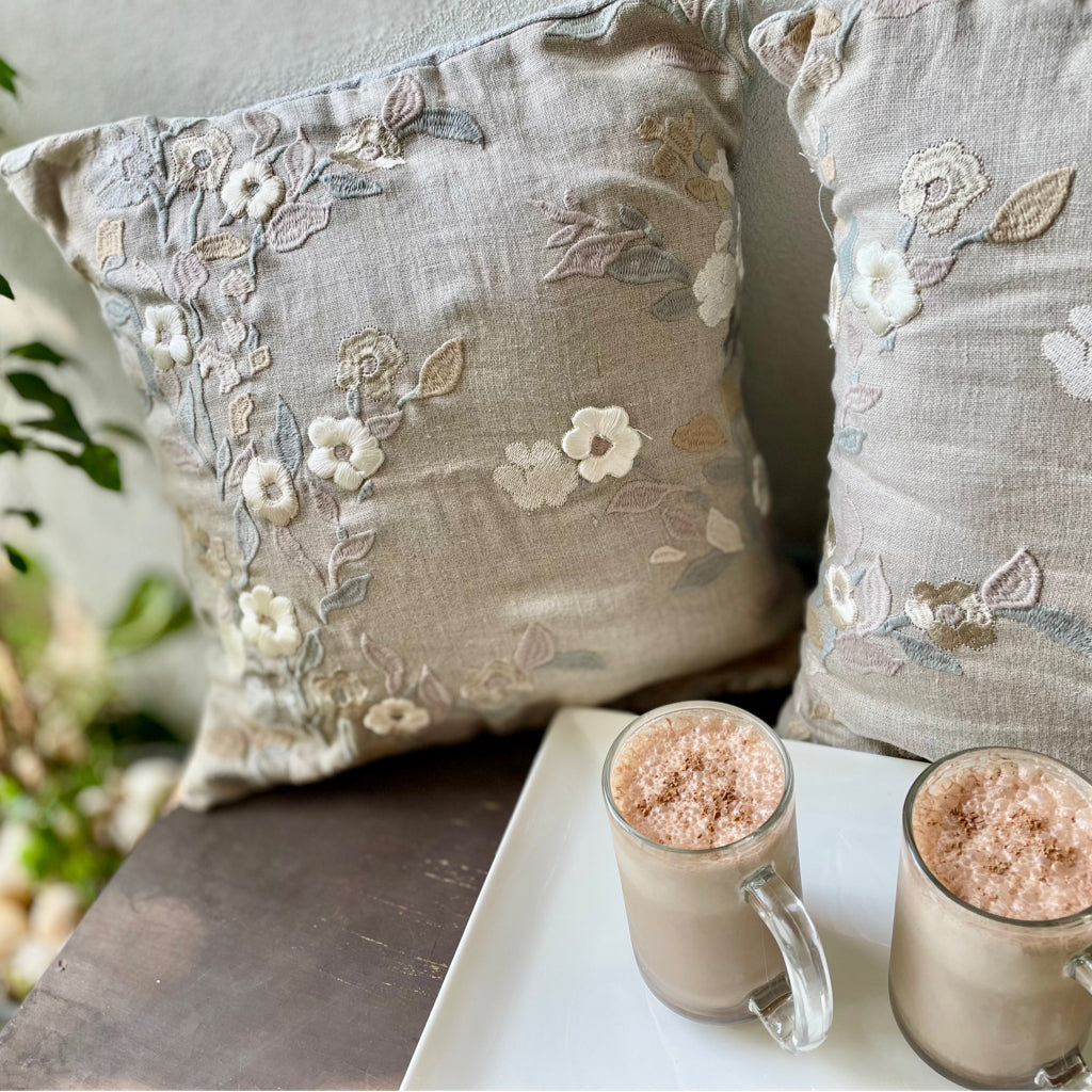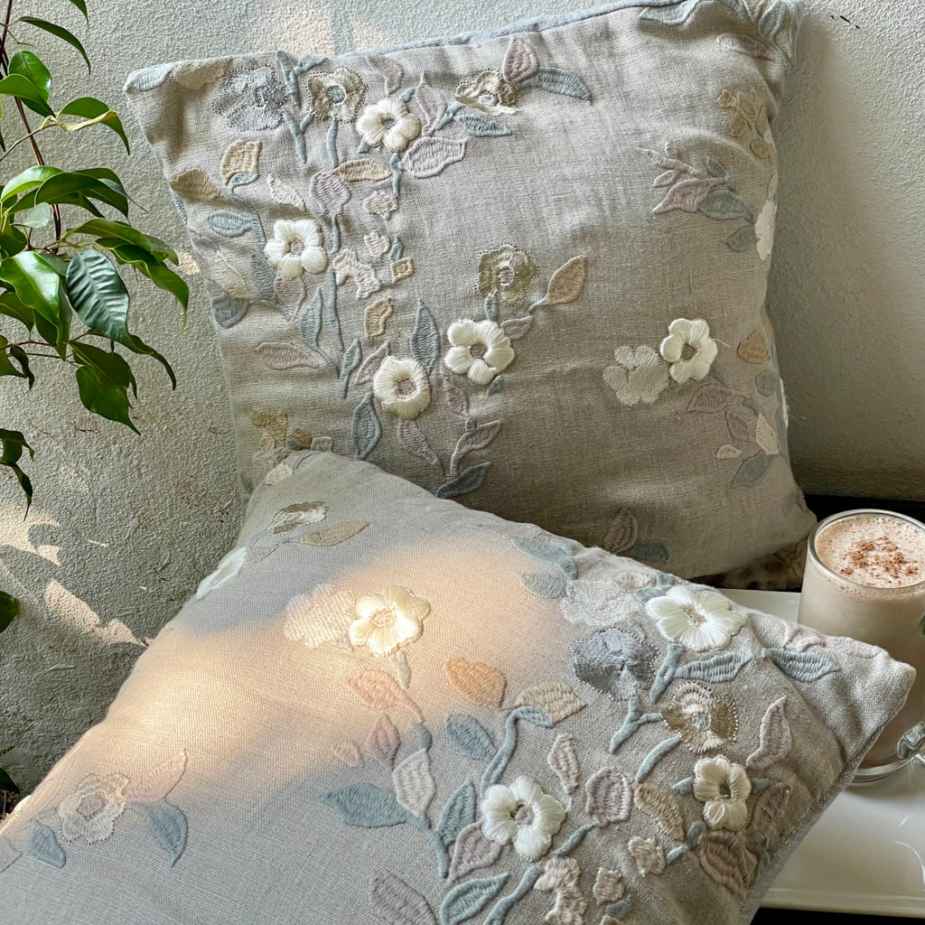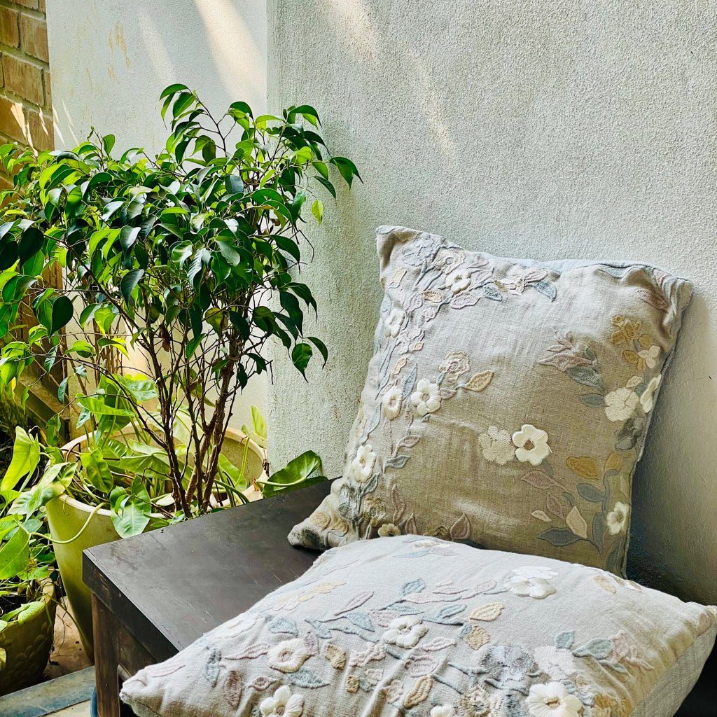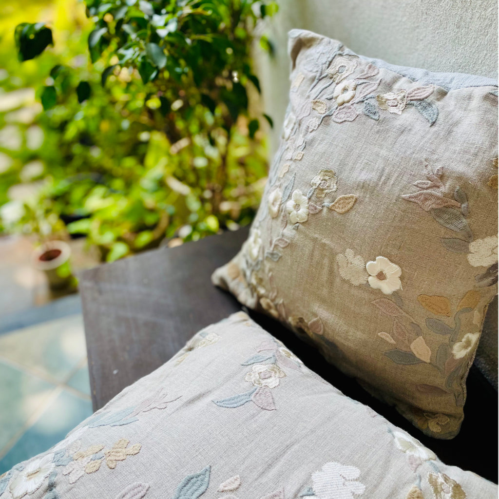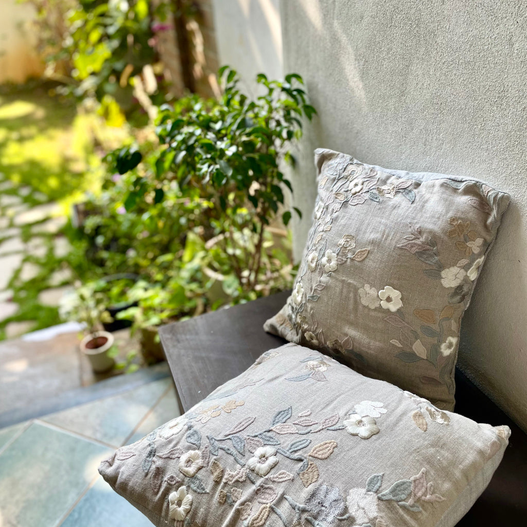 Add a touch of elegance in your space with these rich embroidered linen cushions. Floral embroidery on cottons and linens is a timeless art form that brings nature’s beauty into textiles. Whether inspired by wild meadows, regal gardens, or traditional folk patterns, embroidered floral motifs tell stories of culture, craftsmanship, and nostalgia. When transformed into cushions, these fabrics become poetic expressions of heritage and artistry, adding warmth, texture, and elegance to any space. The rich embroidered look on the linen base, brings in a handcrafted appeal perfect for vintage-inspired interiors. Floral embroidered cushions do more than decorate—they preserve memories, craftsmanship, and cultural narratives. Whether passed down as family keepsakes or created with modern interpretations, each cushion holds a piece of history. Placed on a cozy armchair, a sunlit bench, or a vintage settee, these cushions whisper tales of blooming gardens, artisanal skill, and the enduring beauty of nature.