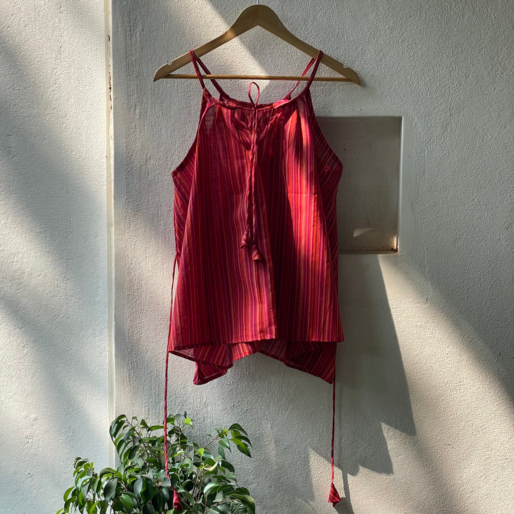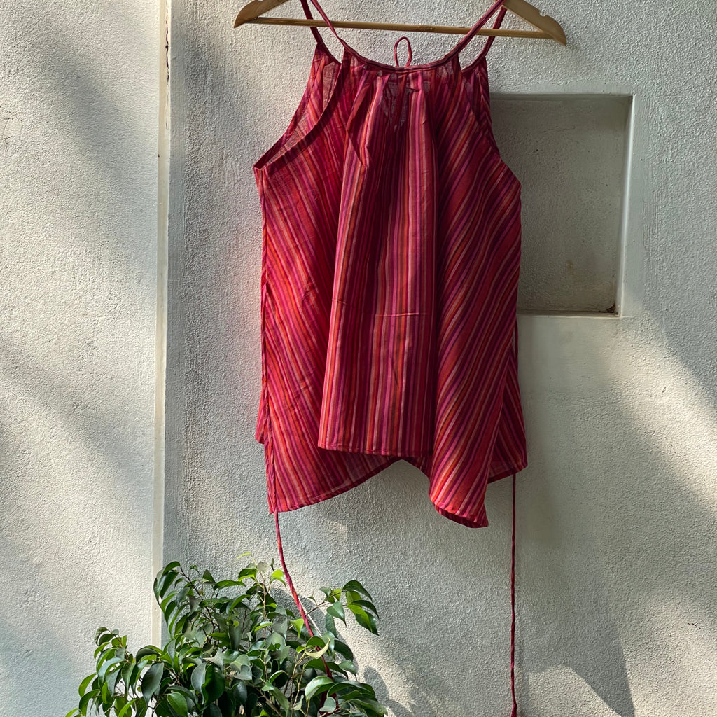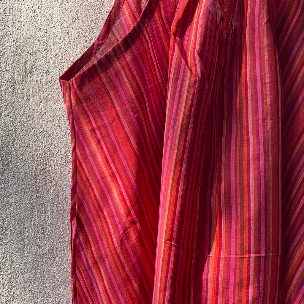 Try this breezy cotton summer tops for comfort and style. Colourful and spicy just like the Indian pop golas. Pair it with a wrop skirt, jeans or even with a pair of shorts with a hat and cycle down the street to try your favourite popsicle. In these contemporary cuts, hese fabrics blend traditional craftsmanship with modern style. Made from Mangalgiri striped fabrics, a well-known handwoven textile from Mangalgiri, Andhra Pradesh, India. These fabrics are made using pure cotton or a cotton-silk blend and are famous for their durability, softness, and breathability, making them an excellent choice for apparel wear. Made with fine cotton yarns, Mangalgiri fabric allows air circulation, keeping the wearer cool and comfortable, especially in hot and humid climates. Unlike power-loom fabrics, the tightly woven structure prevents gaps, giving a smooth texture and a refined look. The stripes add a stylish touch, making them perfect for both casual and formal wear. Compared to regular cotton, Mangalgiri fabrics hold their shape well after washing and require minimal ironing.
