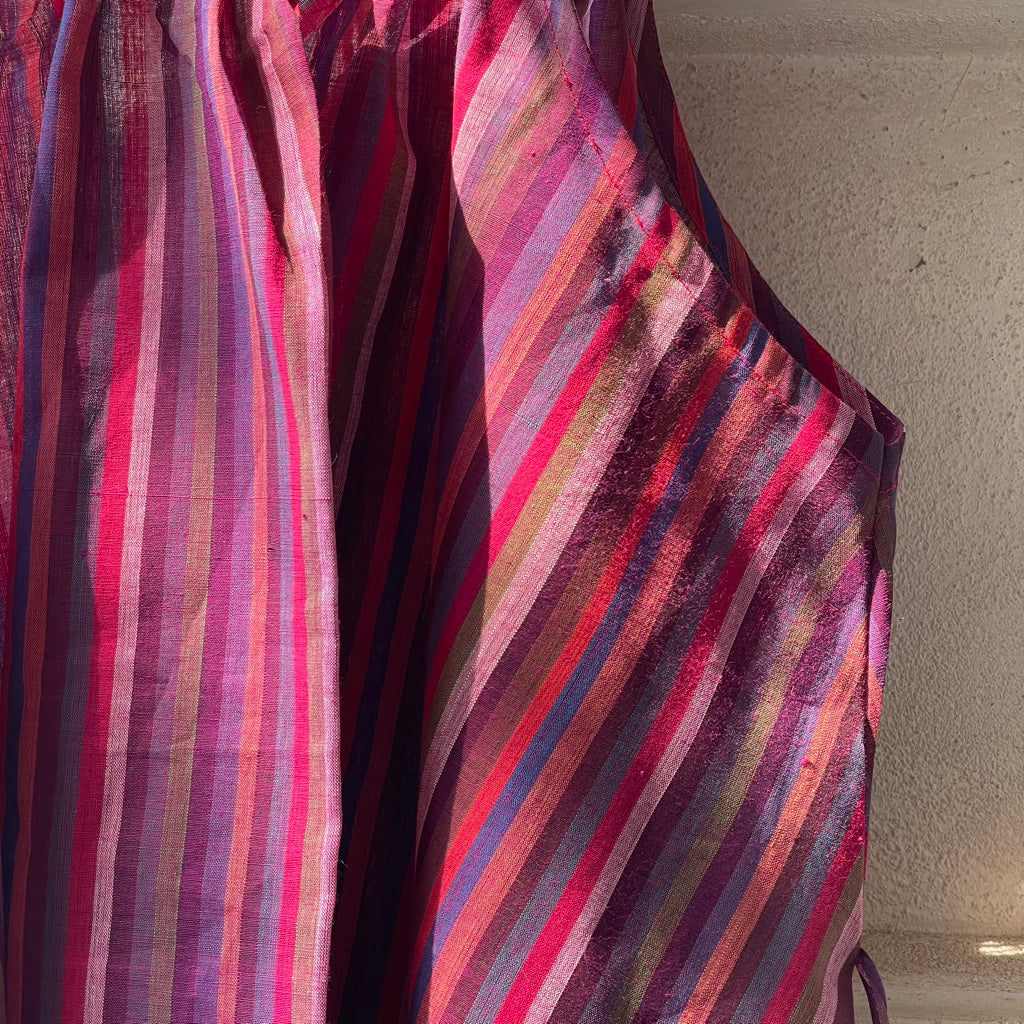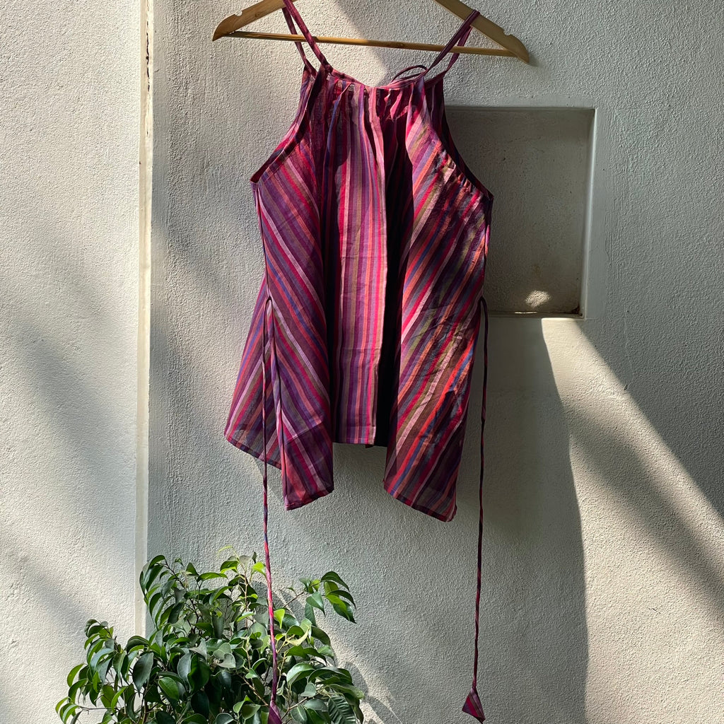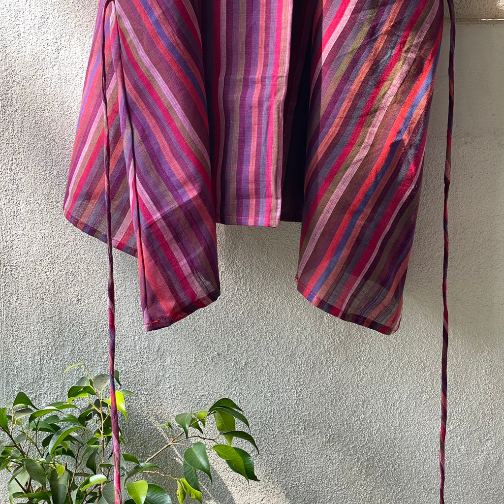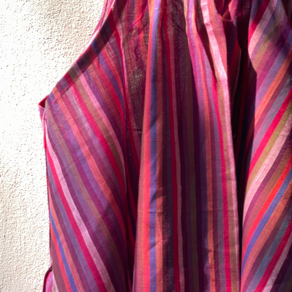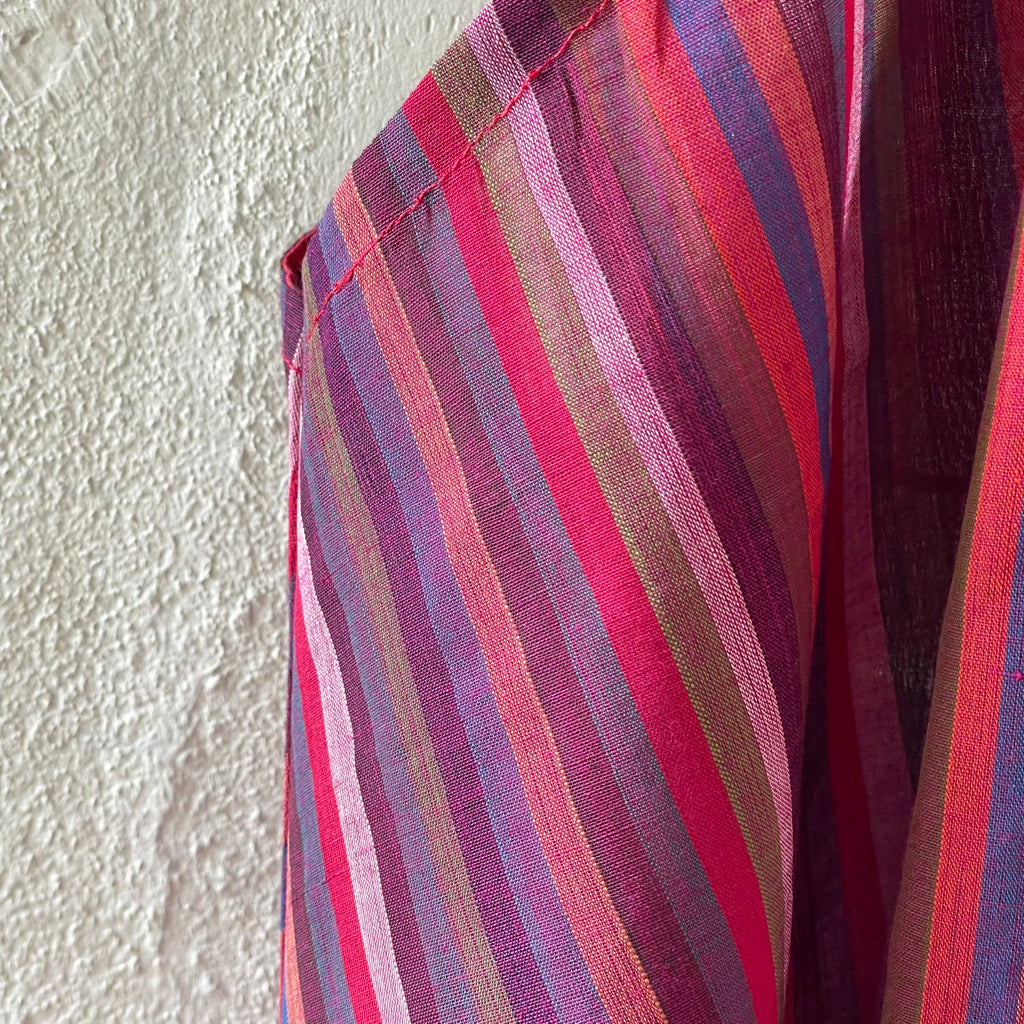 Try this breezy cotton summer tops for comfort and style. Colourful and spicy just like the Indian pop golas. Pair it with a wrop skirt, jeans or even with a pair of shorts with a hat and cycle down the street to try your favourite popsicle. In these contemporary cuts, hese fabrics blend traditional craftsmanship with modern style. Made from Mangalgiri striped fabrics, a well-known handwoven textile from Mangalgiri, Andhra Pradesh, India. These fabrics are made using pure cotton or a cotton-silk blend and are famous for their durability, softness, and breathability, making them an excellent choice for apparel wear. Made with fine cotton yarns, Mangalgiri fabric allows air circulation, keeping the wearer cool and comfortable, especially in hot and humid climates. Unlike power-loom fabrics, the tightly woven structure prevents gaps, giving a smooth texture and a refined look. The stripes add a stylish touch, making them perfect for both casual and formal wear. Compared to regular cotton, Mangalgiri fabrics hold their shape well after washing and require minimal ironing.
