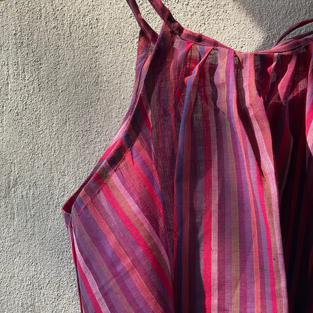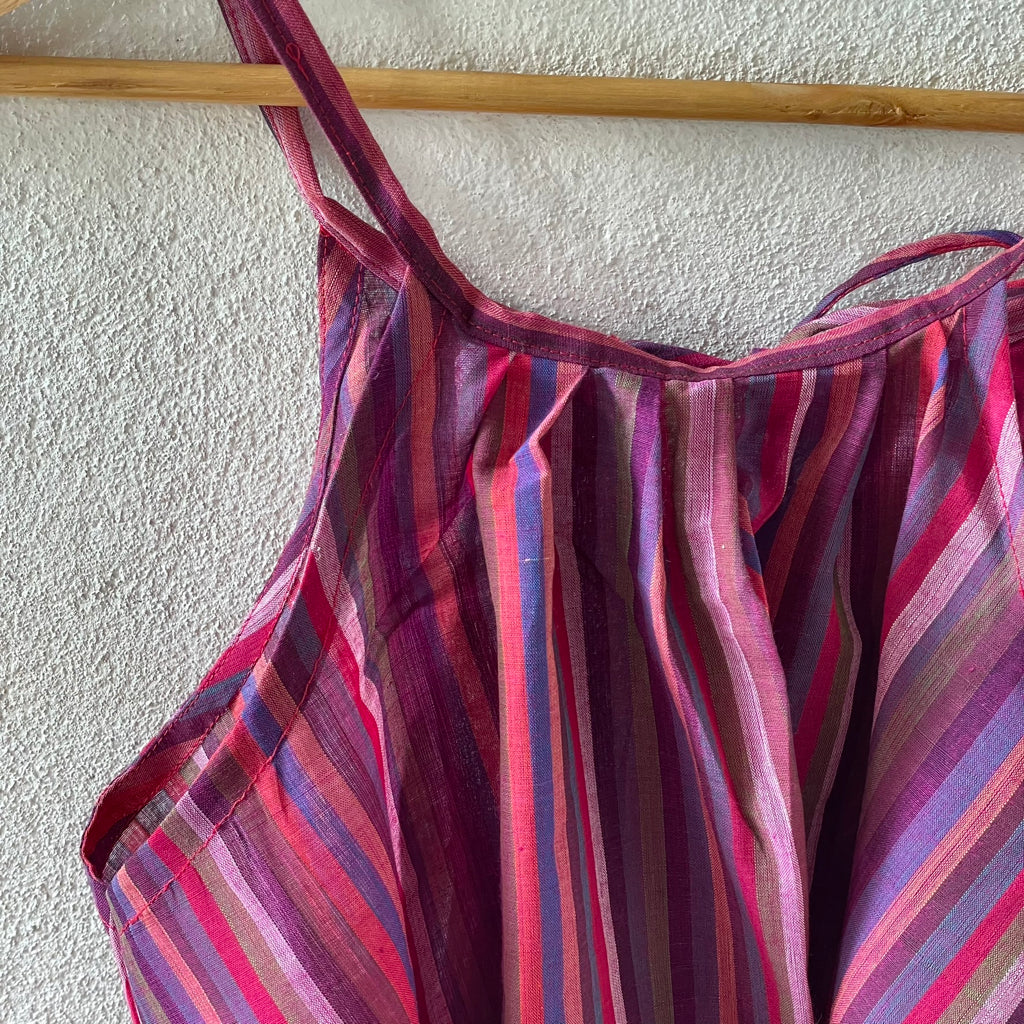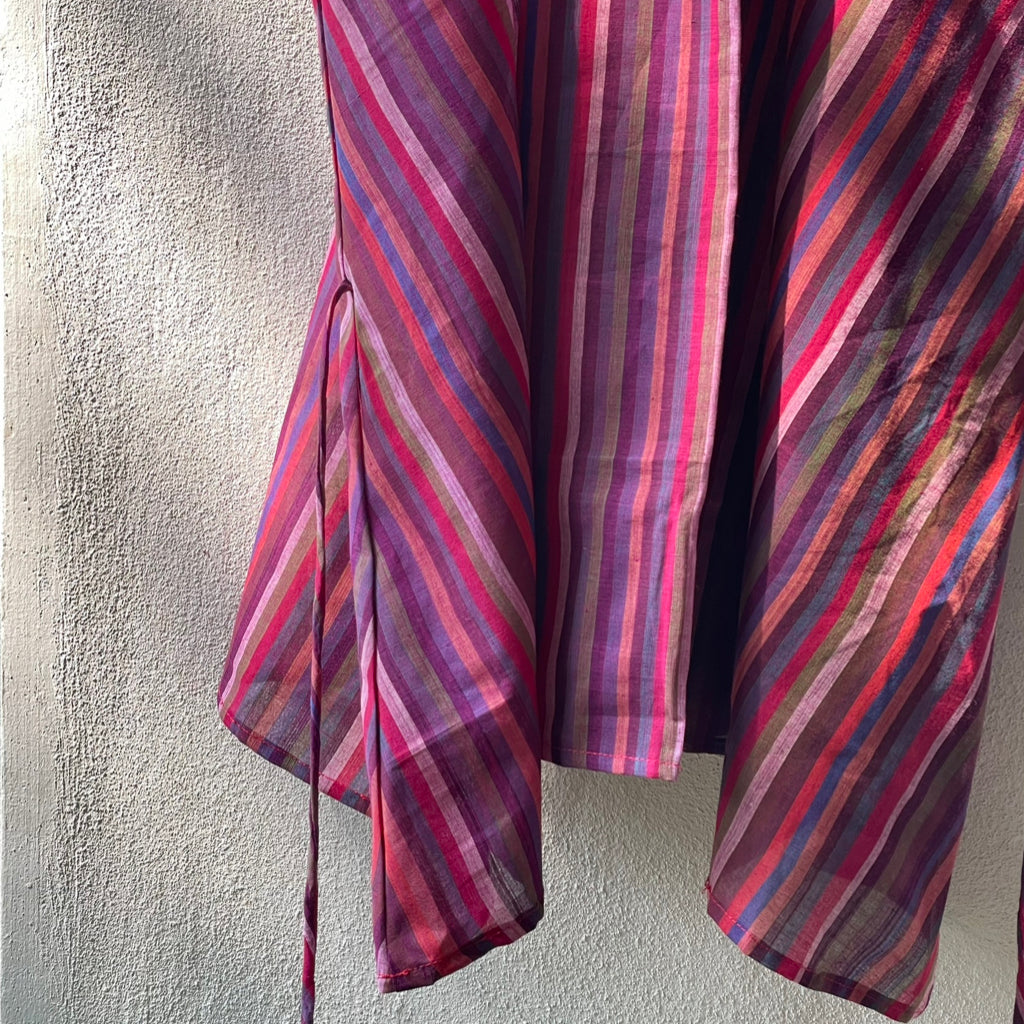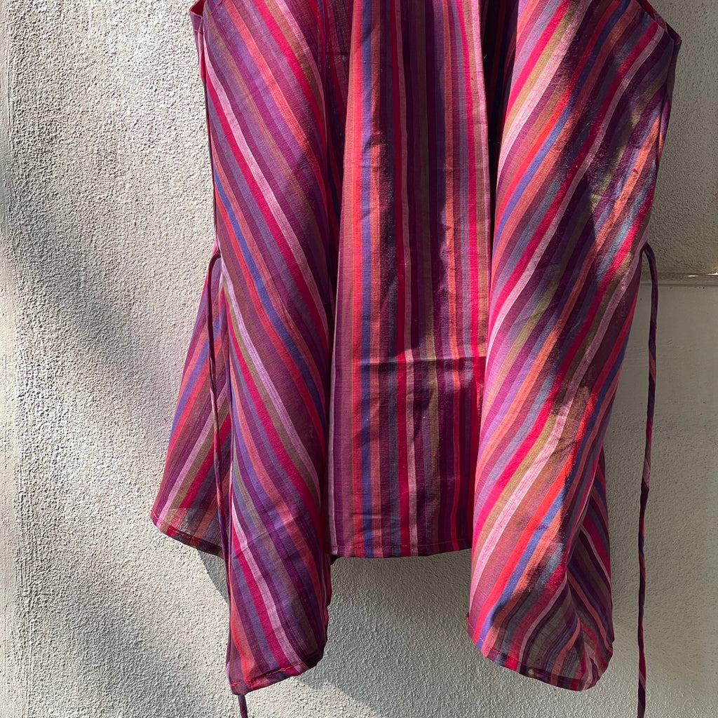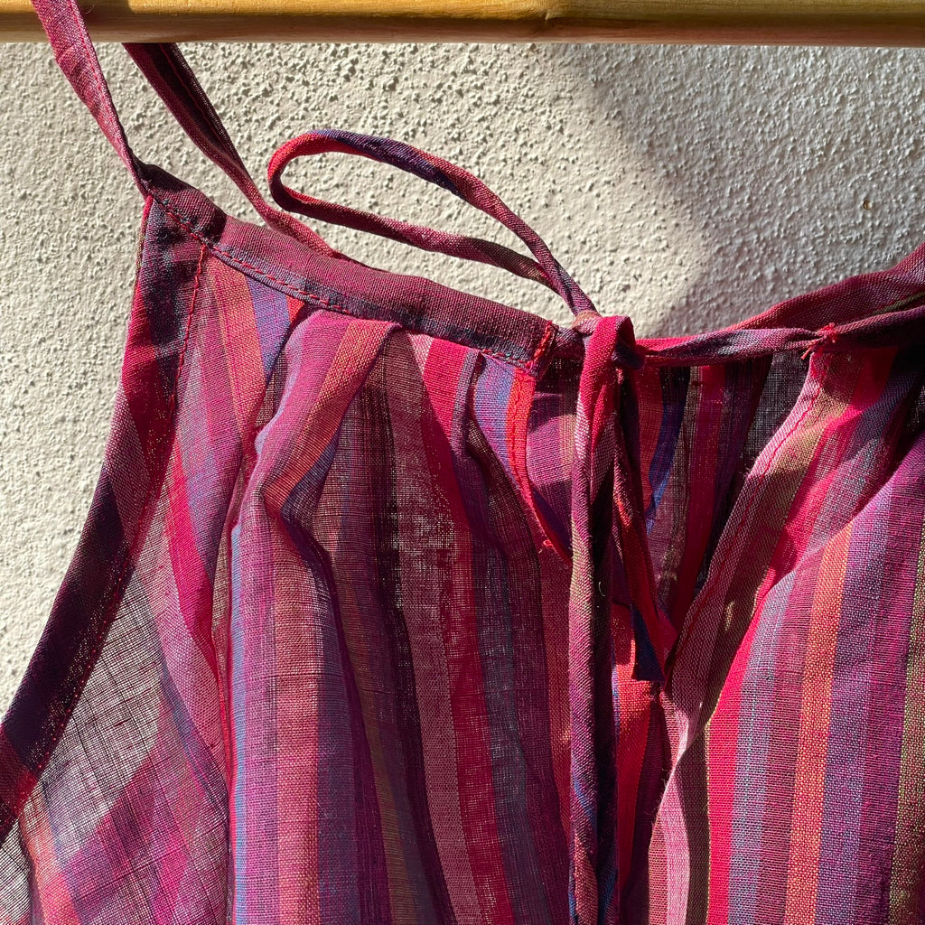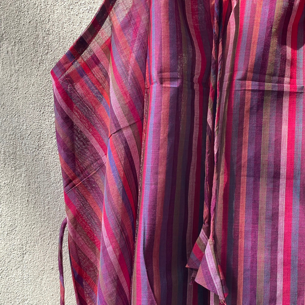 Try this breezy cotton summer tops for comfort and style. Colourful and spicy just like the Indian pop golas. Pair it with a wrop skirt, jeans or even with a pair of shorts with a hat and cycle down the street to try your favourite popsicle. In these contemporary cuts, hese fabrics blend traditional craftsmanship with modern style. Made from Mangalgiri striped fabrics, a well-known handwoven textile from Mangalgiri, Andhra Pradesh, India. These fabrics are made using pure cotton or a cotton-silk blend and are famous for their durability, softness, and breathability, making them an excellent choice for apparel wear. Made with fine cotton yarns, Mangalgiri fabric allows air circulation, keeping the wearer cool and comfortable, especially in hot and humid climates. Unlike power-loom fabrics, the tightly woven structure prevents gaps, giving a smooth texture and a refined look. The stripes add a stylish touch, making them perfect for both casual and formal wear. Compared to regular cotton, Mangalgiri fabrics hold their shape well after washing and require minimal ironing.