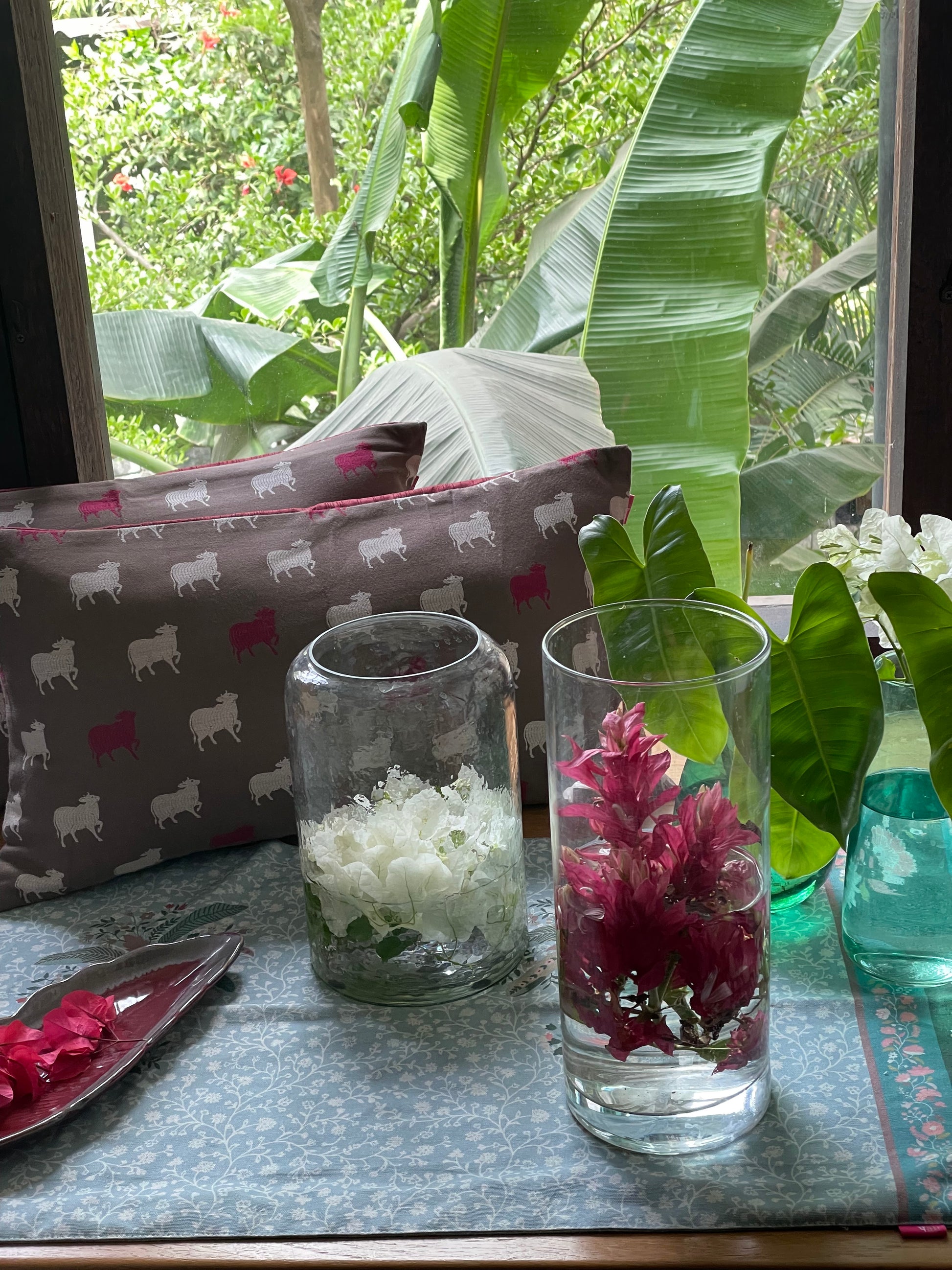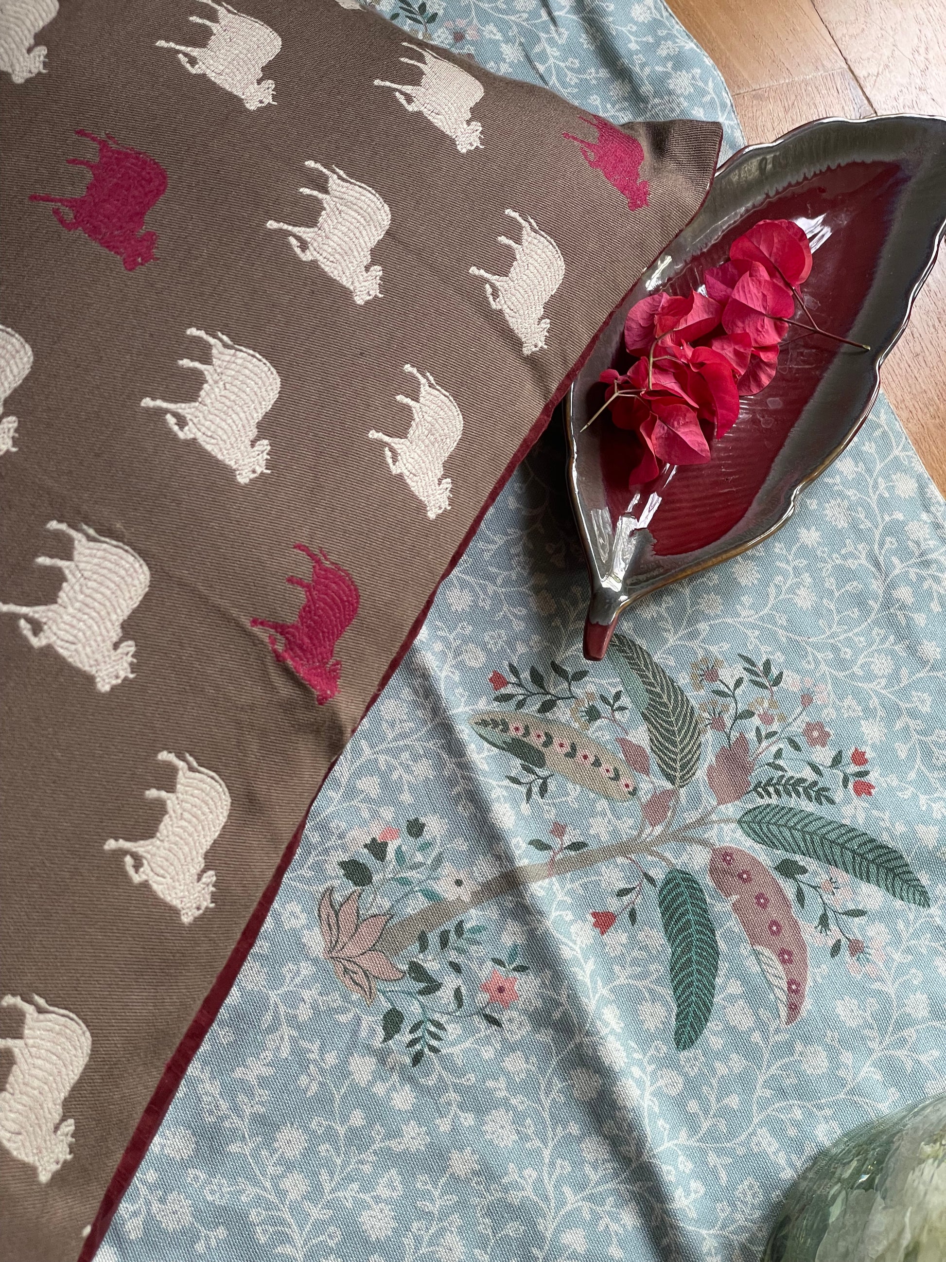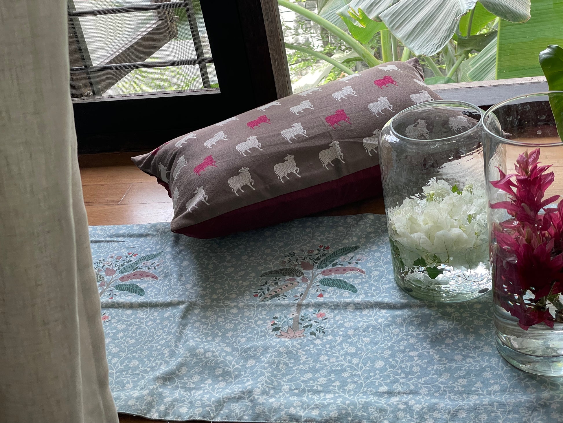 These festive cushion covers add elegance by their presence and narrate timeless tales of devotion, artistry and celebration carrying forward India’s rich legacy of textile storytelling. Red symbolizes purity, prosperity, and marital bliss, seen in Diwali decorations and bridal attire. Green is associated with life, renewal, and harmony, commonly used during Eid and Navratri. Pichwai art takes on a tactile richness, transforming cushions into expressions of heritage, culture, and spirituality.