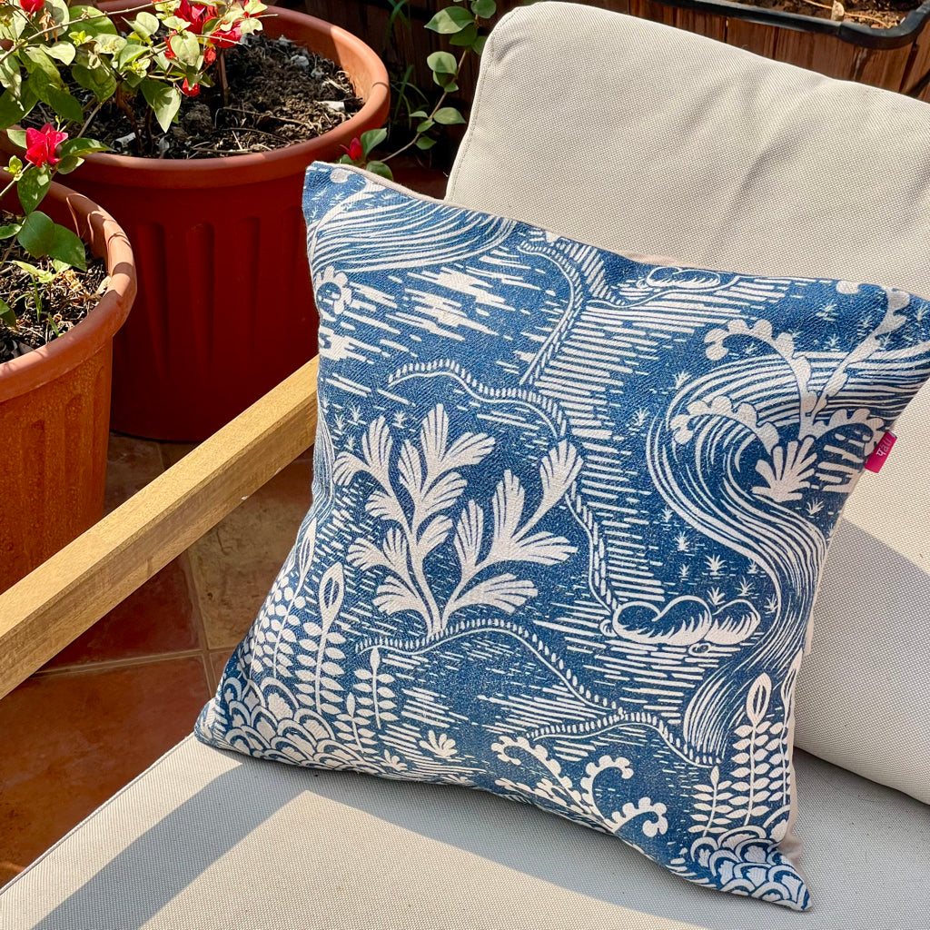 Blue is a soothing color in the heat of Indian summers. Landscape print fabrics on cotton and linen bridge the gap between nature and home interiors, making cushions more than just decorative pieces. These become windows to distant places, carriers of cultural art, and reminders of the beauty found in nature, offering comfort both visually and emotionally. Monochrome or abstract landscape prints add subtle elegance without overpowering the room. Prints featuring exotic landscapes, coastal views, or desert dunes evoke memories of journeys and adventures. Product includes only cushion cover.