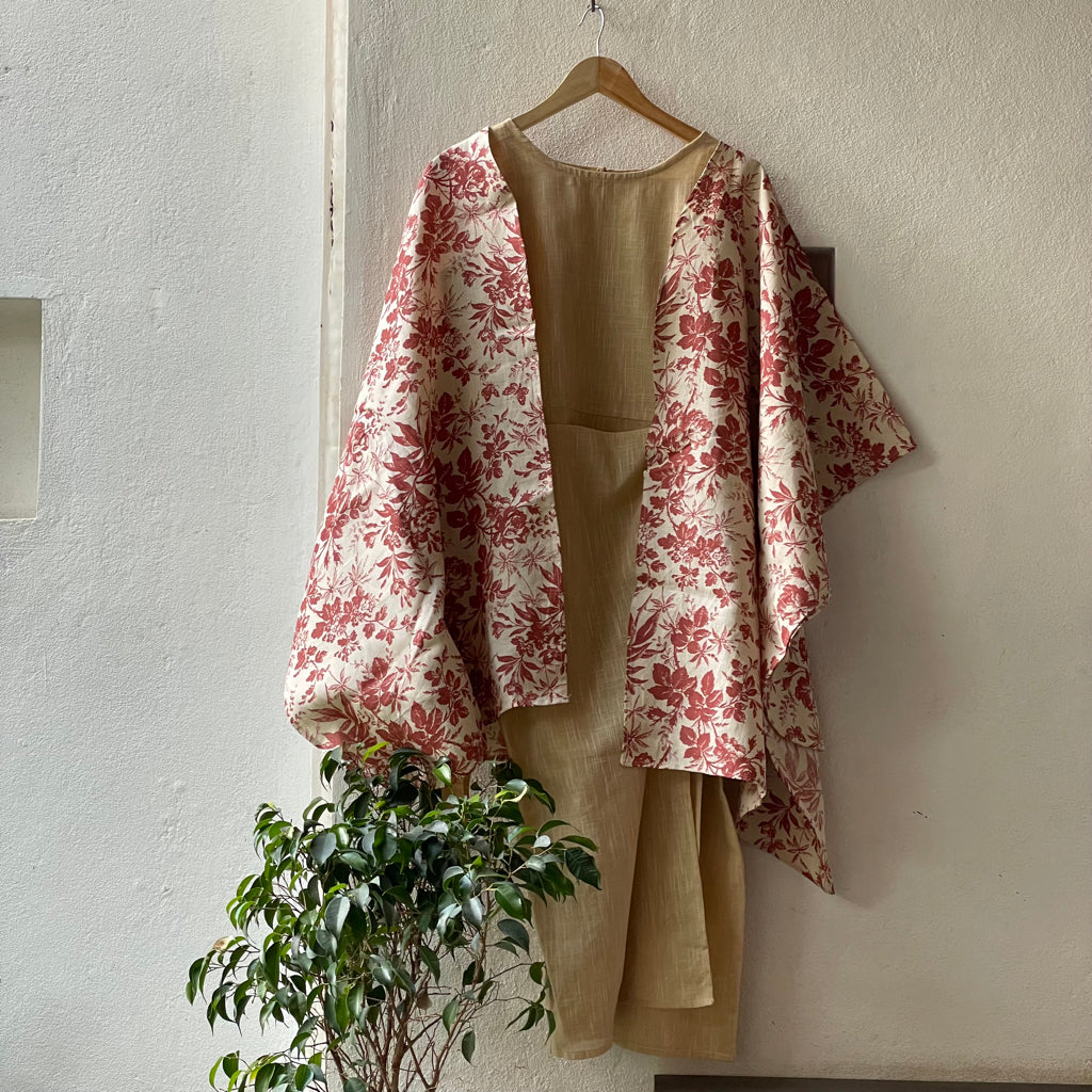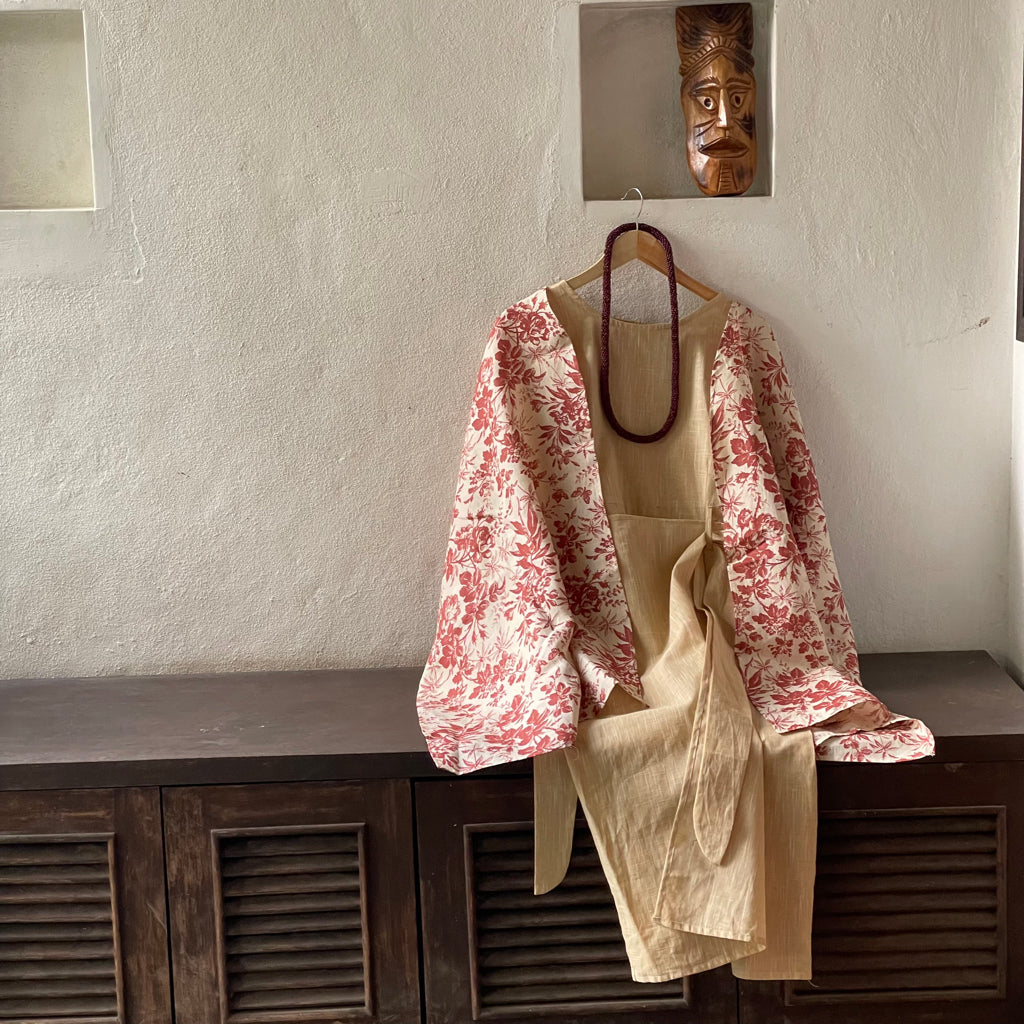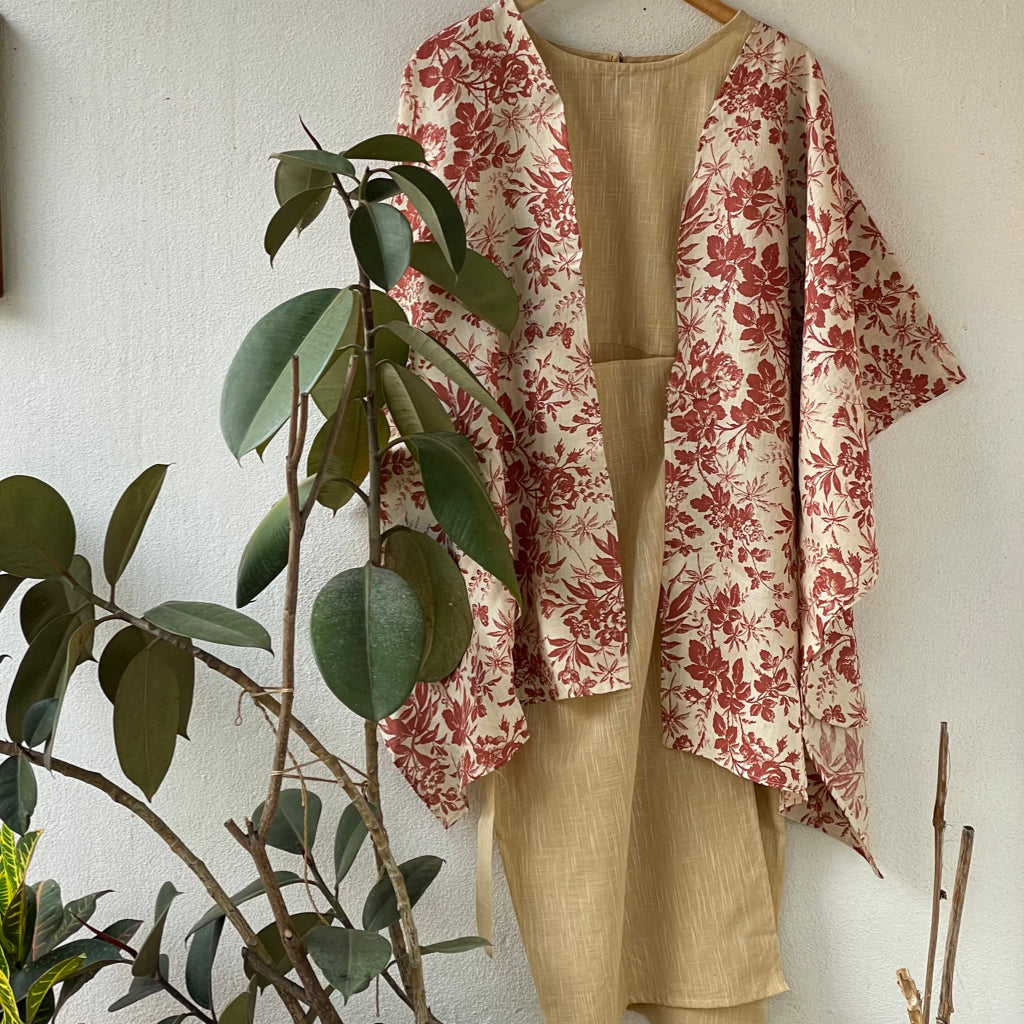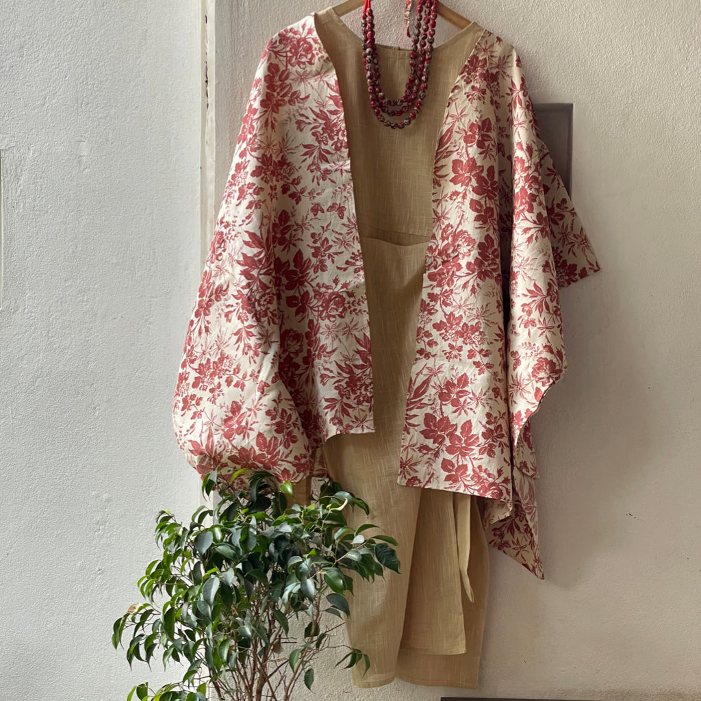 A contemporary boho linen floral shrug in a neutral tone would pair beautifully with high-waisted denim, a flowy maxi dress, or even a simple tank and trousers sounds like a perfect blend of relaxed elegance and earthy style. The floral detail adds just the right touch of femininity, while the linen keeps it breathable and laid-back. Try this for a daytime wear to a safari or any tropical holiday, club it with a cane hat.
