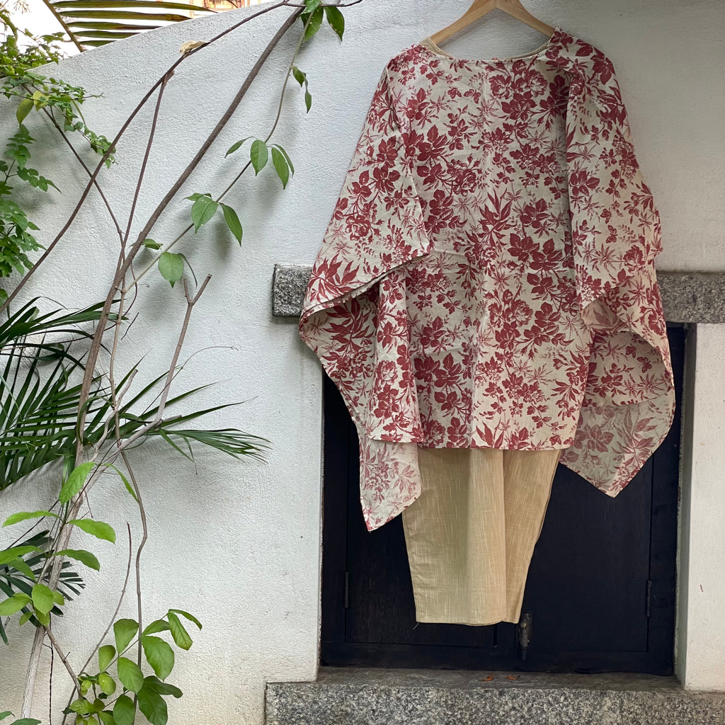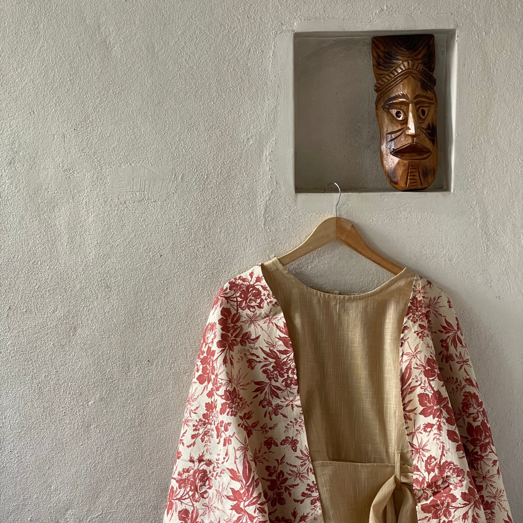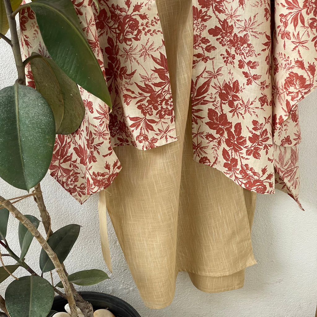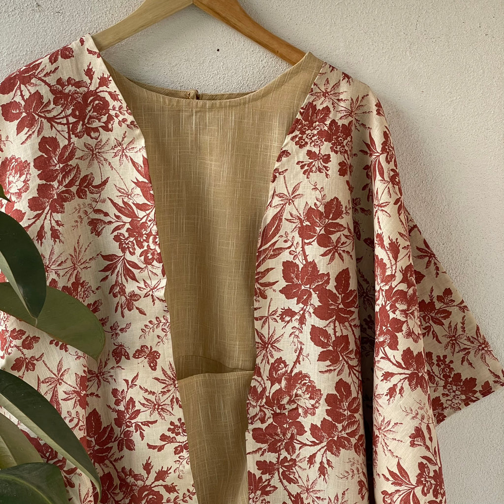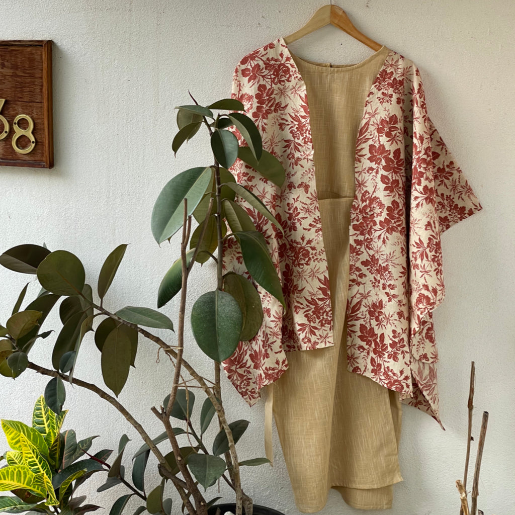 A contemporary boho linen floral shrug in a neutral tone would pair beautifully with high-waisted denim, a flowy maxi dress, or even a simple tank and trousers sounds like a perfect blend of relaxed elegance and earthy style. The floral detail adds just the right touch of femininity, while the linen keeps it breathable and laid-back. Try this for a daytime wear to a safari or any tropical holiday, club it with a cane hat.