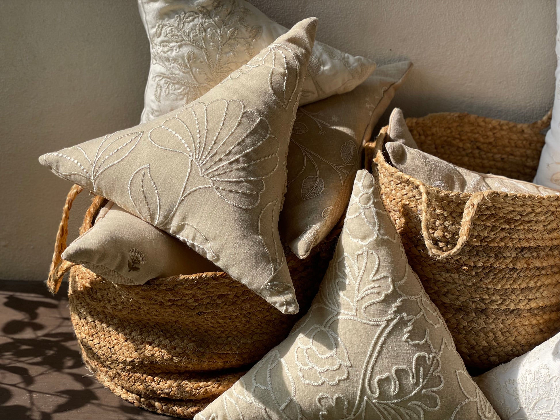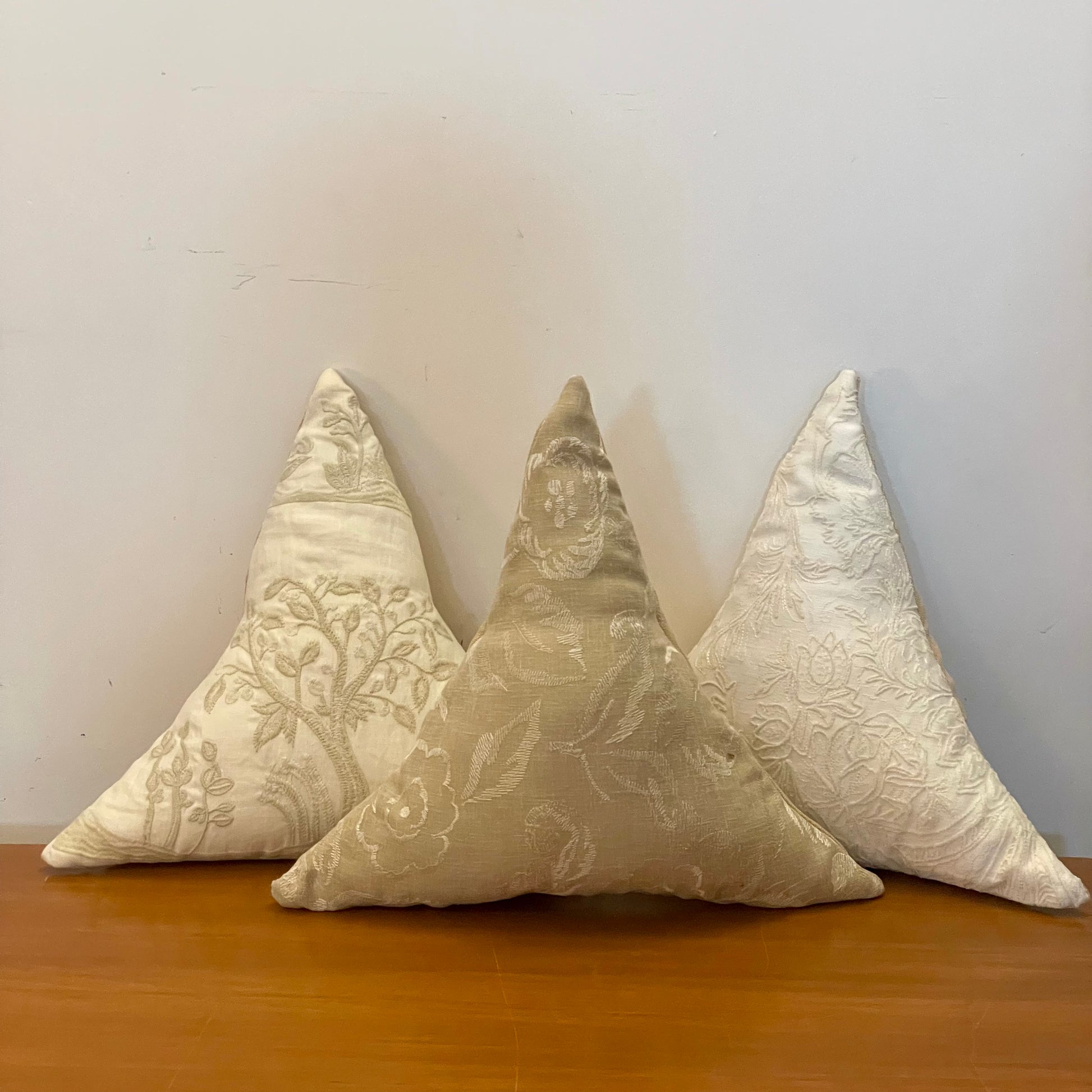 Create a cozy look with these triangle cushions. White-on-white embroidery on a cushion brings an unparalleled sense of elegance, sophistication, and timeless beauty to interiors. It blends subtle luxury with delicate craftsmanship, making it a perfect addition to any space. White-on-white embroidery exudes tranquility and calmness, perfect for bedrooms, lounges, or reading nooks. Creates a soothing and cozy environment while maintaining a crisp, polished look. Layer embroidered cushions with textured fabrics like linen, lace, or silk for added depth. Pairs with neutral or pastel shades to maintain a soft, luxurious aesthetic. Can be placed on beds, sofas, or accent chairs for a touch of sophistication. Complements a wide range of decor styles, including French country, Victorian, Scandinavian, and modern minimalism. The monochromatic embroidery creates a refined, elegant look without being overpowering. It adds texture and depth to the cushion, making it a statement of quiet opulence.
