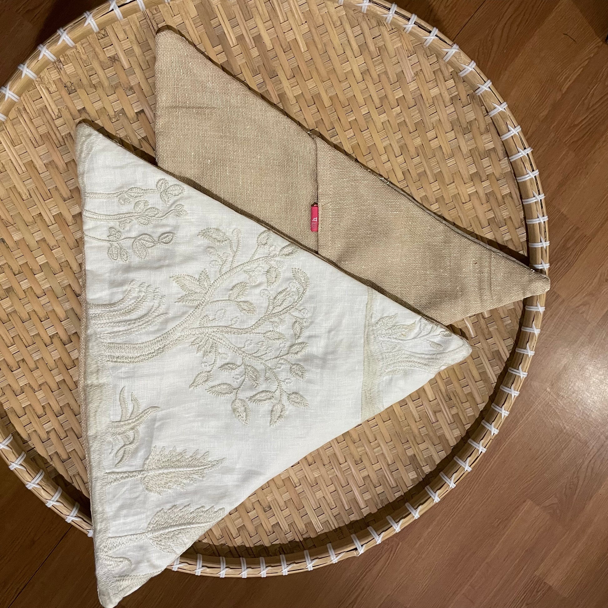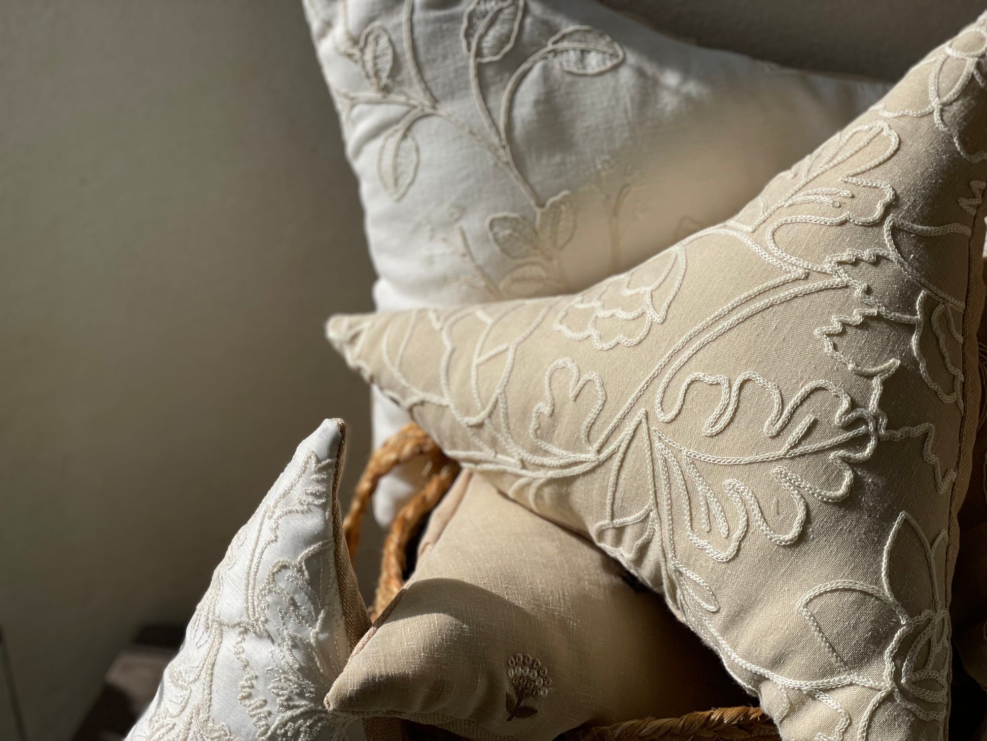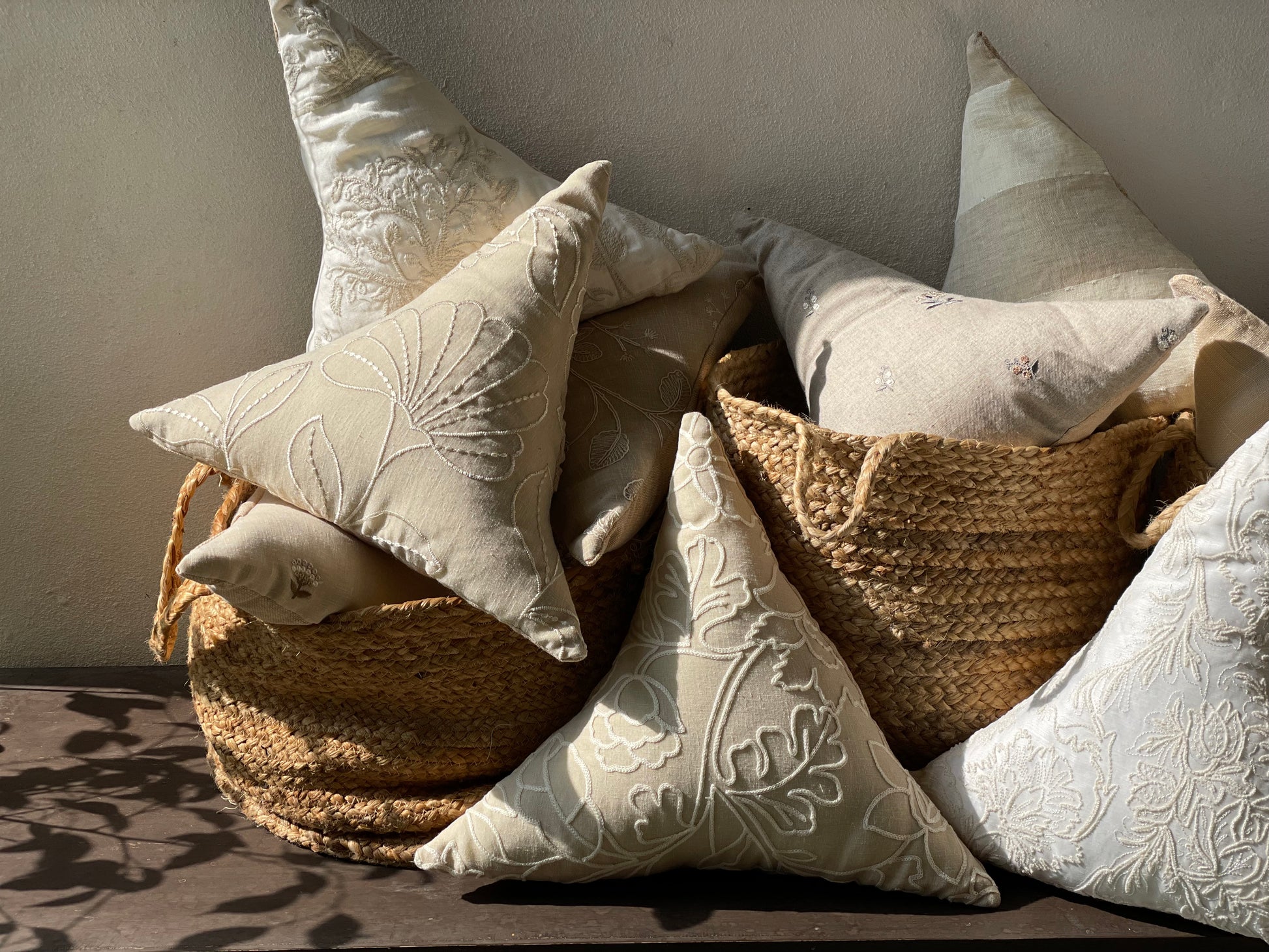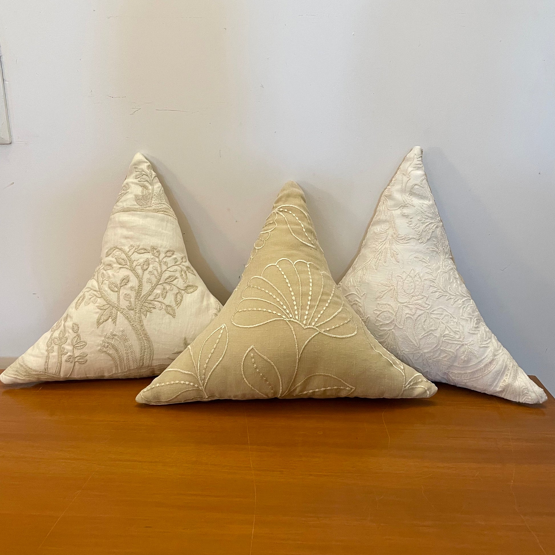 Create a cozy look with these triangle cushions. White-on-white embroidery on a cushion brings an unparalleled sense of elegance, sophistication, and timeless beauty to interiors. It blends subtle luxury with delicate craftsmanship, making it a perfect addition to any space. White-on-white embroidery exudes tranquility and calmness, perfect for bedrooms, lounges, or reading nooks. Creates a soothing and cozy environment while maintaining a crisp, polished look. Layer embroidered cushions with textured fabrics like linen, lace, or silk for added depth. Pairs with neutral or pastel shades to maintain a soft, luxurious aesthetic. Can be placed on beds, sofas, or accent chairs for a touch of sophistication. Complements a wide range of decor styles, including French country, Victorian, Scandinavian, and modern minimalism. The monochromatic embroidery creates a refined, elegant look without being overpowering. It adds texture and depth to the cushion, making it a statement of quiet opulence.