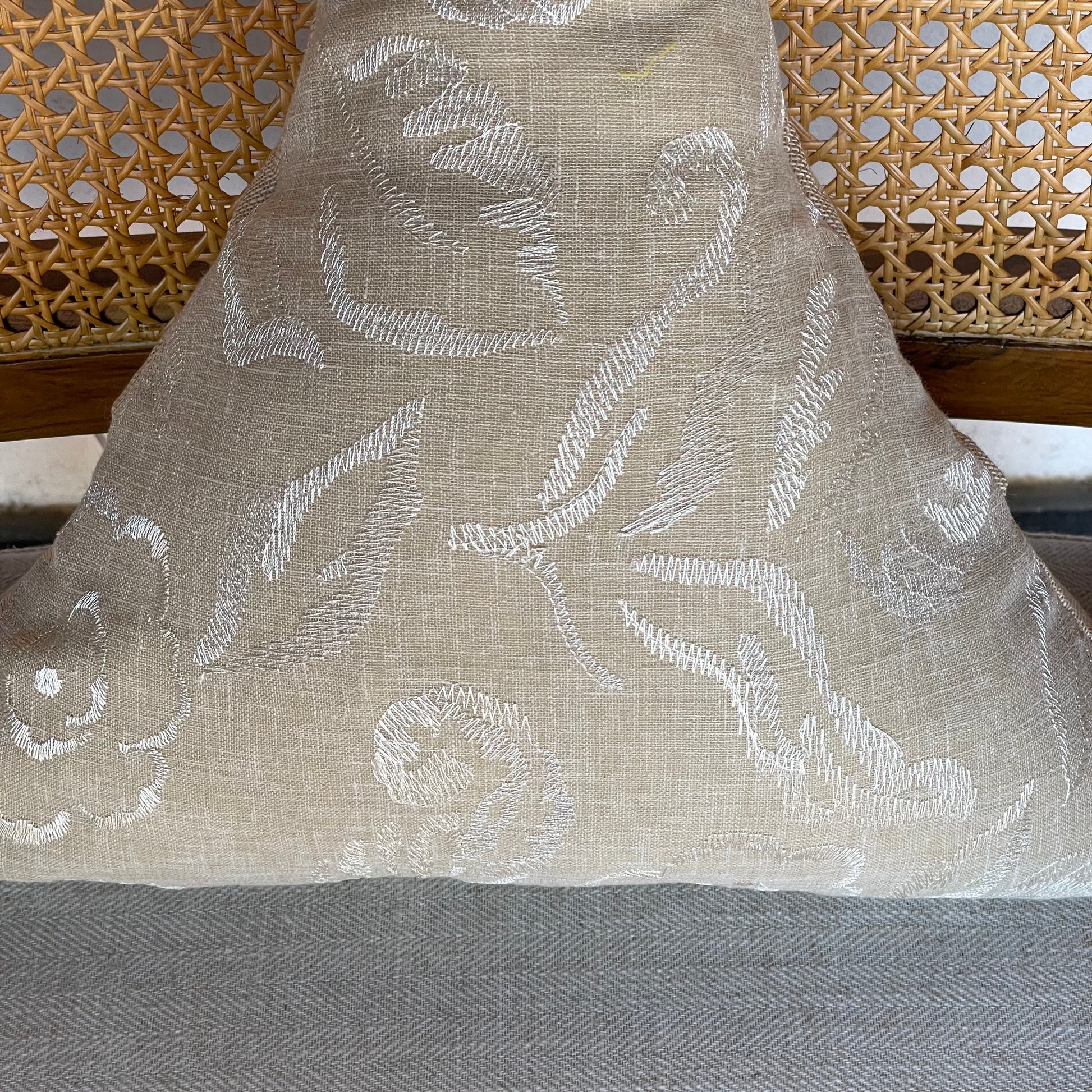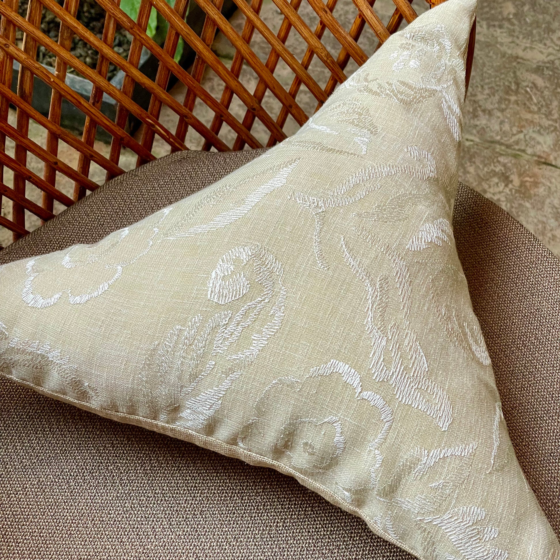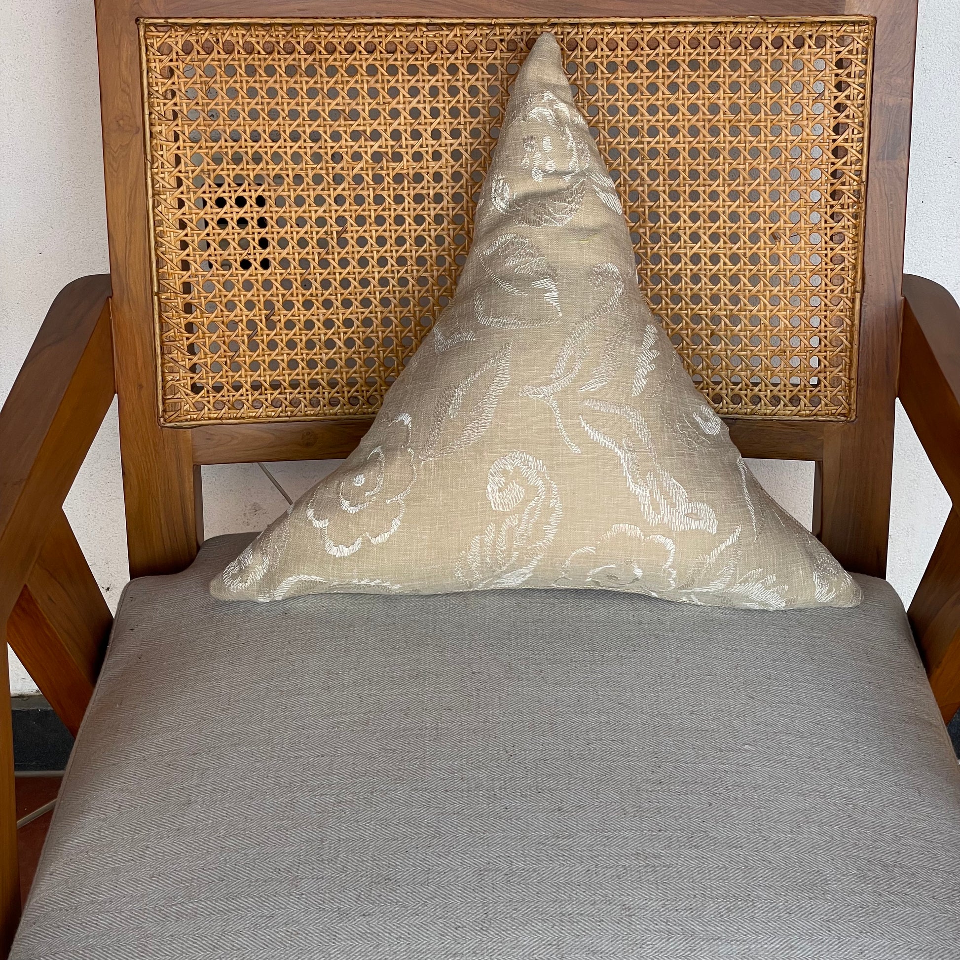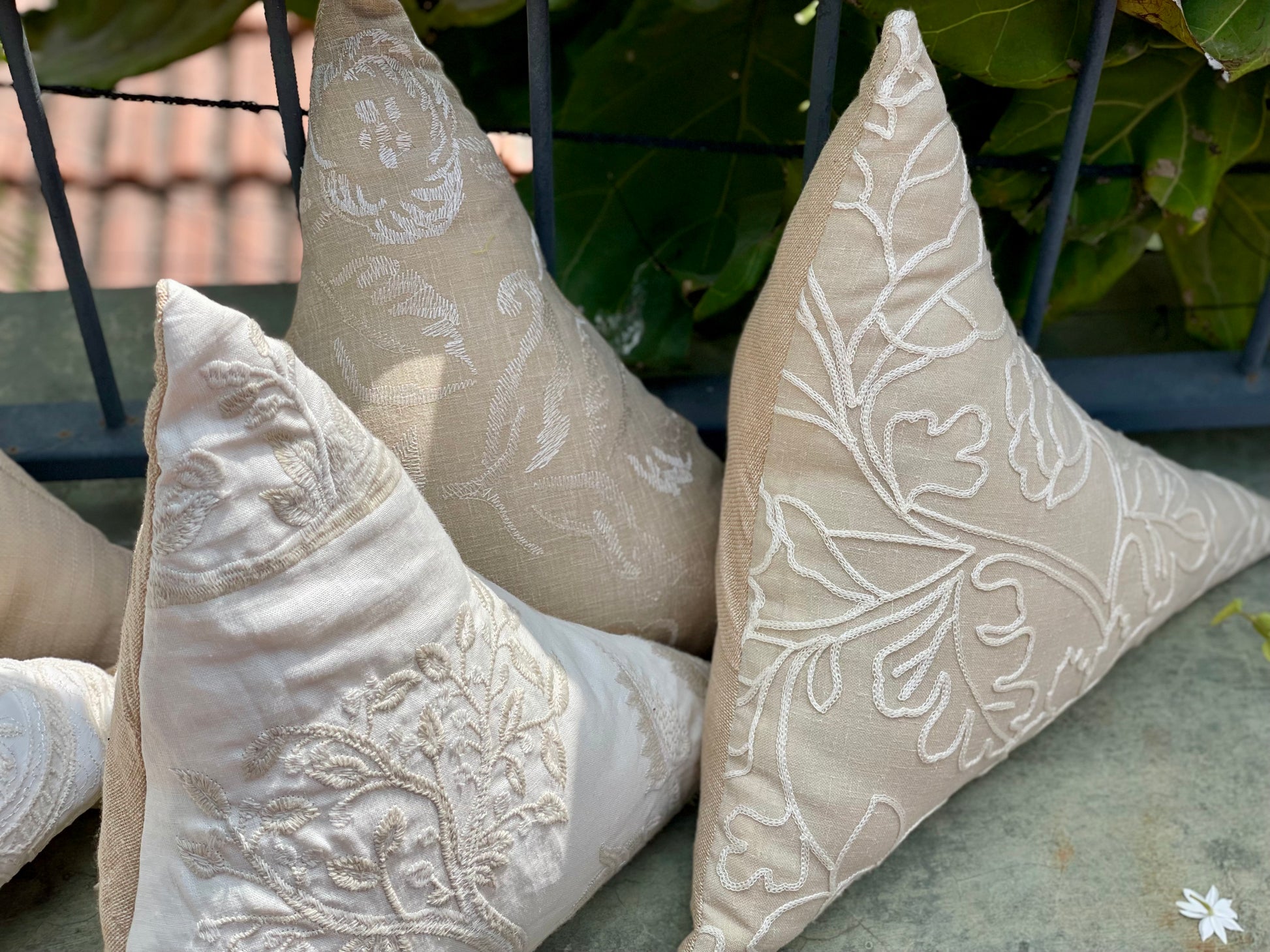 Create a cozy look with these triangle cushions. White-on-white embroidery on a cushion brings an unparalleled sense of elegance, sophistication, and timeless beauty to interiors. It blends subtle luxury with delicate craftsmanship, making it a perfect addition to any space. White-on-white embroidery exudes tranquility and calmness, perfect for bedrooms, lounges, or reading nooks. Creates a soothing and cozy environment while maintaining a crisp, polished look. Layer embroidered cushions with textured fabrics like linen, lace, or silk for added depth. Pairs with neutral or pastel shades to maintain a soft, luxurious aesthetic. Can be placed on beds, sofas, or accent chairs for a touch of sophistication. Complements a wide range of decor styles, including French country, Victorian, Scandinavian, and modern minimalism. The monochromatic embroidery creates a refined, elegant look without being overpowering. It adds texture and depth to the cushion, making it a statement of quiet opulence.