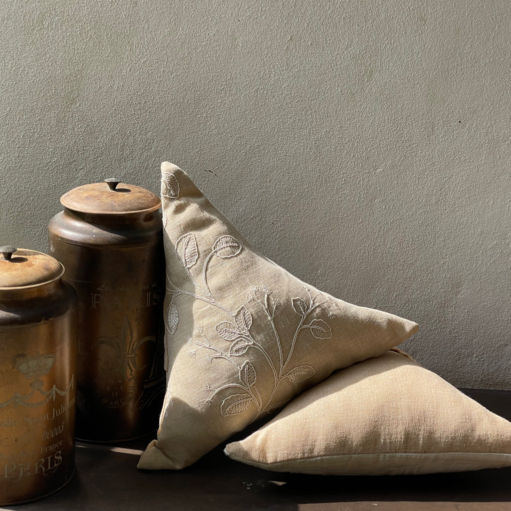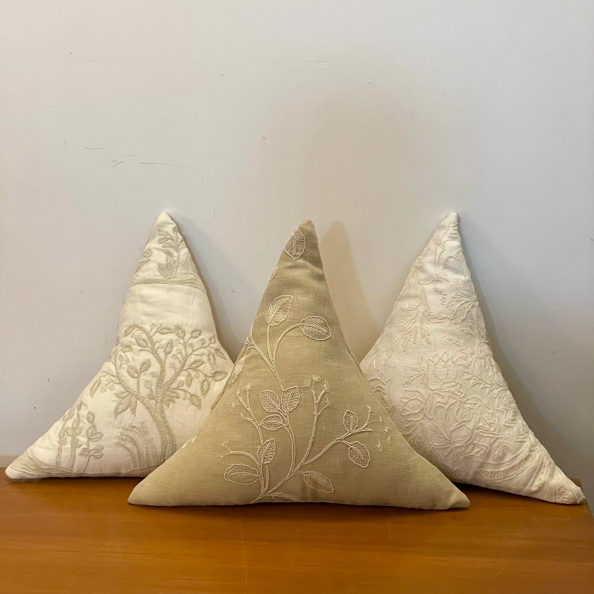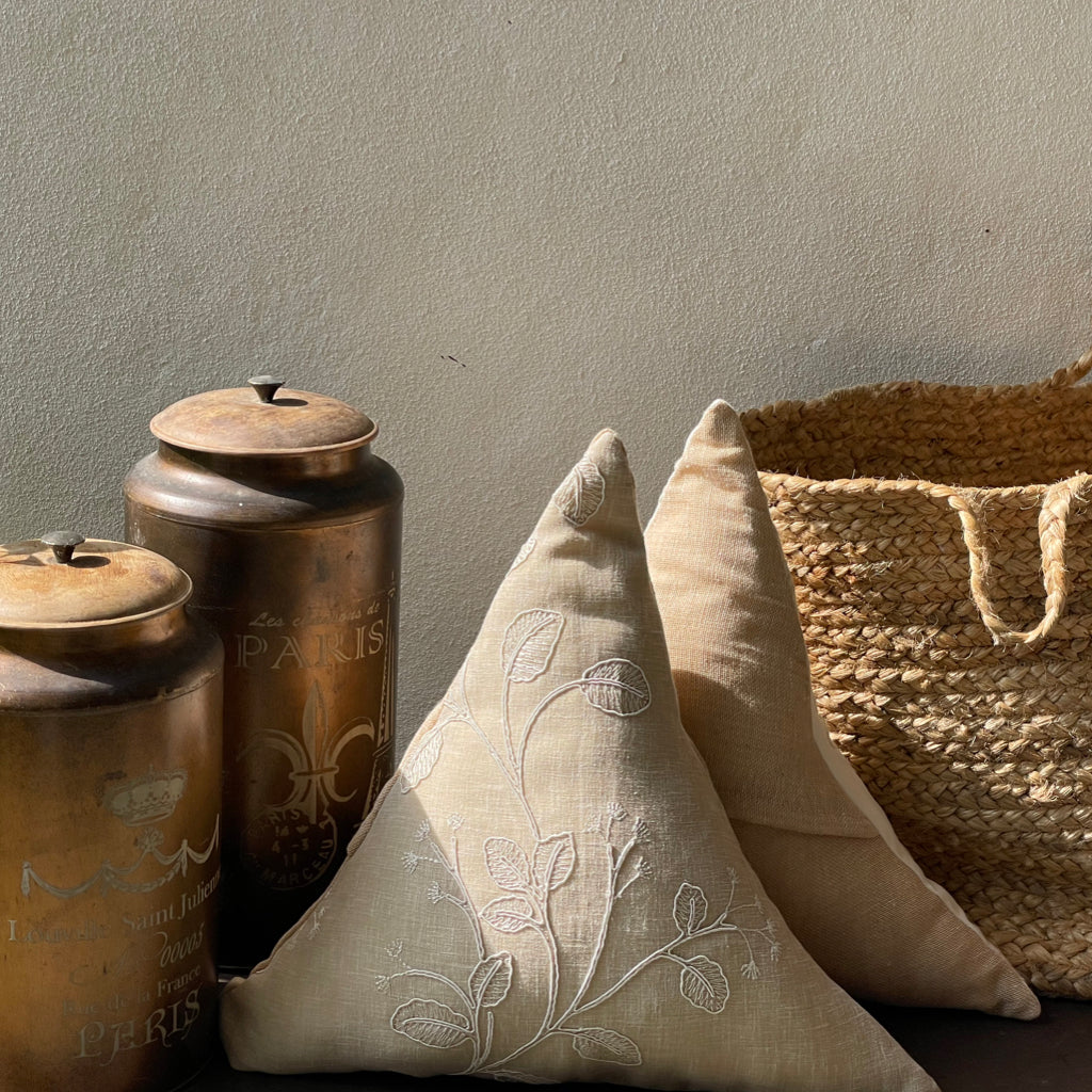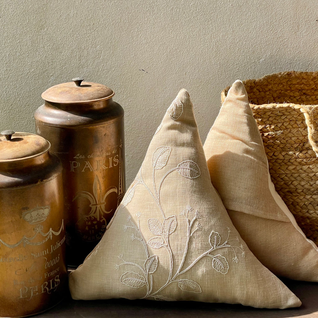 Create a cozy look with these triangle cushions. White-on-white embroidery on a cushion brings an unparalleled sense of elegance, sophistication, and timeless beauty to interiors. It blends subtle luxury with delicate craftsmanship, making it a perfect addition to any space. White-on-white embroidery exudes tranquility and calmness, perfect for bedrooms, lounges, or reading nooks. Creates a soothing and cozy environment while maintaining a crisp, polished look. Layer embroidered cushions with textured fabrics like linen, lace, or silk for added depth. Pairs with neutral or pastel shades to maintain a soft, luxurious aesthetic. Can be placed on beds, sofas, or accent chairs for a touch of sophistication. Complements a wide range of decor styles, including French country, Victorian, Scandinavian, and modern minimalism. The monochromatic embroidery creates a refined, elegant look without being overpowering. It adds texture and depth to the cushion, making it a statement of quiet opulence.