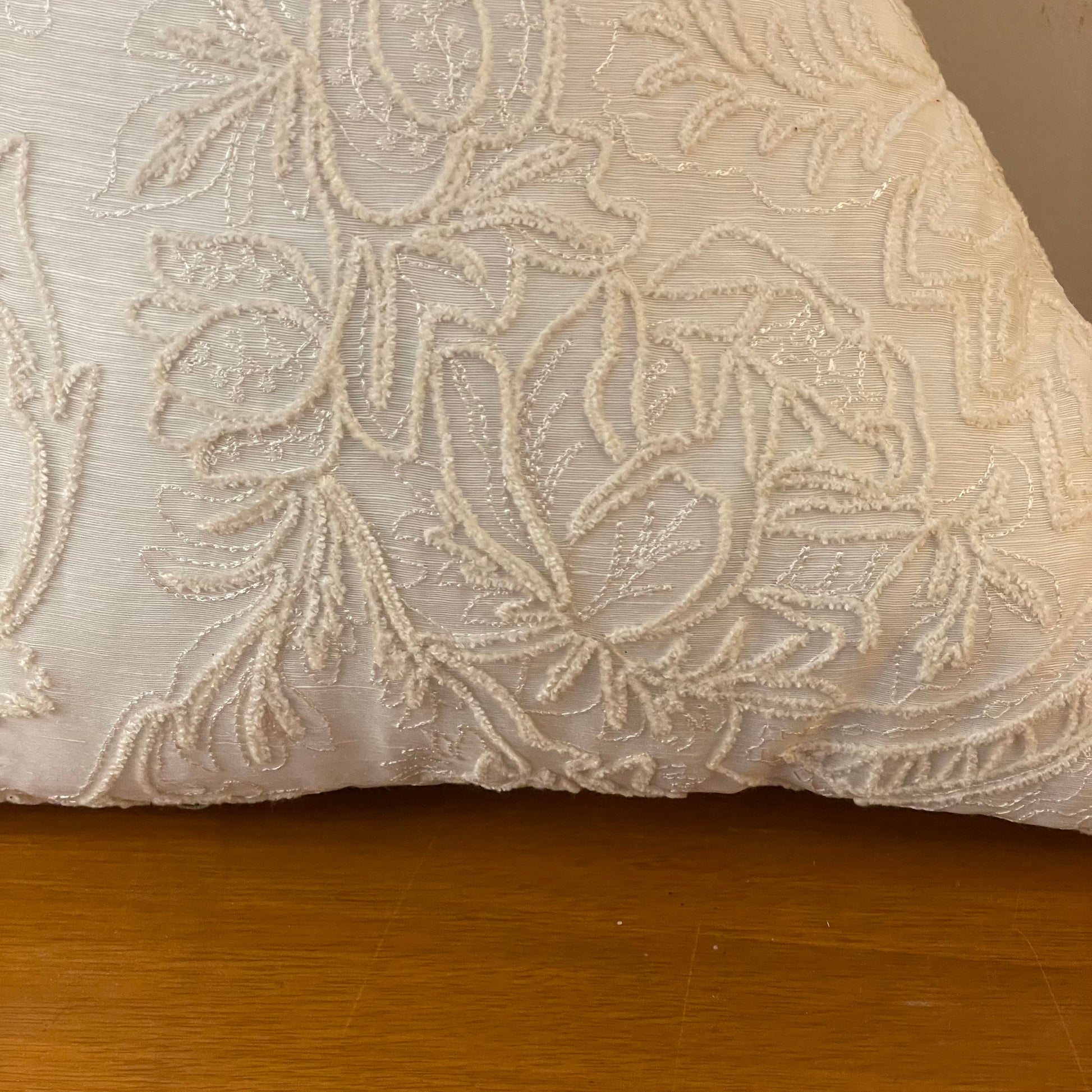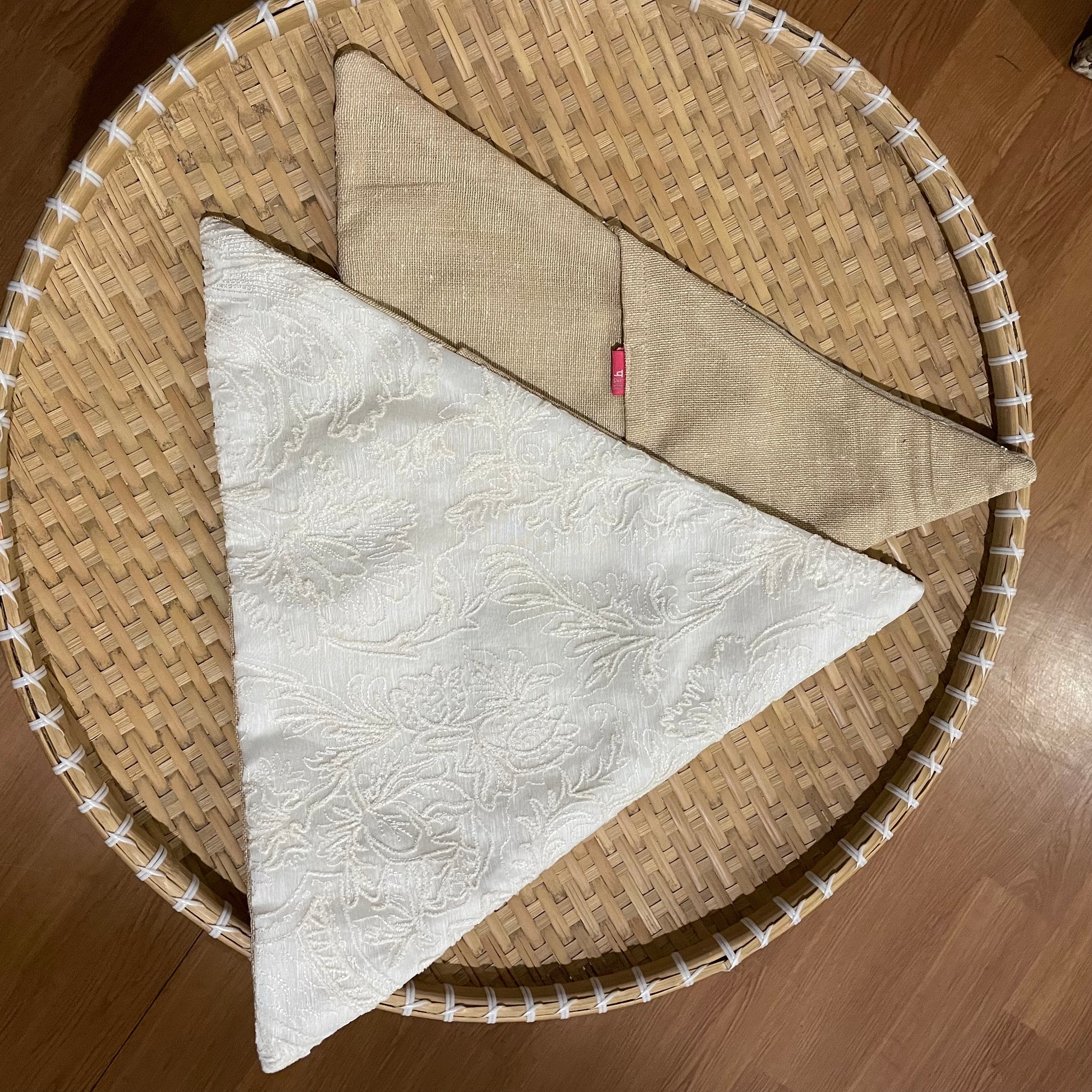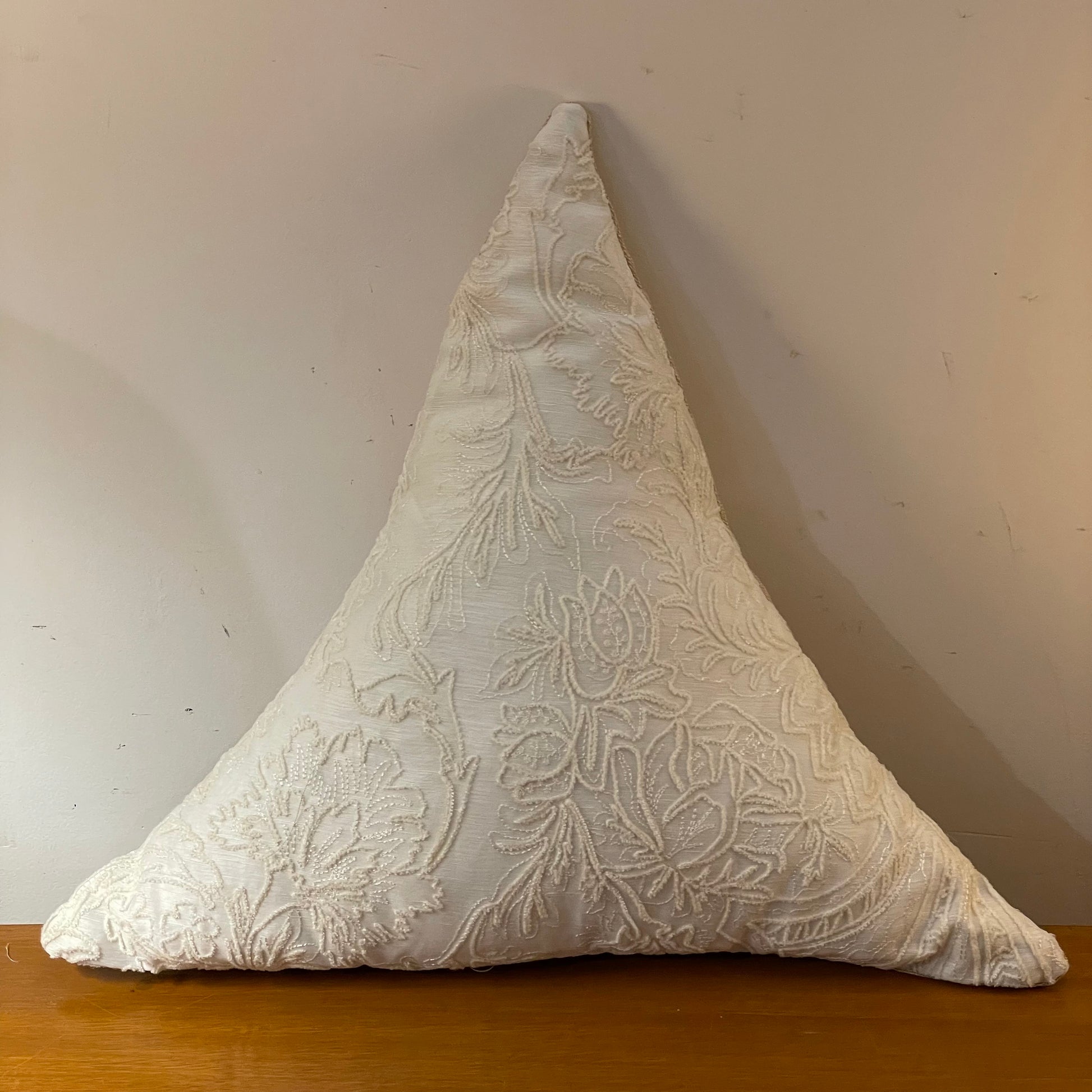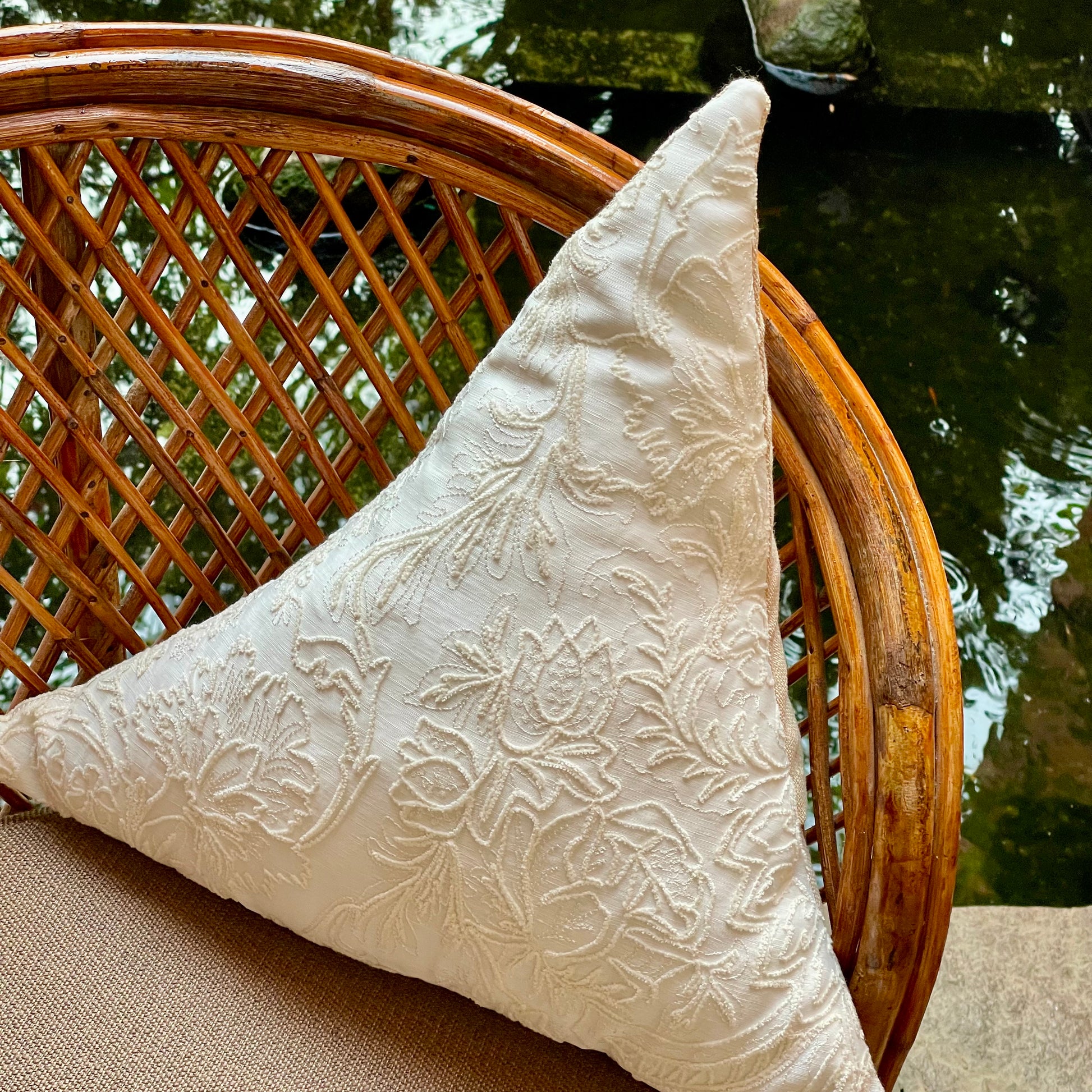 Create a cozy look with these triangle cushions. White-on-white embroidery on a cushion brings an unparalleled sense of elegance, sophistication, and timeless beauty to interiors. It blends subtle luxury with delicate craftsmanship, making it a perfect addition to any space. White-on-white embroidery exudes tranquility and calmness, perfect for bedrooms, lounges, or reading nooks. Creates a soothing and cozy environment while maintaining a crisp, polished look. Layer embroidered cushions with textured fabrics like linen, lace, or silk for added depth. Pairs with neutral or pastel shades to maintain a soft, luxurious aesthetic. Can be placed on beds, sofas, or accent chairs for a touch of sophistication. Complements a wide range of decor styles, including French country, Victorian, Scandinavian, and modern minimalism. The monochromatic embroidery creates a refined, elegant look without being overpowering. It adds texture and depth to the cushion, making it a statement of quiet opulence. Comes with Filler.