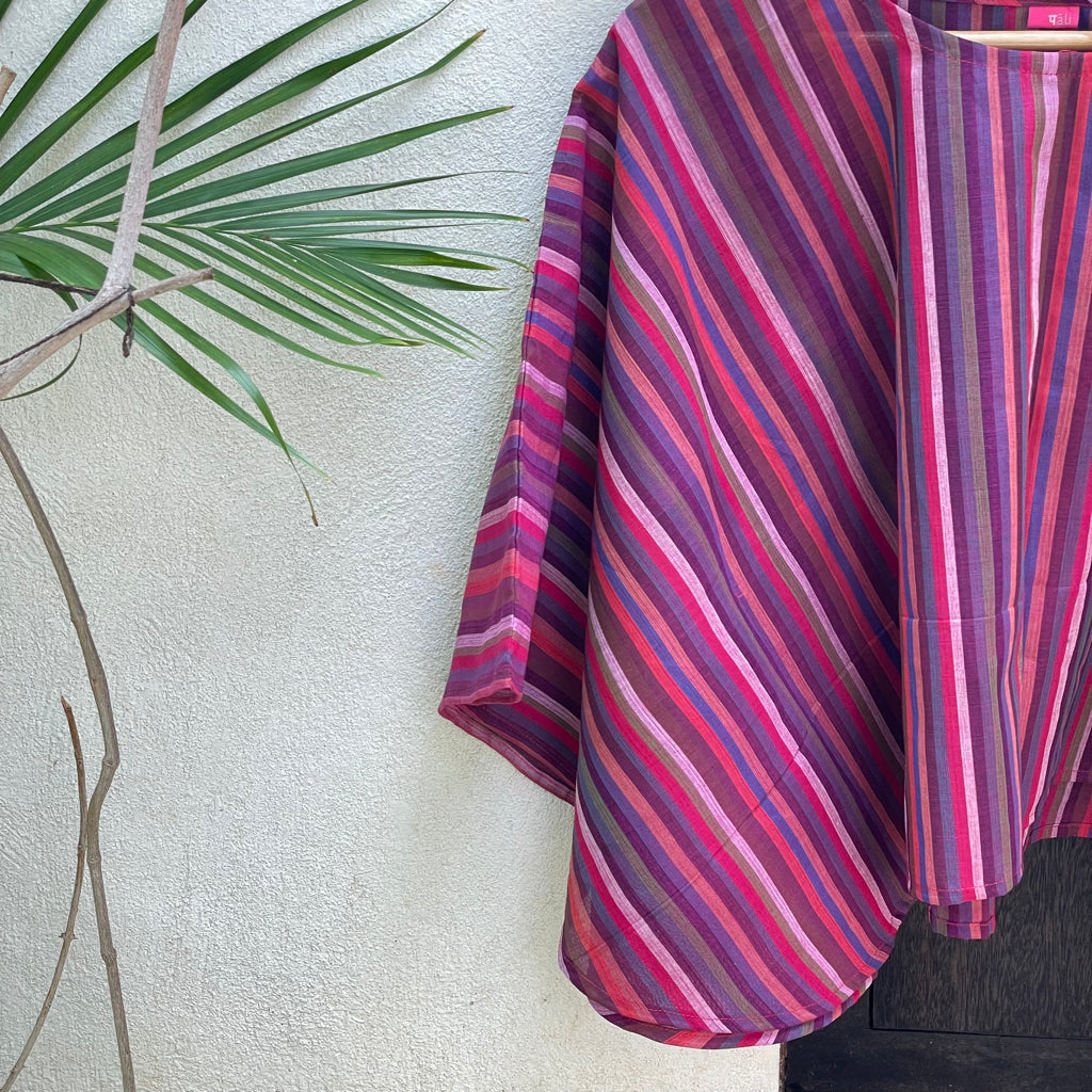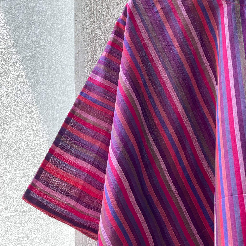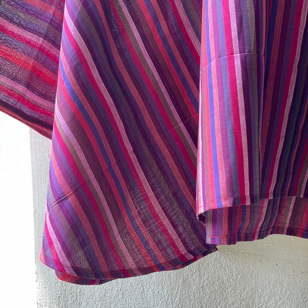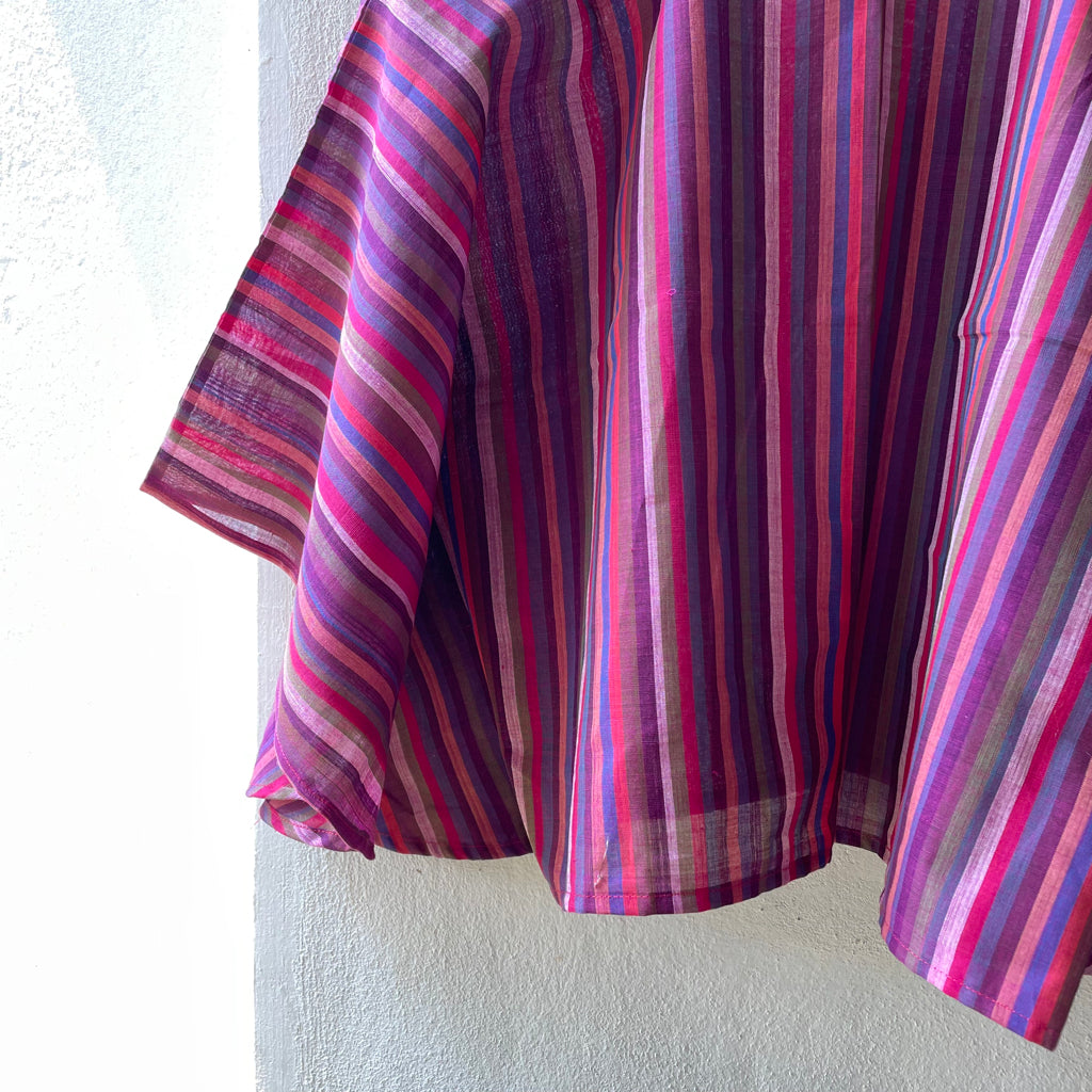The fresh palette of the stripes here remind us of the Tulip fields of Holland. These breezy cotton summer tops offer a perfect blend of comfort and style, ideal for warm weather. Made from handwoven Mangalgiri striped fabric from Andhra Pradesh, these tops feature breathable, durable, and soft pure cotton. The contemporary cuts combine traditional craftsmanship with modern fashion. Mangalgiri fabric’s tightly woven structure provides a smooth texture, minimal ironing, and excellent shape retention. These stylish pieces are great for casual outings, beaches, or resort wear. Size: Free size ( 43 inches x 20 inches- Horizontal x Vertical )