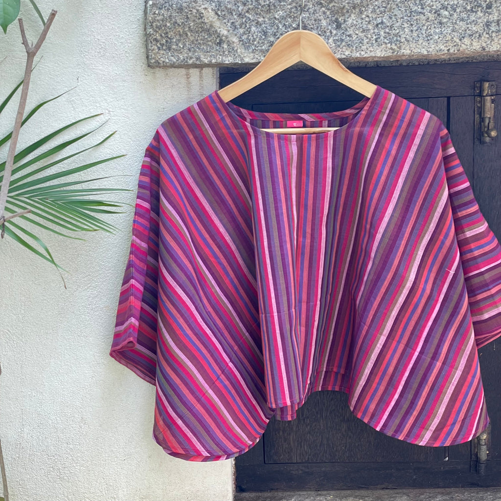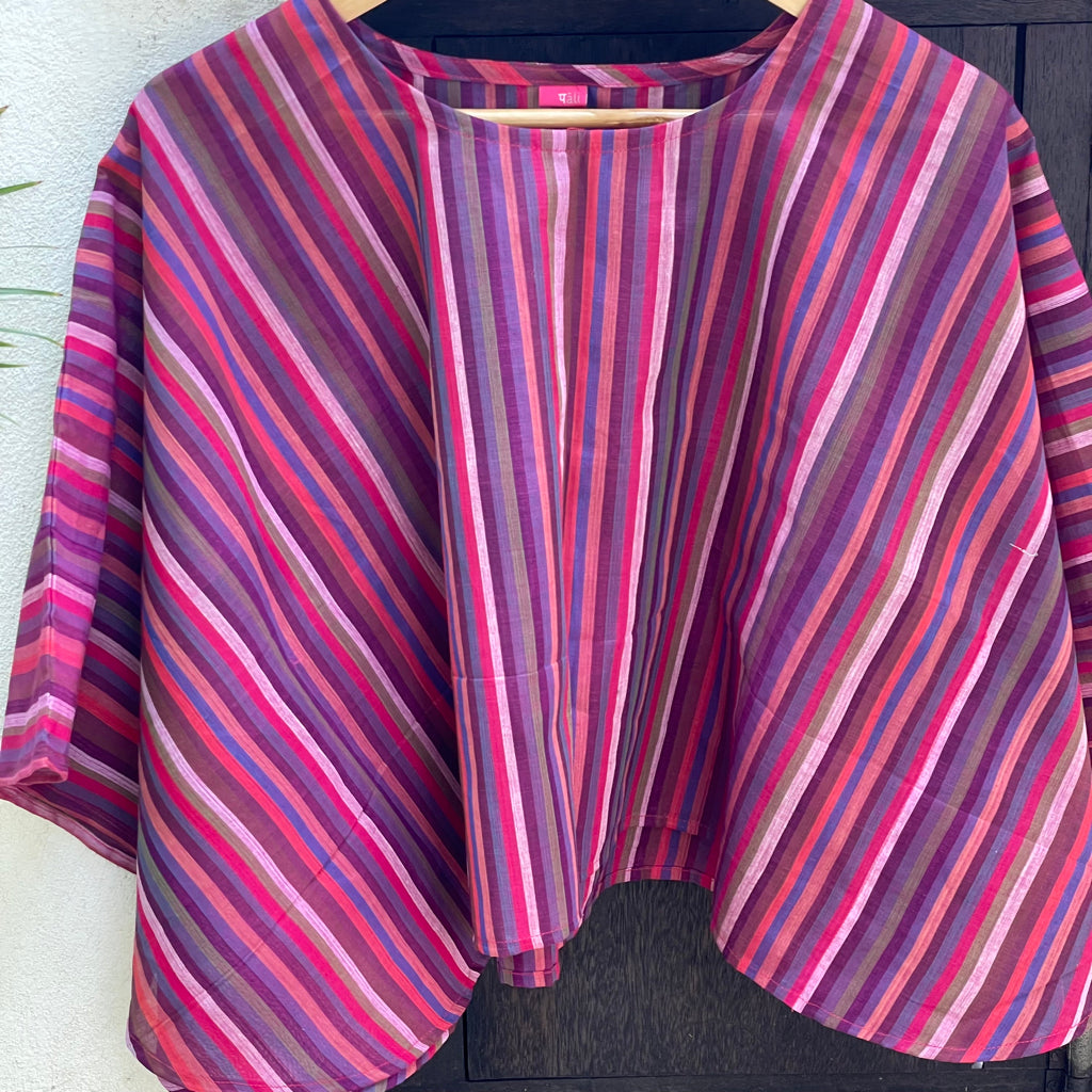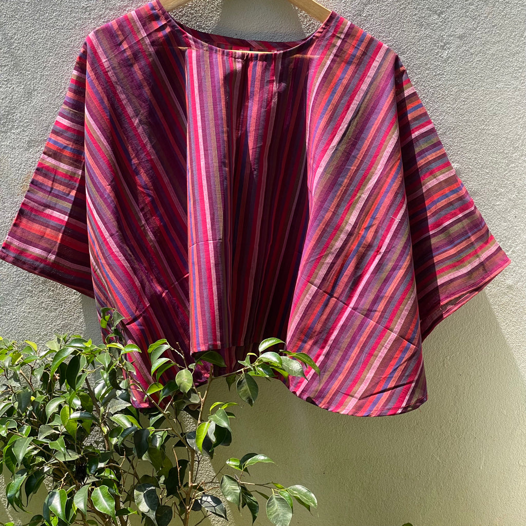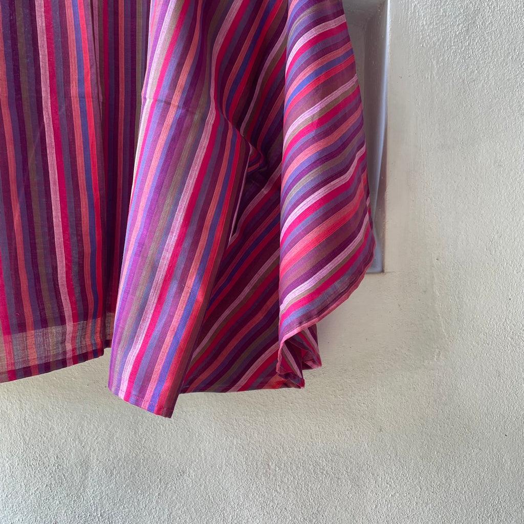 The fresh palette of the stripes here remind us of the Tulip fields of Holland. These breezy cotton summer tops offer a perfect blend of comfort and style, ideal for warm weather. Made from handwoven Mangalgiri striped fabric from Andhra Pradesh, these tops feature breathable, durable, and soft pure cotton. The contemporary cuts combine traditional craftsmanship with modern fashion. Mangalgiri fabric’s tightly woven structure provides a smooth texture, minimal ironing, and excellent shape retention. These stylish pieces are great for casual outings, beaches, or resort wear. Size: Free size ( 43 inches x 20 inches- Horizontal x Vertical )