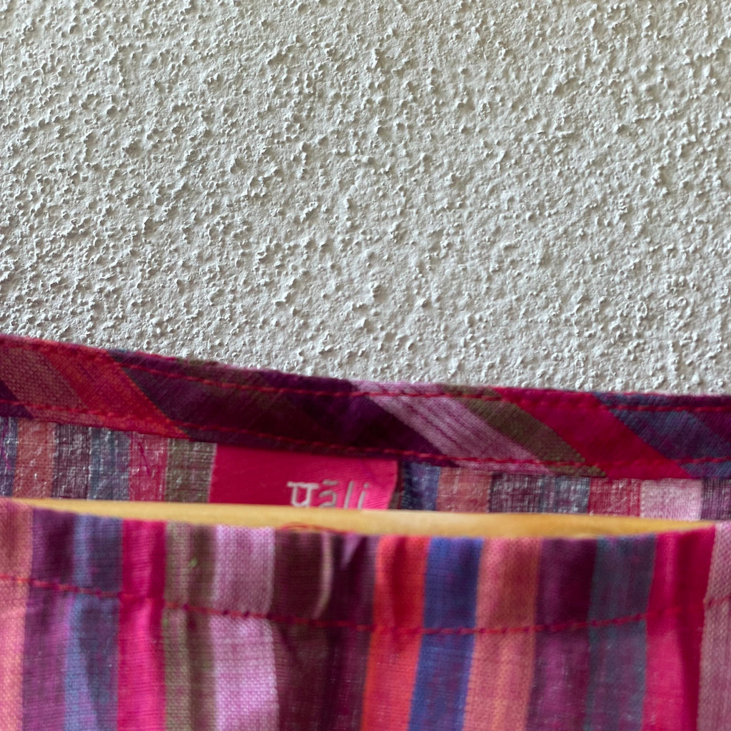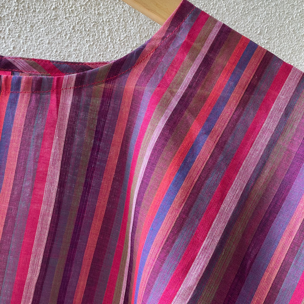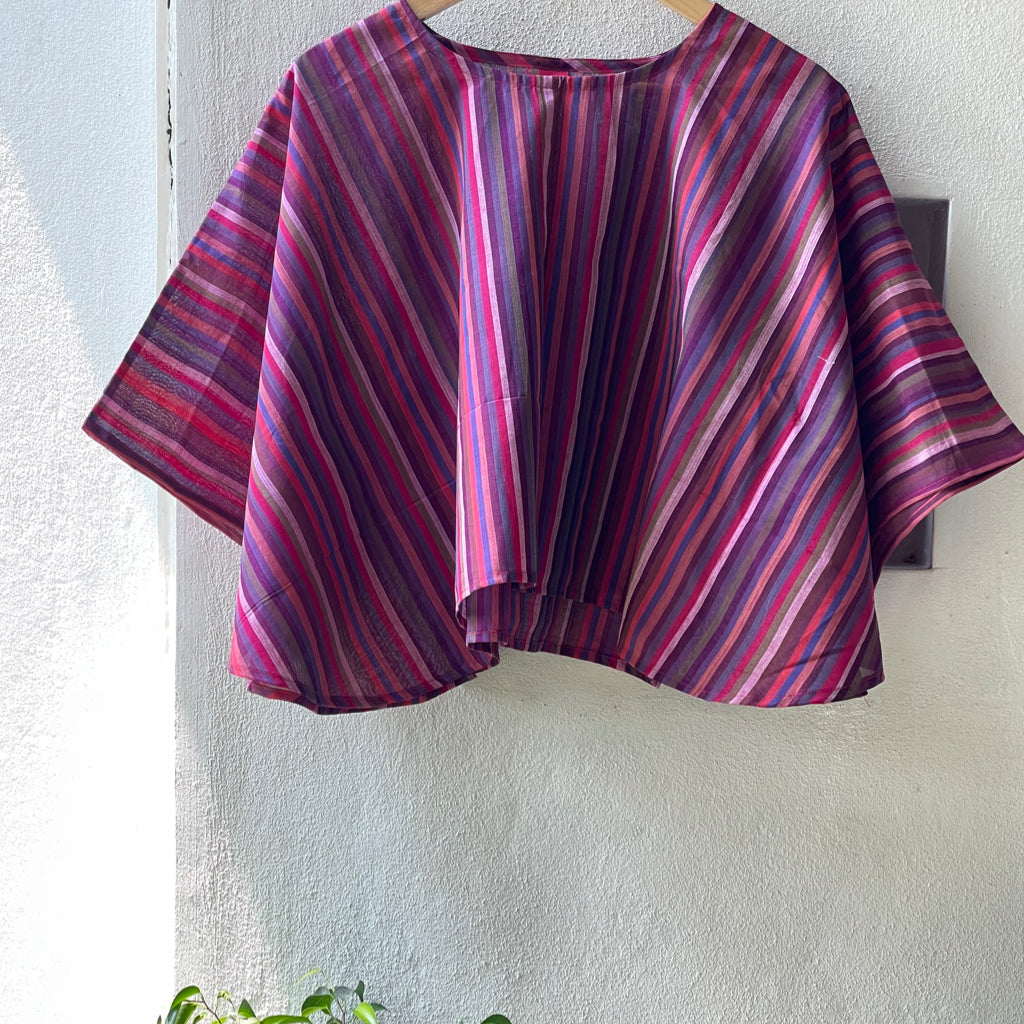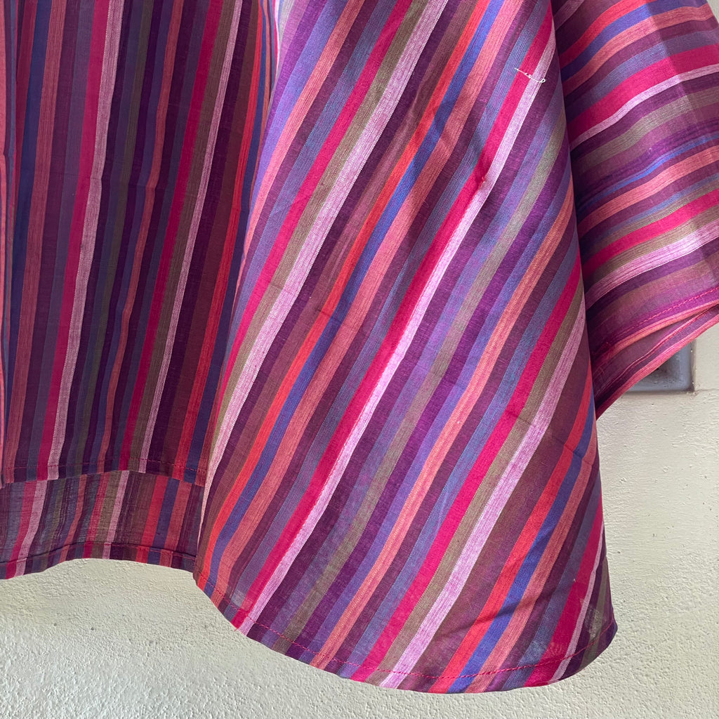 The fresh palette of the stripes here remind us of the Tulip fields of Holland. These breezy cotton summer tops offer a perfect blend of comfort and style, ideal for warm weather. Made from handwoven Mangalgiri striped fabric from Andhra Pradesh, these tops feature breathable, durable, and soft pure cotton. The contemporary cuts combine traditional craftsmanship with modern fashion. Mangalgiri fabric’s tightly woven structure provides a smooth texture, minimal ironing, and excellent shape retention. These stylish pieces are great for casual outings, beaches, or resort wear. Size: Free size ( 43 inches x 20 inches- Horizontal x Vertical )