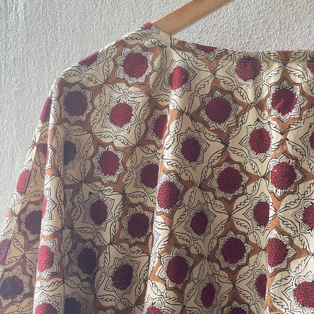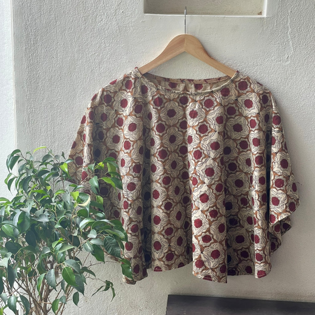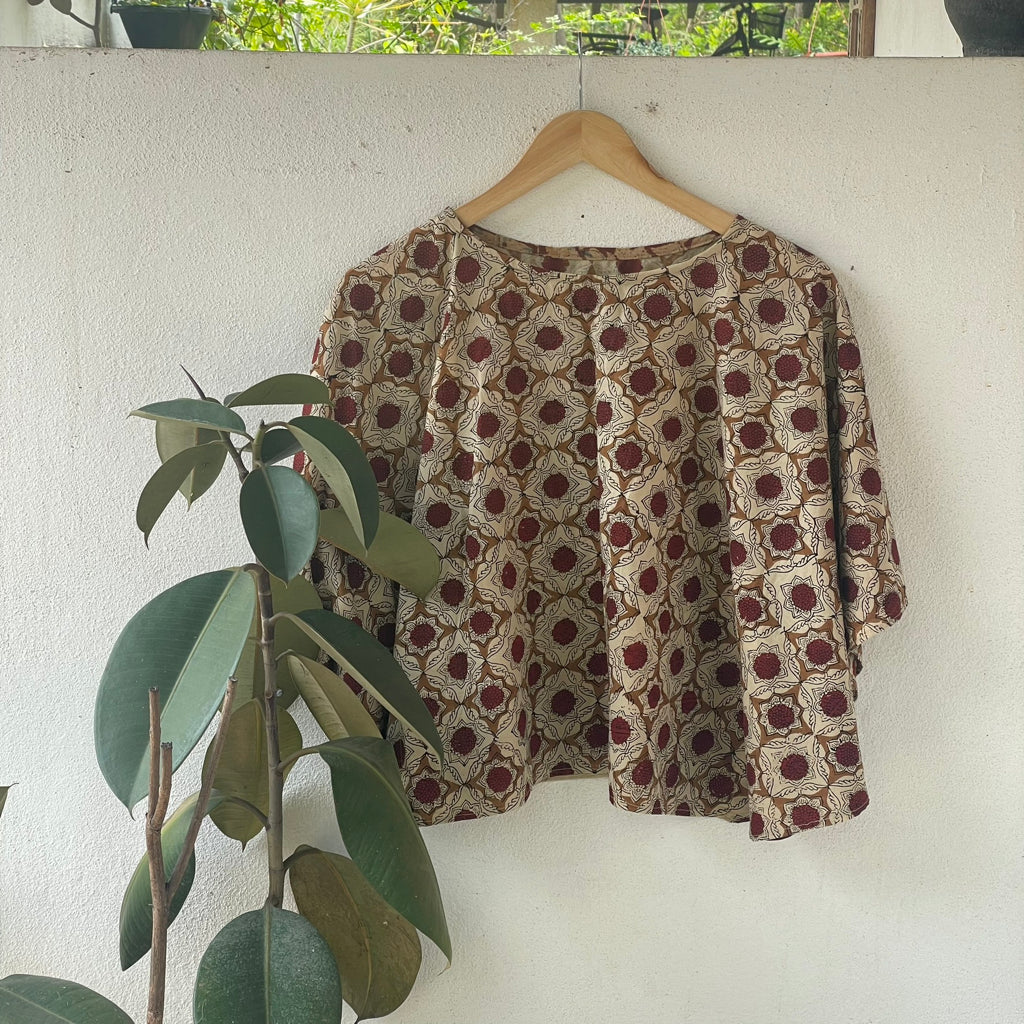 This contemporary silhouette blends traditional block-printed patterns with modern fashion, offering both comfort and style. Crafted from breathable cotton, it is ideal for India’s diverse climates. The charm of block printing lies in its handcrafted imperfections, showcasing the artisanal richness of Indian heritage. This centuries-old technique involves stamping intricate, hand-carved wooden blocks onto fabric, resulting in vibrant, culturally rooted designs. Lightweight and soft, block-printed cotton garments are versatile and comfortable for daily or festive wear. They pair well with skirts, shorts, jeans, or can be draped with a sari for a fresh, ethnic twist. Size: 43 inches x 20 inches ( Horizontal x Vertical )
