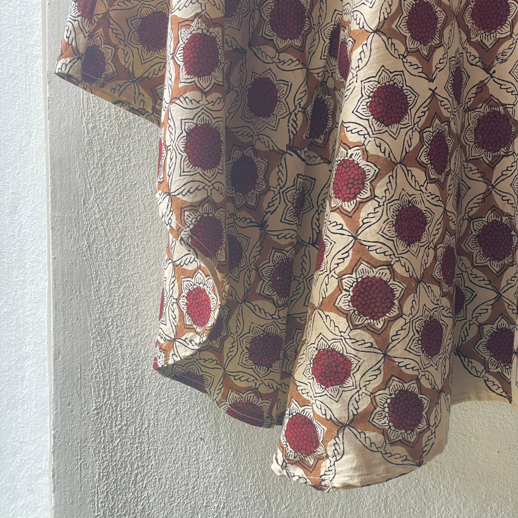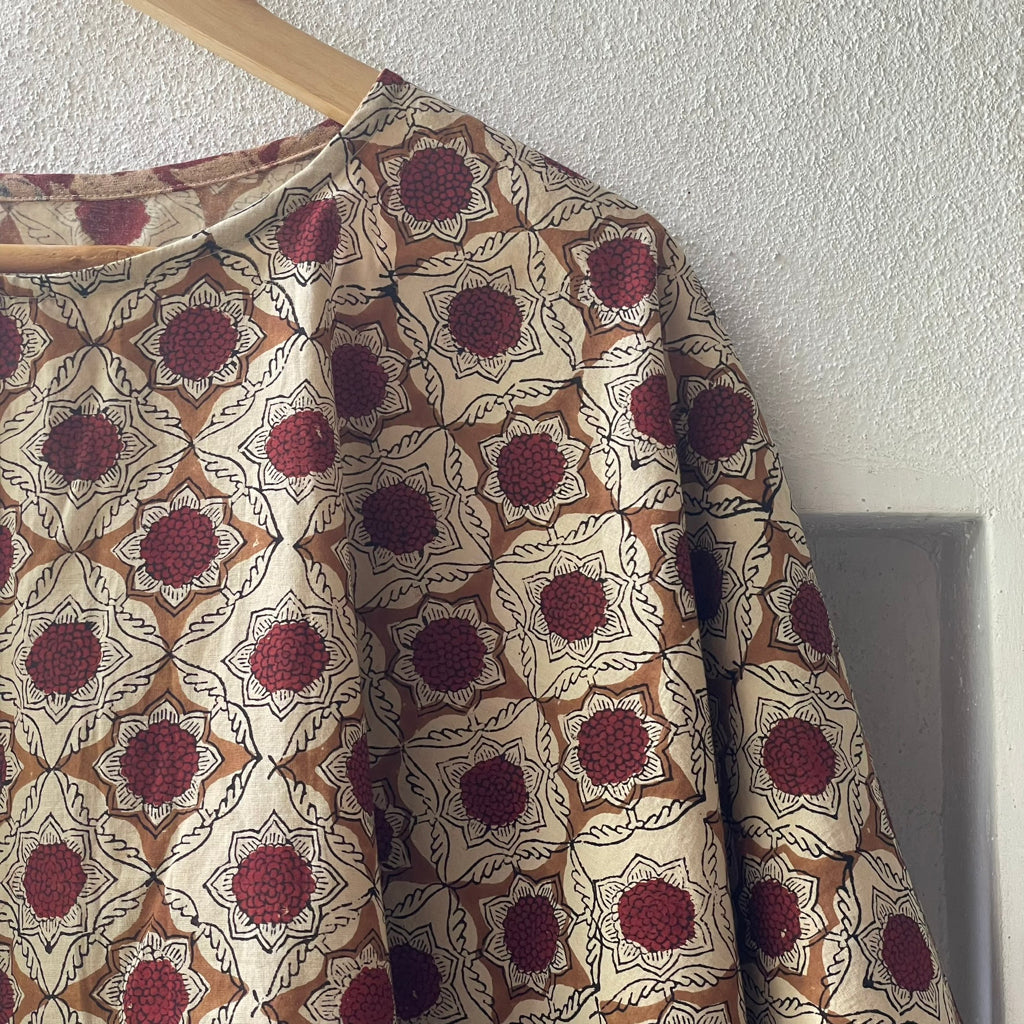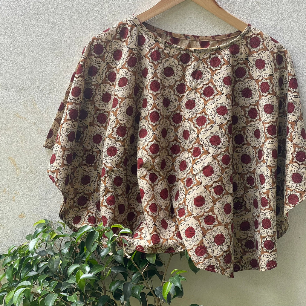 This contemporary silhouette blends traditional block-printed patterns with modern fashion, offering both comfort and style. Crafted from breathable cotton, it is ideal for India’s diverse climates. The charm of block printing lies in its handcrafted imperfections, showcasing the artisanal richness of Indian heritage. This centuries-old technique involves stamping intricate, hand-carved wooden blocks onto fabric, resulting in vibrant, culturally rooted designs. Lightweight and soft, block-printed cotton garments are versatile and comfortable for daily or festive wear. They pair well with skirts, shorts, jeans, or can be draped with a sari for a fresh, ethnic twist. Size: 43 inches x 20 inches ( Horizontal x Vertical )