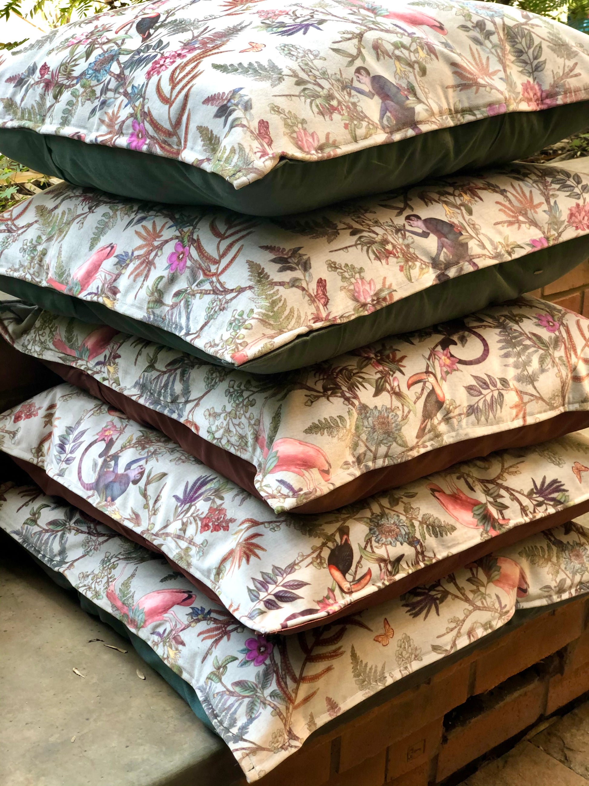 Add a dash of fun, and whimsical touch to your spaces by adding these monkey cushions. A monkey print with a jungle theme on cushions brings a lively, playful, and nature-inspired aesthetic to any space. Monkeys are symbols of mischief, intelligence, and curiosity. It creates a lighthearted and joyful atmosphere, perfect for casual or nature-inspired settings. A jungle-themed design with lush greenery, tropical leaves, and exotic animals can bring a sense of adventure and the wild into the home. Monkeys swinging from trees or interacting with other jungle creatures like parrots, tigers, or elephants can create a storytelling element in the print. In many cultures, monkeys hold deep significance. A monkey print could subtly reflect these cultural influences in a stylish way. Jungle themes, especially with monkeys, often incorporate green, earthy tones, and vibrant tropical colors, creating a calming yet dynamic effect in decor. Perfect for nature lovers who want to bring the outdoors inside.