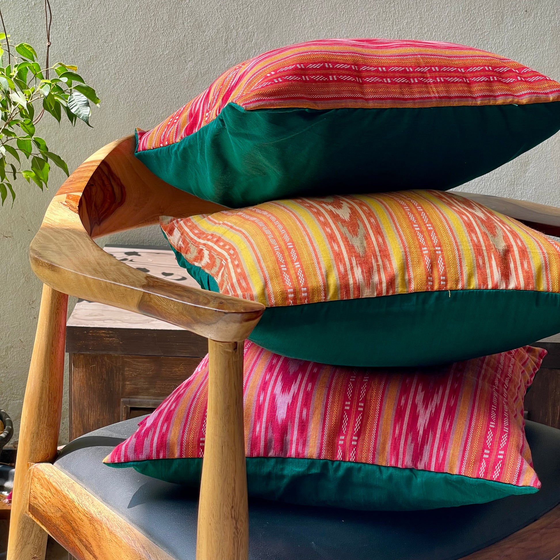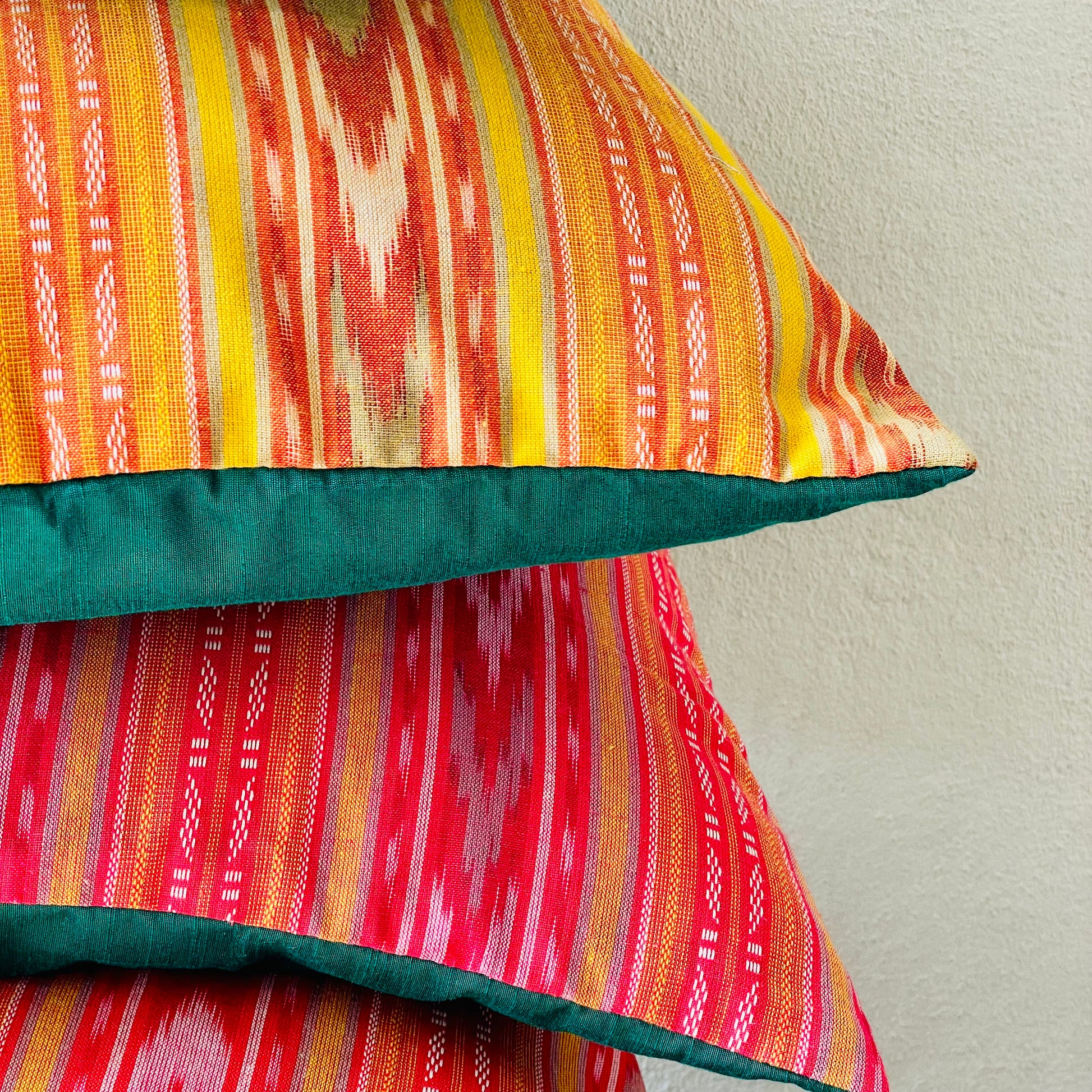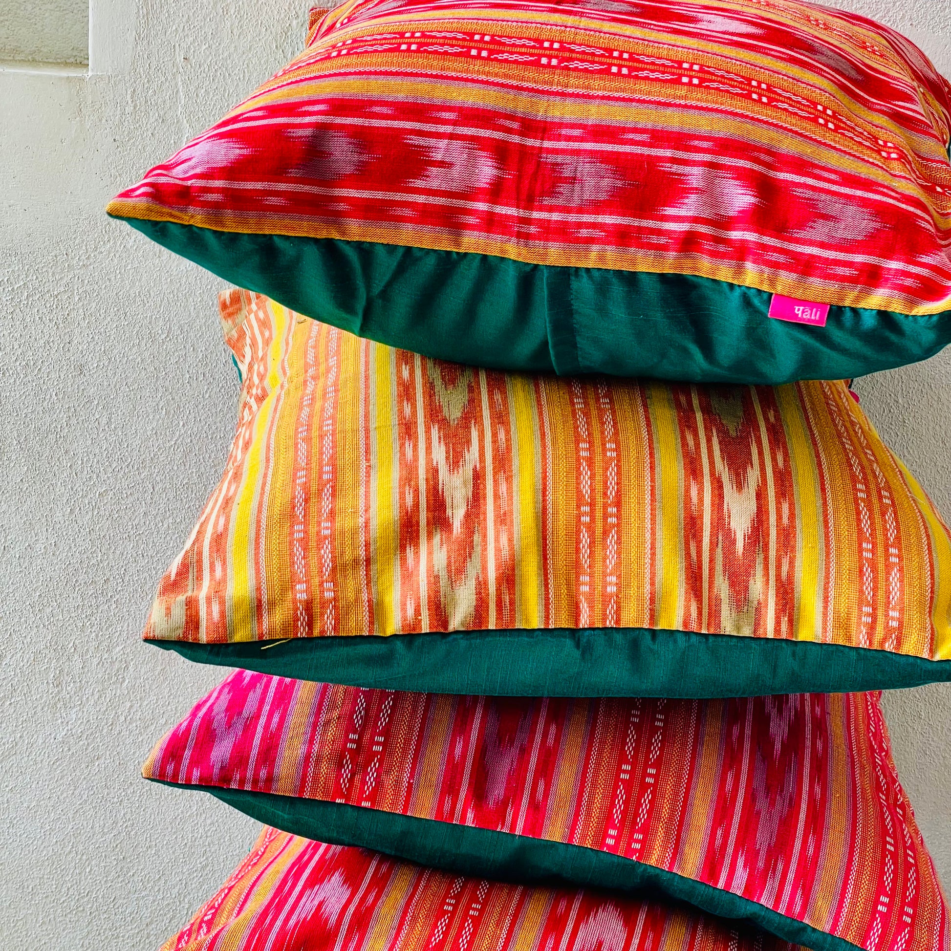 Vibrant cotton cushions promoting the crafts of India. Ikat cushions are a beautiful way to incorporate the rich heritage of Indian weaving into home décor. They serve not just as aesthetic elements but also as a reflection of the region’s artistry, tradition, and craftsmanship. By choosing Ikat cushions, you directly contribute to sustaining traditional weaving communities and preserving India’s rich textile heritage. Many artisans rely on these crafts for their livelihood, and purchasing authentic Ikat products helps keep these traditions alive.