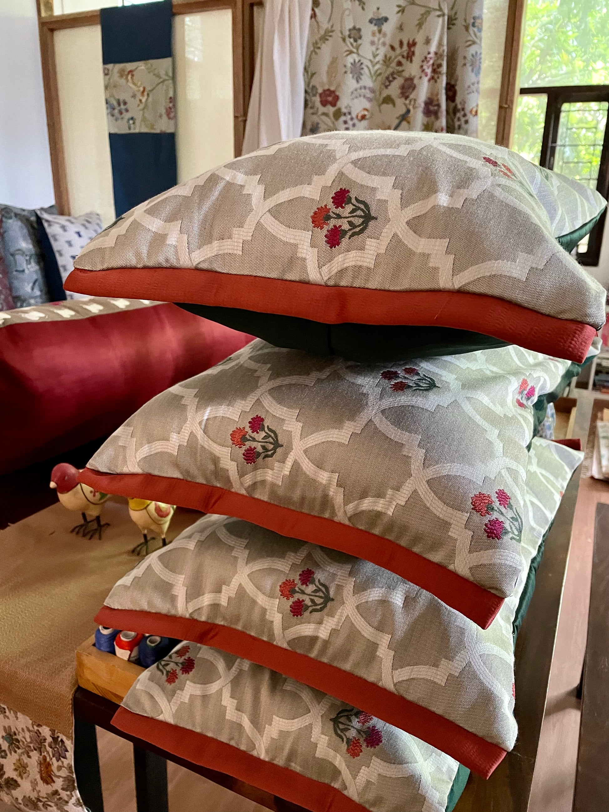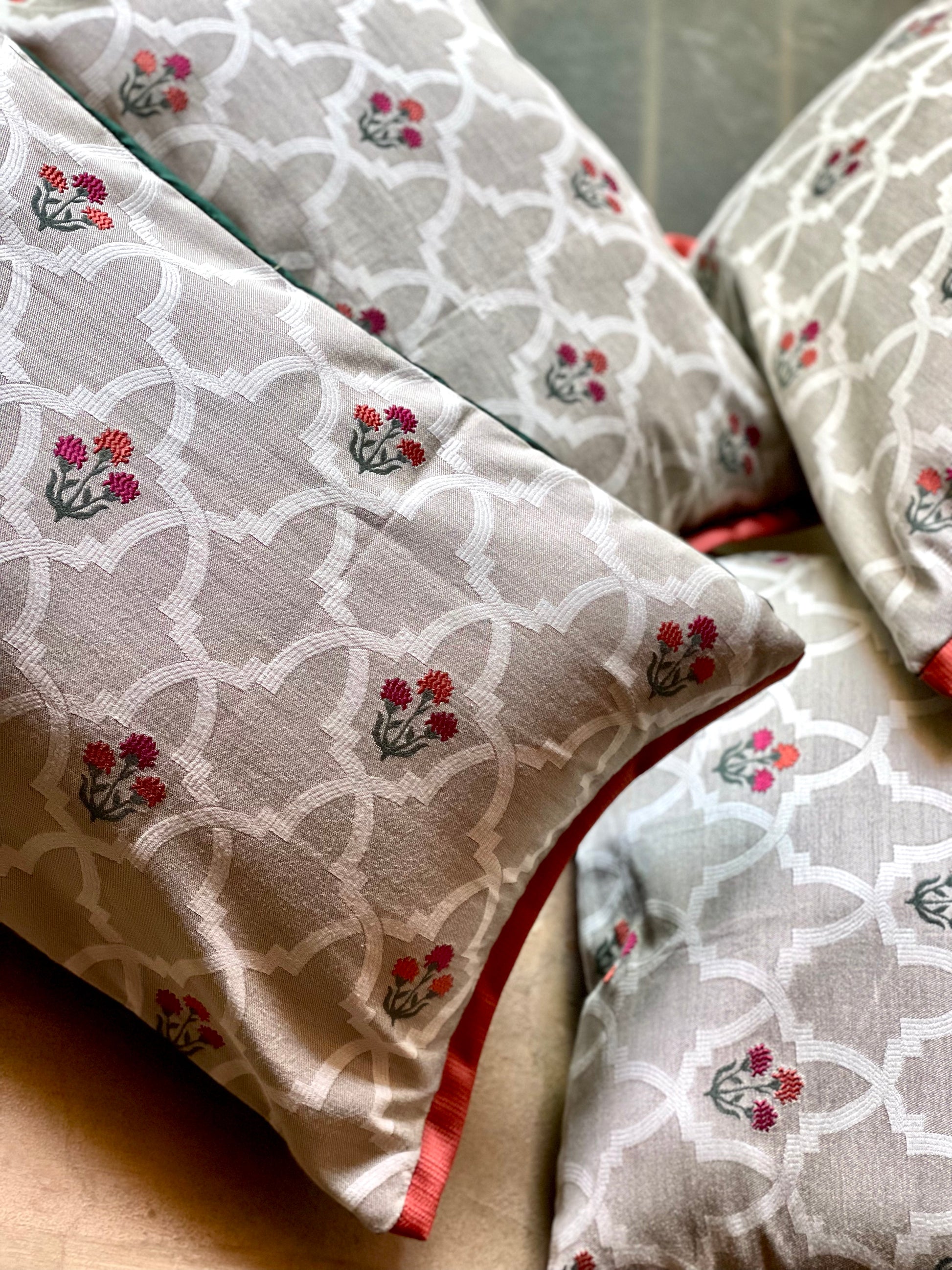 Tesellations (repeating geometric patterns) represent the concept of infinity and order, deeply rooted in Islamic and Mughal art. By incorporating tessellations and Mughal jali fretwork into cushions, home decor becomes a canvas for storytelling—one that bridges the past and present, geometry and artistry, tradition and modernity. When tessellations or jali patterns are adapted onto textiles like cushions, they bring a piece of this historic craftsmanship into modern homes. Tessellations and Mughal jali-inspired fretwork designs on cushions are more than just ornamental patterns—they are a reflection of history, craftsmanship, and artistic storytelling. These intricate geometric forms, often seen in Islamic and Mughal architecture, bring a sense of depth, rhythm, and cultural richness to contemporary interiors. The rhythmic flow of tessellations creates a meditative, balanced feel, making spaces more serene and sophisticated. Fretwork-inspired patterns in neutral or metallic tones add a regal, timeless charm, seamlessly blending tradition with contemporary elegance. The patterns tell stories of royal aesthetics, Persian influences, and the architectural genius of the Mughal era.