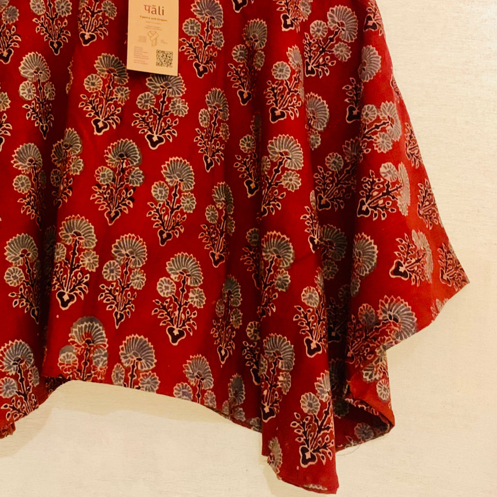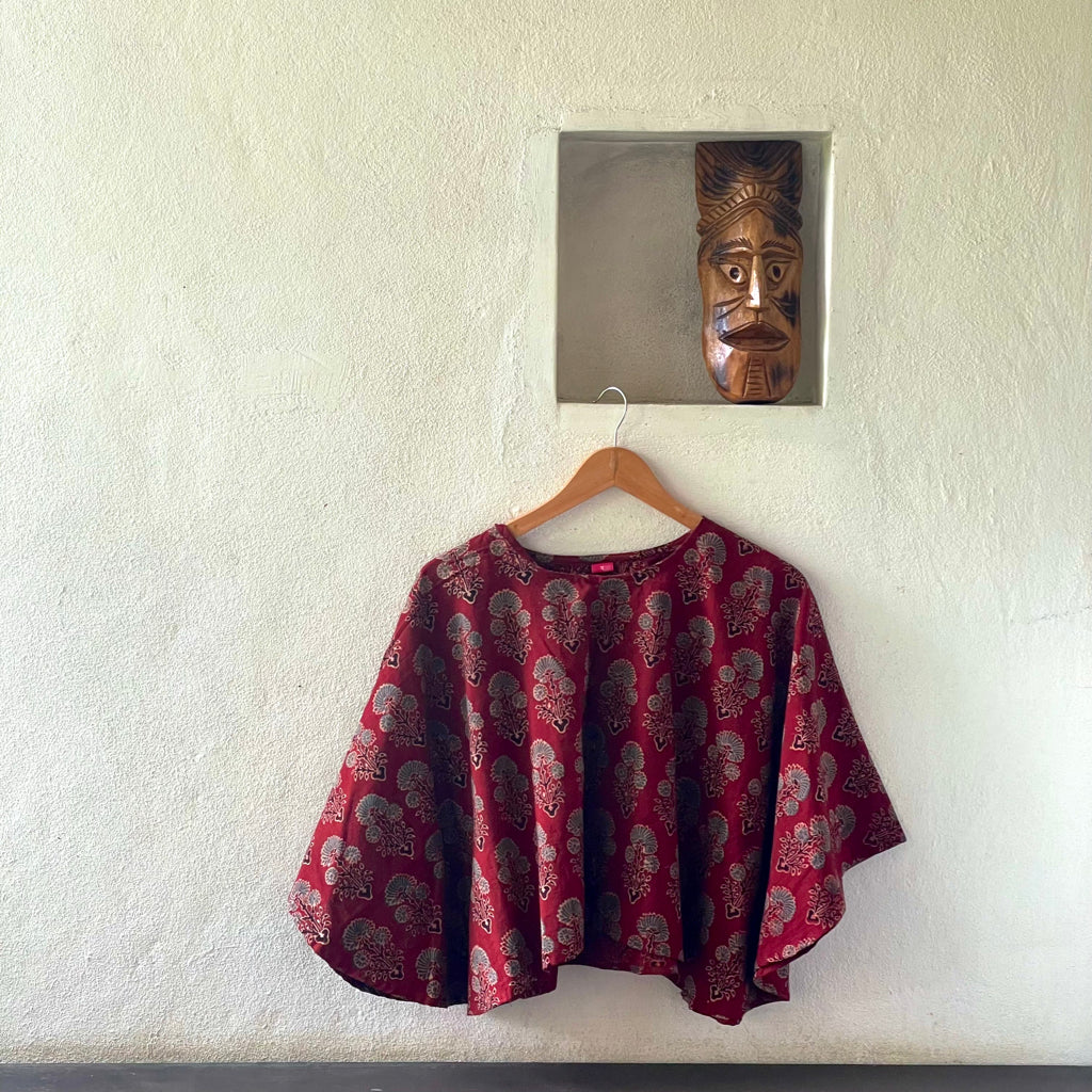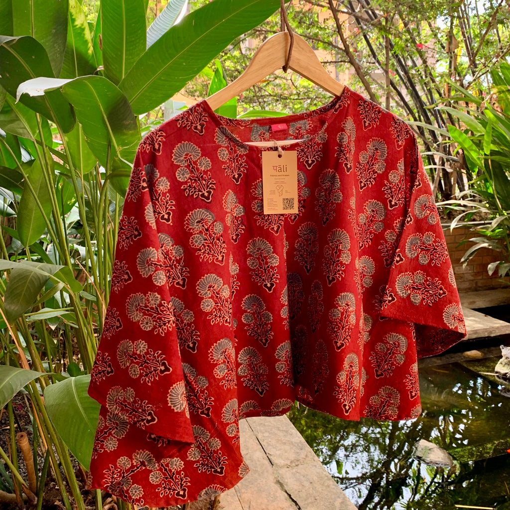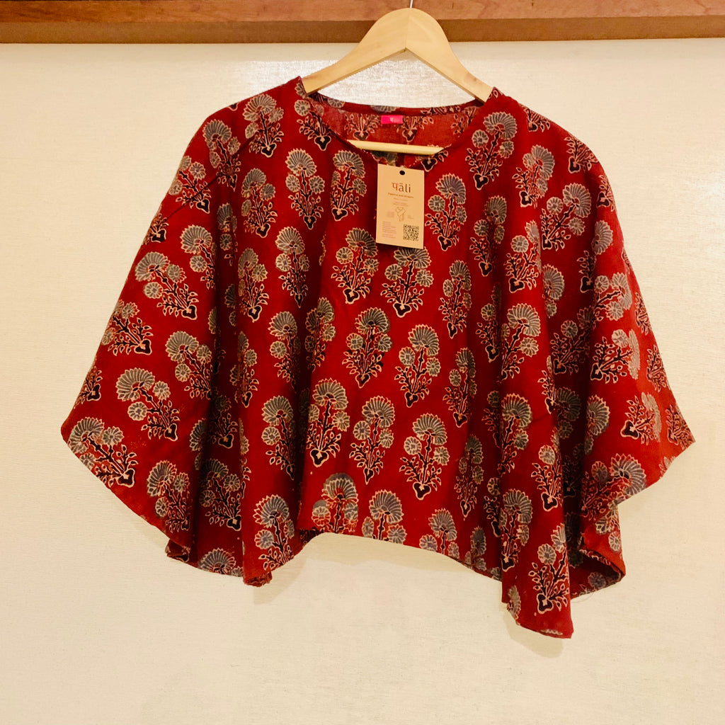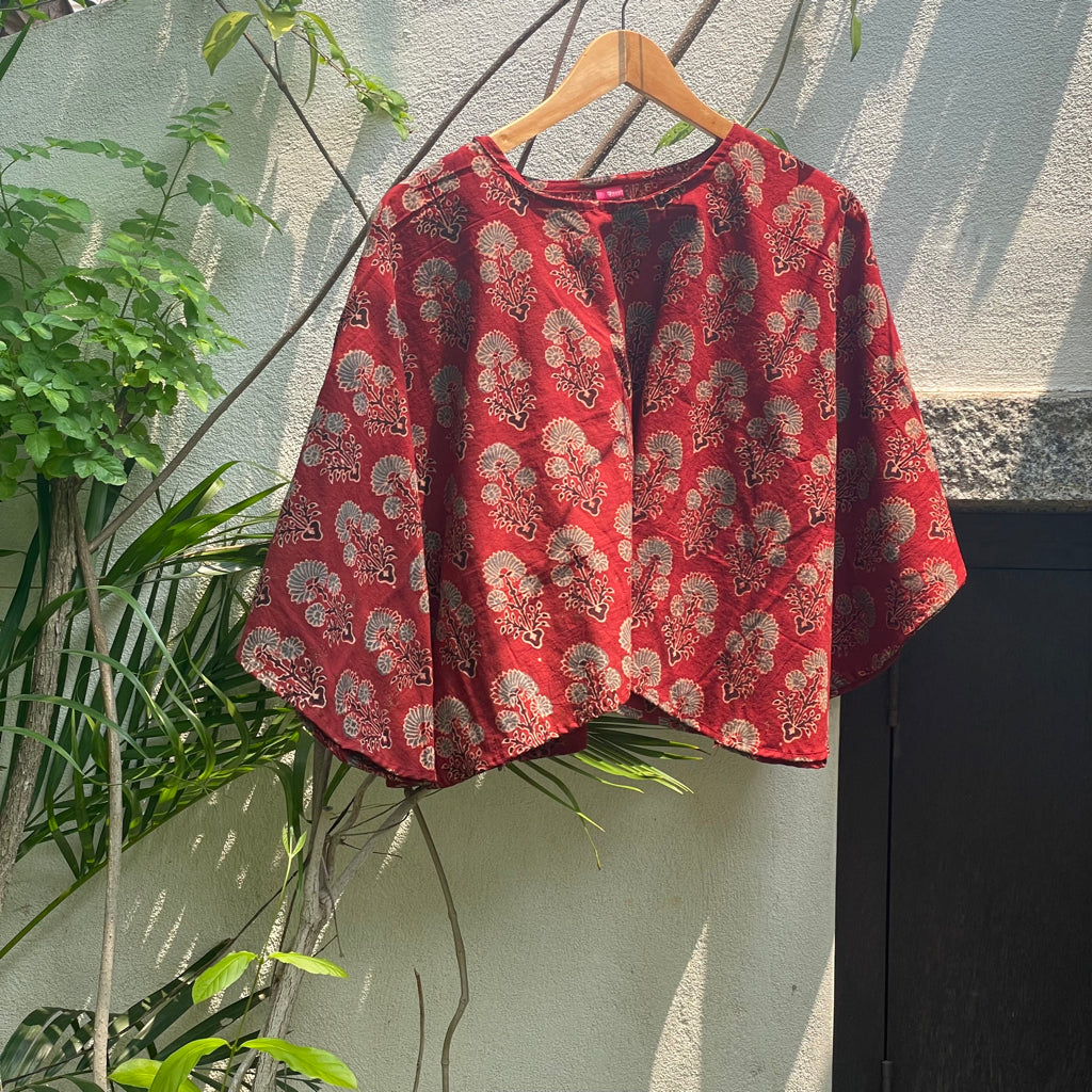 This contemporary silhouette blends traditional block-printed patterns with modern fashion, offering both comfort and style. Crafted from breathable cotton, it is ideal for India’s diverse climates. The charm of block printing lies in its handcrafted imperfections, showcasing the artisanal richness of Indian heritage. This centuries-old technique involves stamping intricate, hand-carved wooden blocks onto fabric, resulting in vibrant, culturally rooted designs. Lightweight and soft, block-printed cotton garments are versatile and comfortable for daily or festive wear. They pair well with skirts, shorts, jeans, or can be draped with a sari for a fresh, ethnic twist. Size: 43 inches x 20 inches ( Horizontal x Vertical )