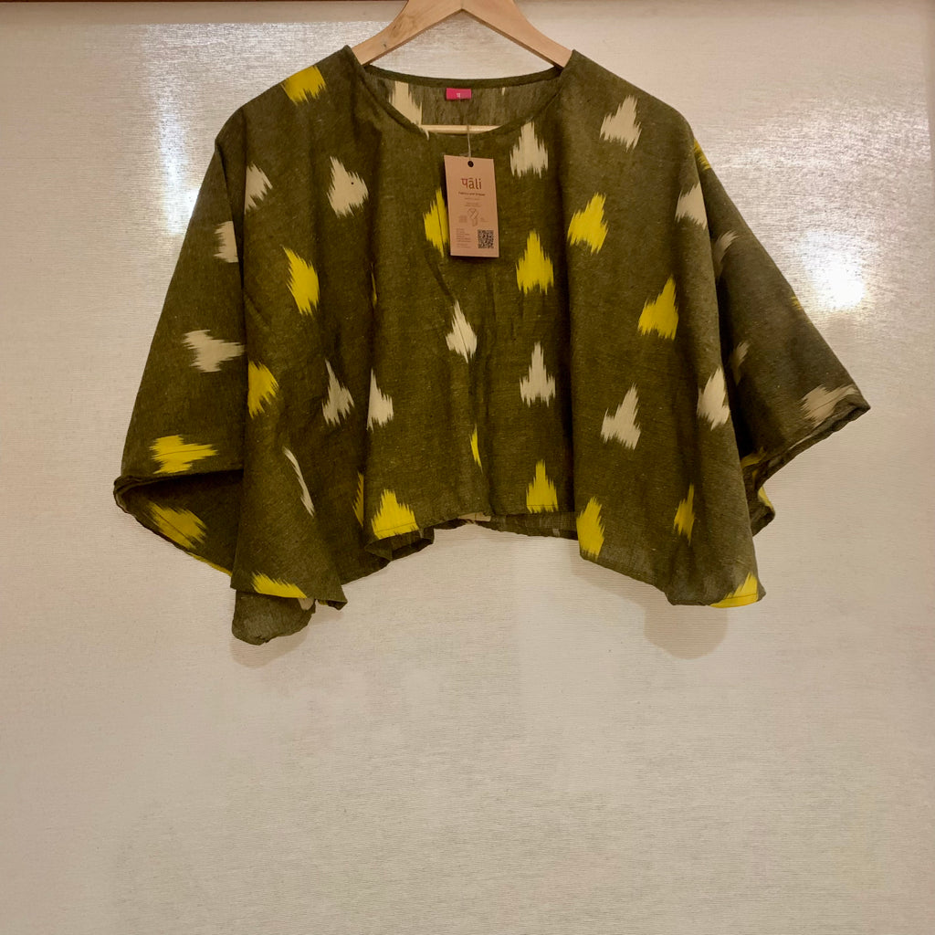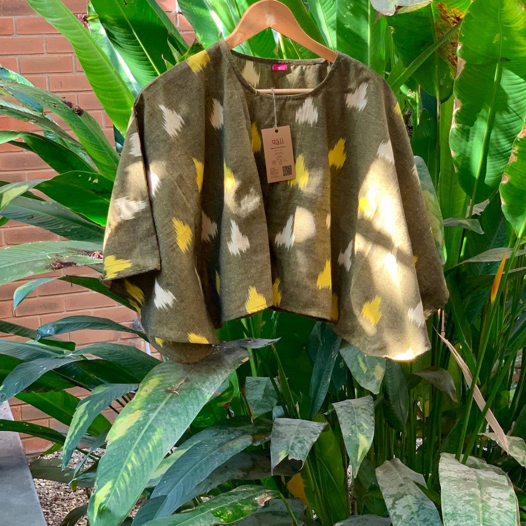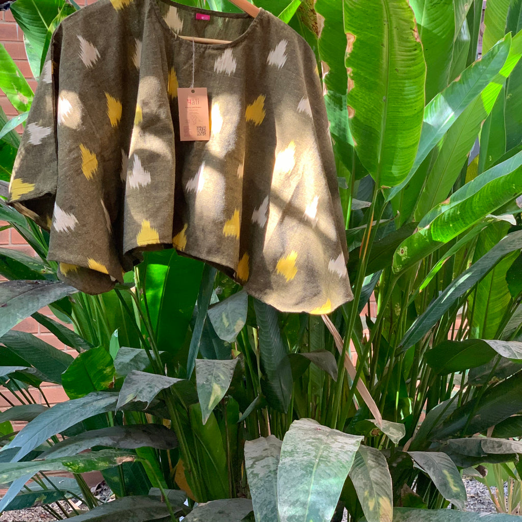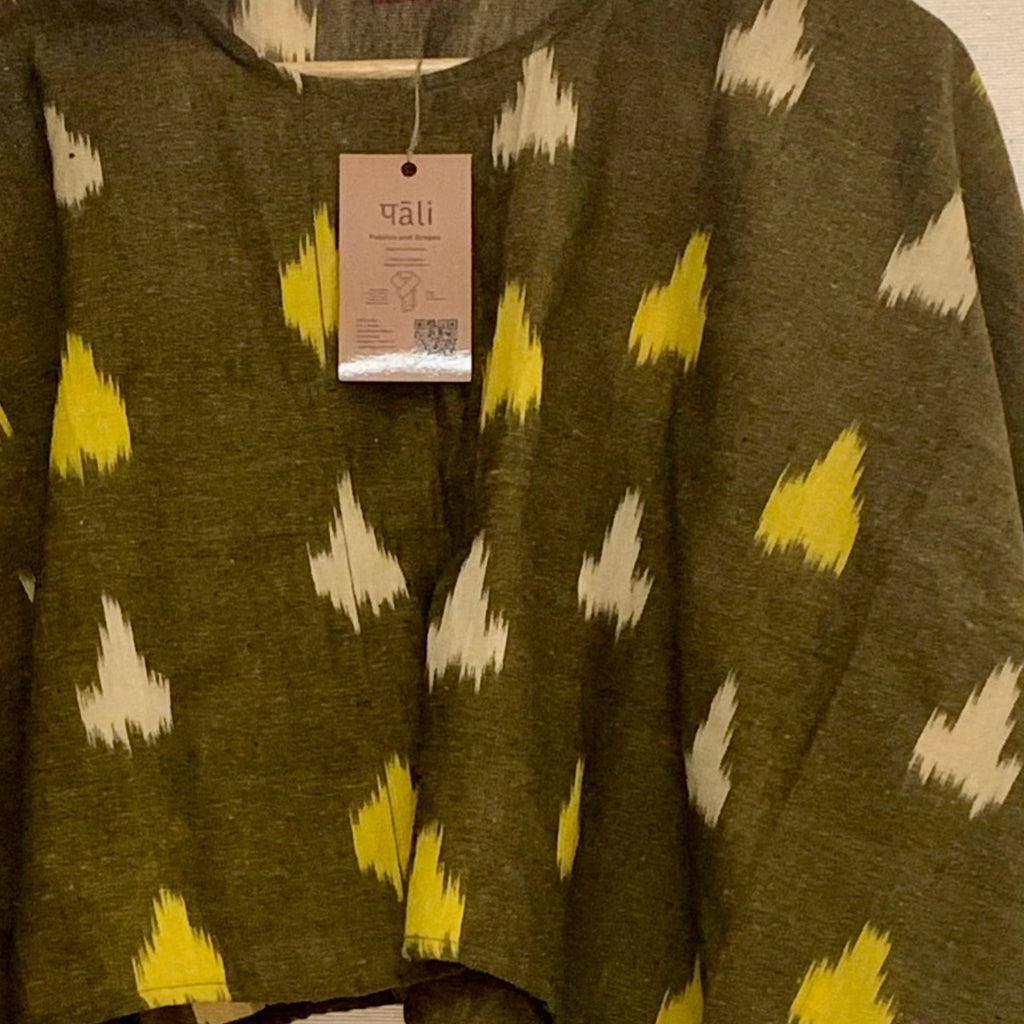 This striking contemporary interpretation of ikat as a cotton summer tops brings in comfort and style. Embrace the relaxed elegance of this cotton ikat. Cotton ikat fabrics have emerged as a favourite in contemporary Indian fashion, marrying the timeless beauty of traditional dyeing techniques with modern, comfortable silhouettes. Cotton ikat fabrics provide the perfect blend of comfort, style, and cultural depth. These styles exemplify how traditional materials can be transformed into modern wardrobe staples that are as practical as they are beautiful. Made from breathable cotton fabrics this could be worn with skirts, shorts, or even a pair of jeans. Festive times it could be draped with a handwoven cotton, jamdani weave sari.