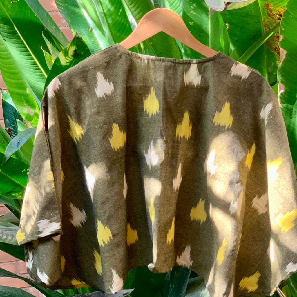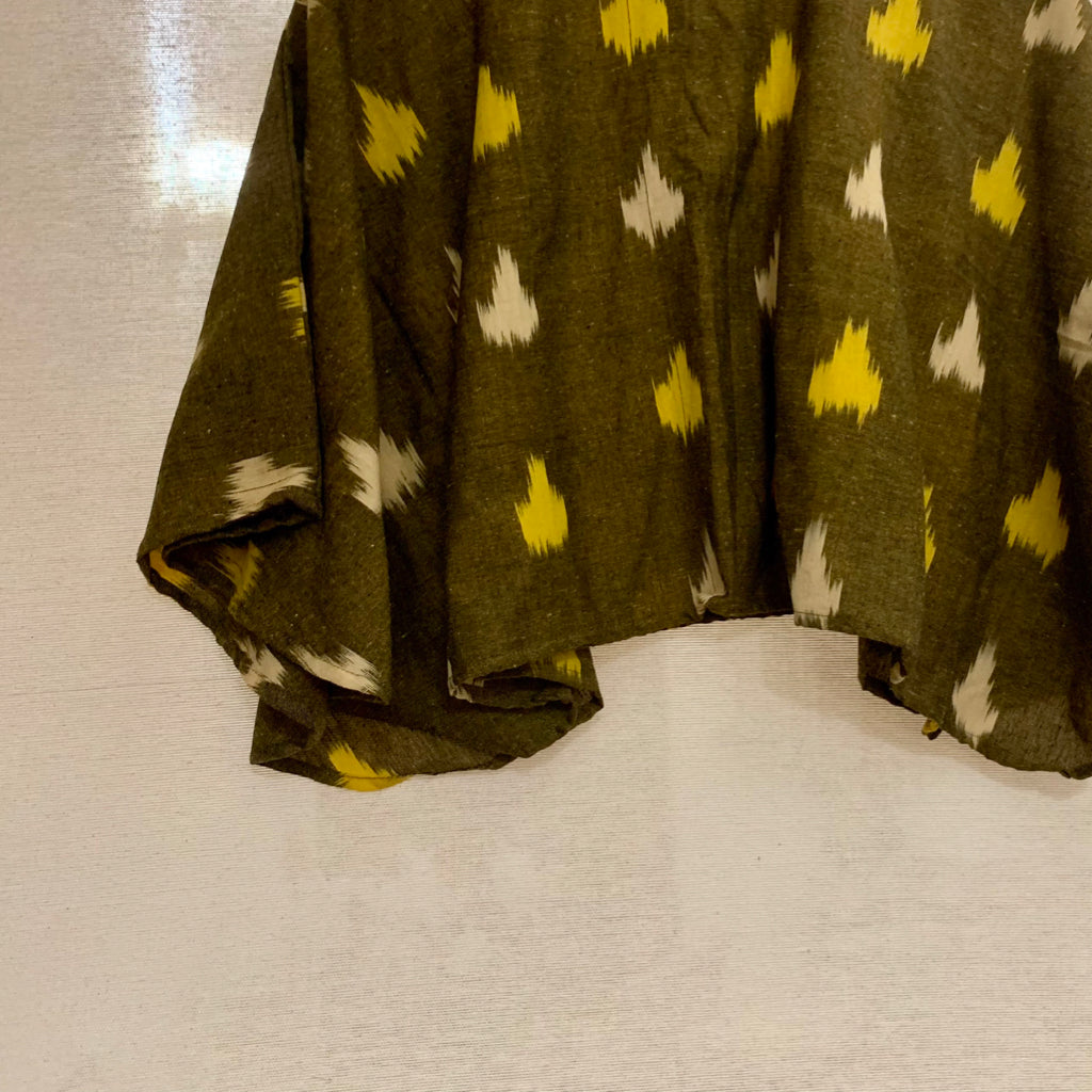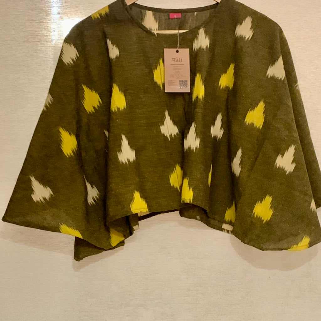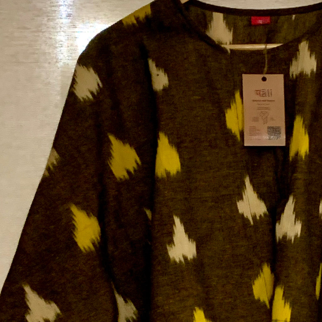 This striking contemporary interpretation of ikat as a cotton summer tops brings in comfort and style. Embrace the relaxed elegance of this cotton ikat. Cotton ikat fabrics have emerged as a favourite in contemporary Indian fashion, marrying the timeless beauty of traditional dyeing techniques with modern, comfortable silhouettes. Cotton ikat fabrics provide the perfect blend of comfort, style, and cultural depth. These styles exemplify how traditional materials can be transformed into modern wardrobe staples that are as practical as they are beautiful. Made from breathable cotton fabrics this could be worn with skirts, shorts, or even a pair of jeans. Festive times it could be draped with a handwoven cotton, jamdani weave sari.