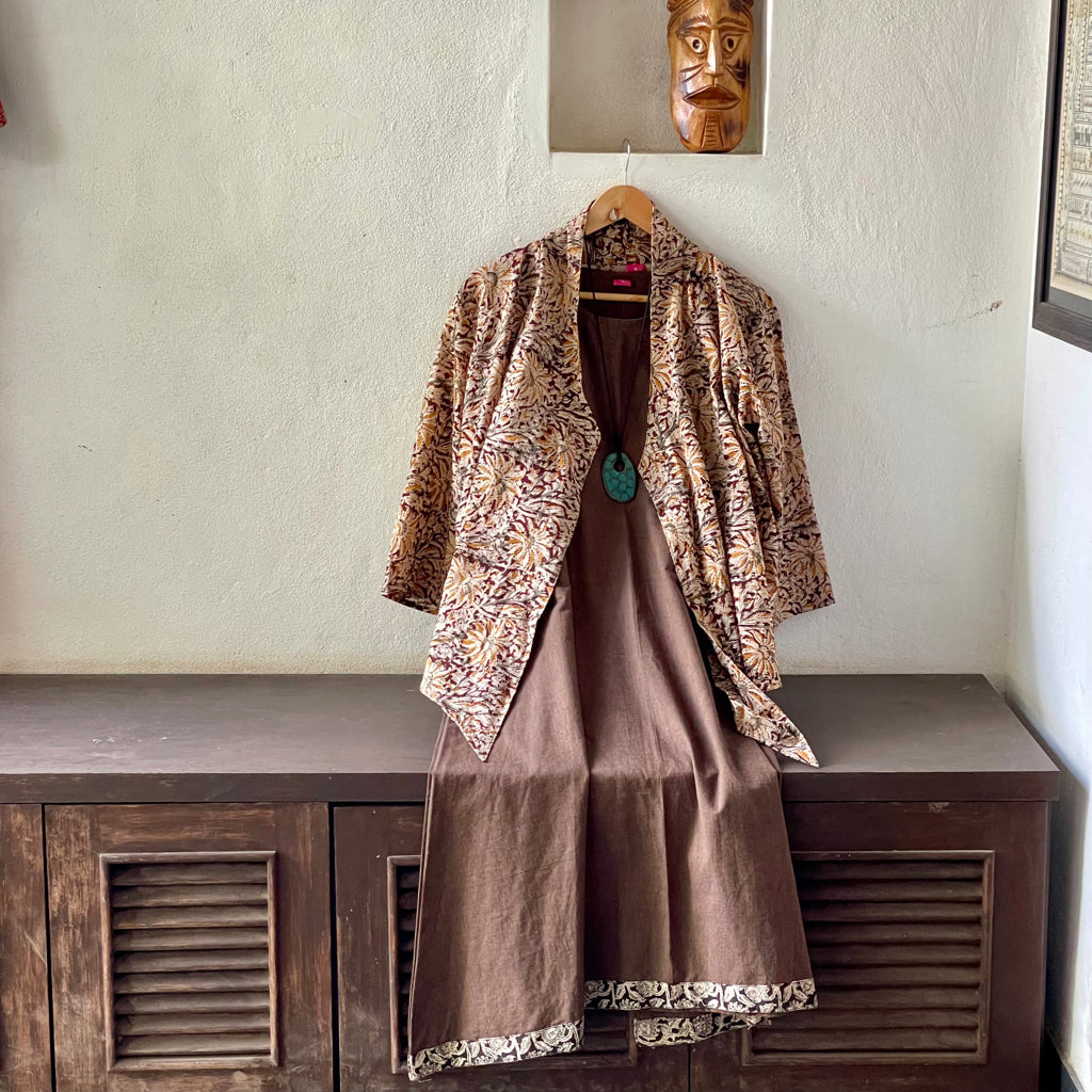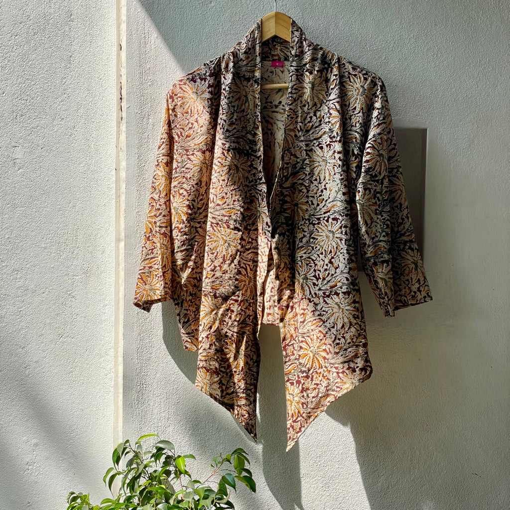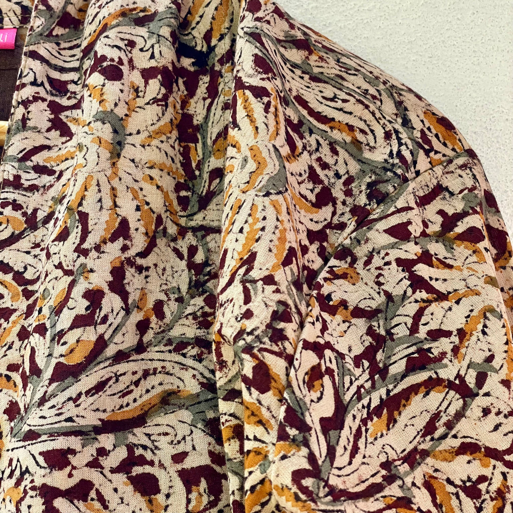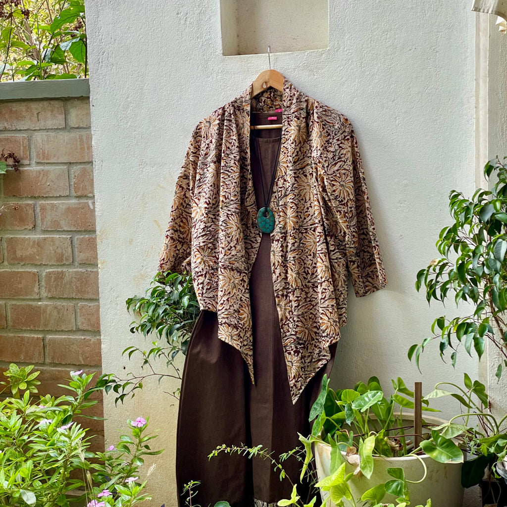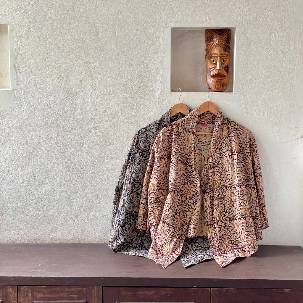 These cotton shrugs are a fabulous companion for any occasion, Works as a wonder on any sleeveless clothing- it is effortless to club the combos. Kalamkari cotton shrugs are a perfect example of tradition meeting trend. Crafted using the ancient art of Kalamkari—where natural dyes bring hand-drawn or block-printed motifs to life—these shrugs are more than just garments; they’re stories worn on fabric. Kalamkari designs often feature mythological tales, floral patterns, and intricate borders, all rendered with meticulous detail. Each shrug carries an artistic soul, making every piece unique and full of character. Made from soft, breathable cotton and dyed with plant-based colors, these shrugs are gentle on the skin and kind to the planet. They’re perfect for all-day comfort, whether it’s summer heat or transitional weather. Layer a Kalamkari shrug over a plain dress, kurta, or even a tee-and-jeans combo, and watch the look transform. The earthy tones and rich patterns add instant depth, making your outfit effortlessly stylish. Kalamkari is often handmade by skilled artisans, supporting traditional craft communities and promoting sustainable fashion practices. Wearing one is both a fashion and cultural statement. In essence, Kalamkari cotton shrugs are wearable heritage—elegant, expressive, and endlessly versatile. They’re not just apparel; they’re heirlooms in the making. Shrug Size:( 28 Width x Length 33 x Shoulder 18 x Sleeve 26 ) inches