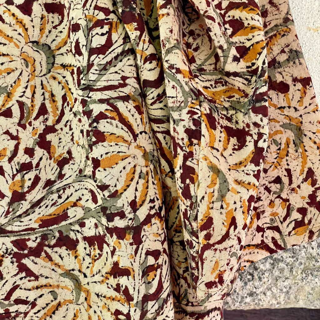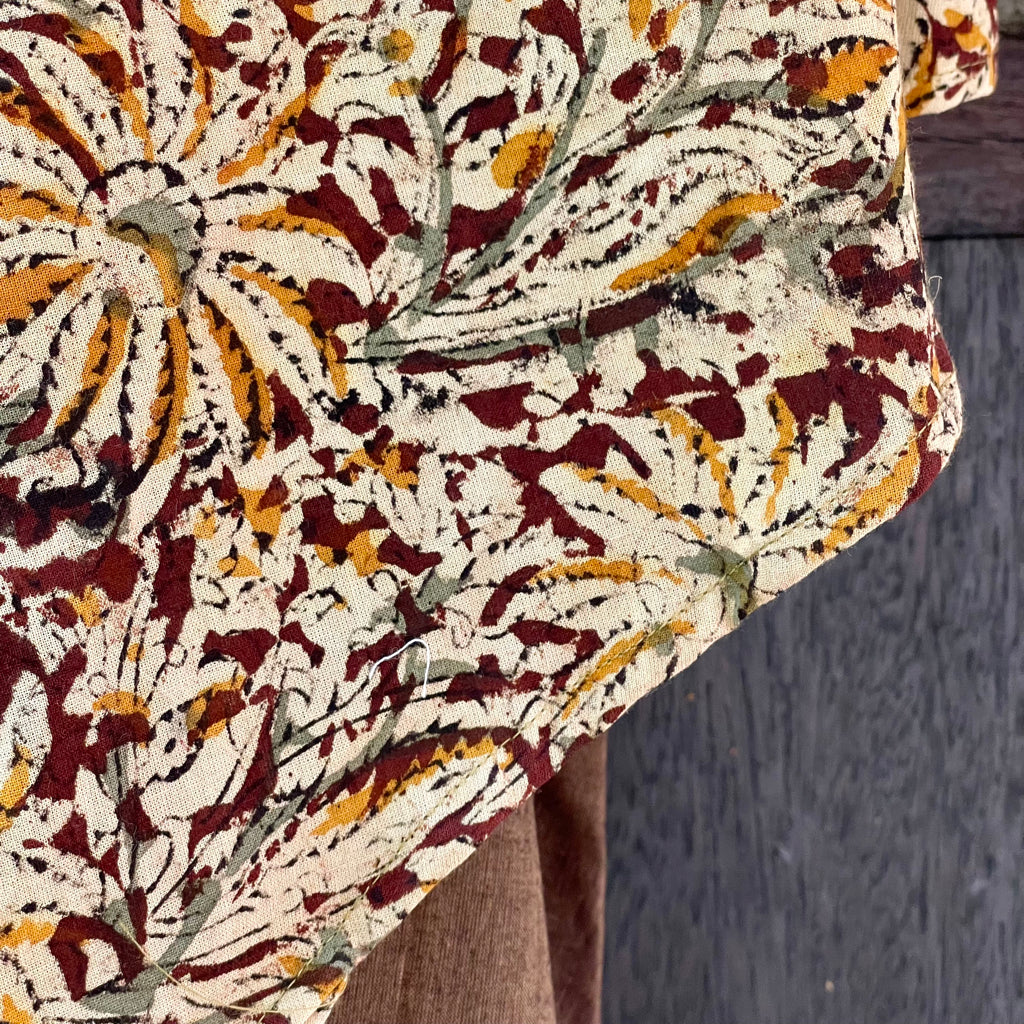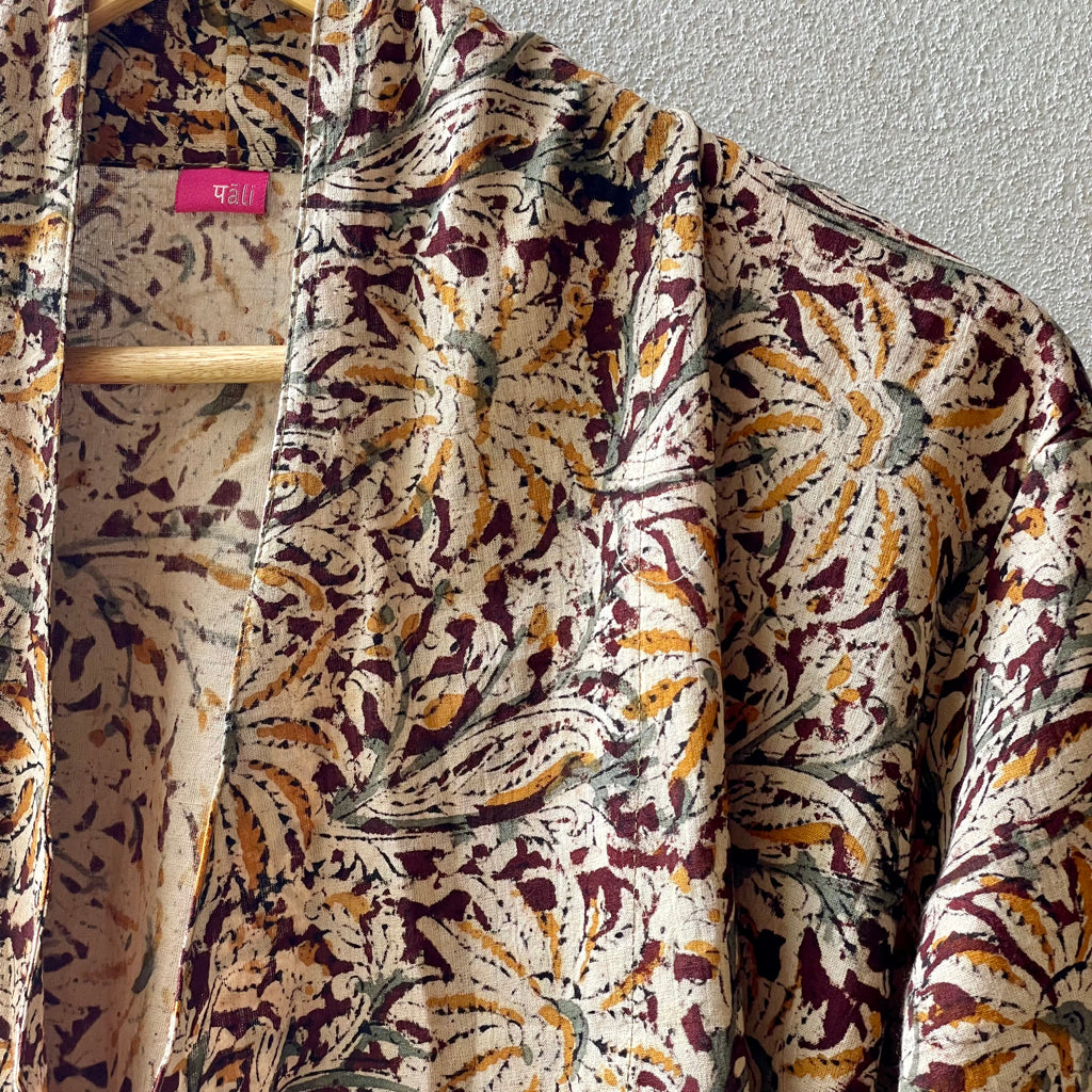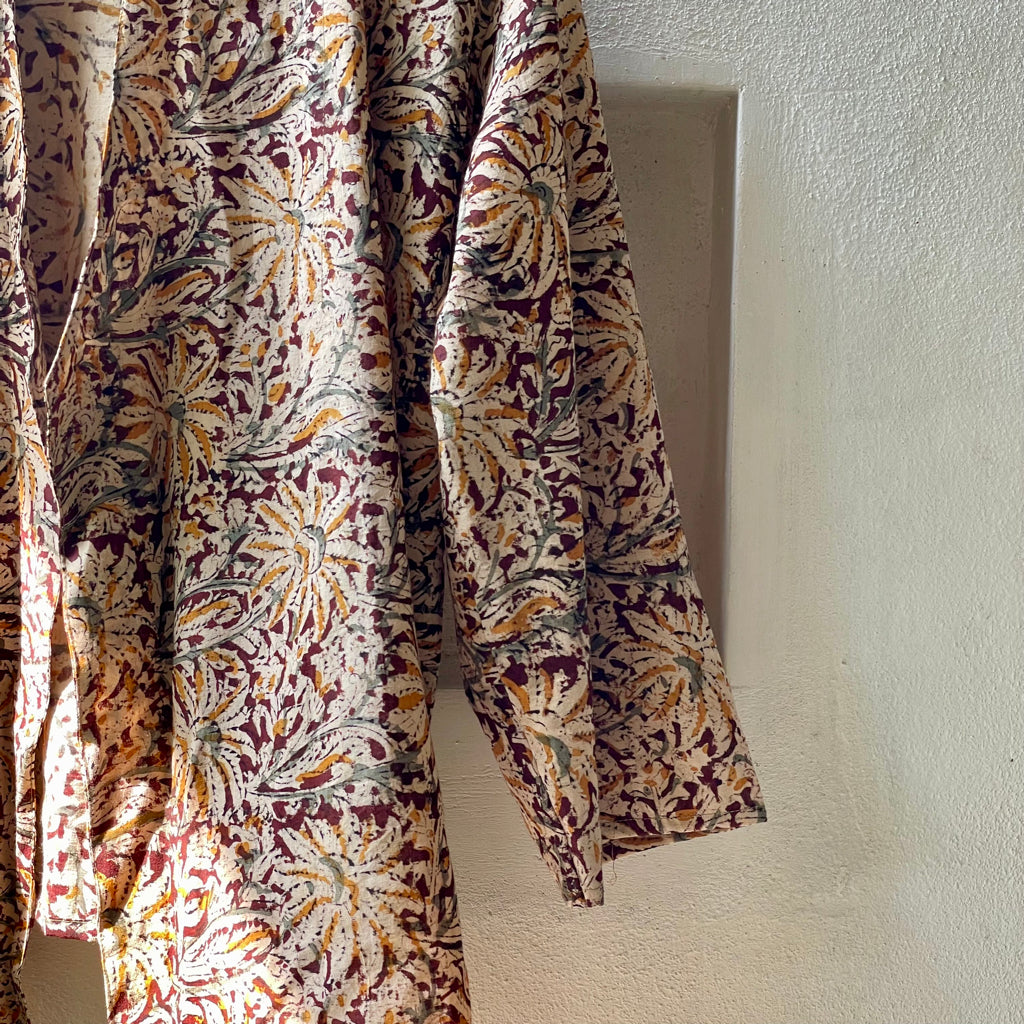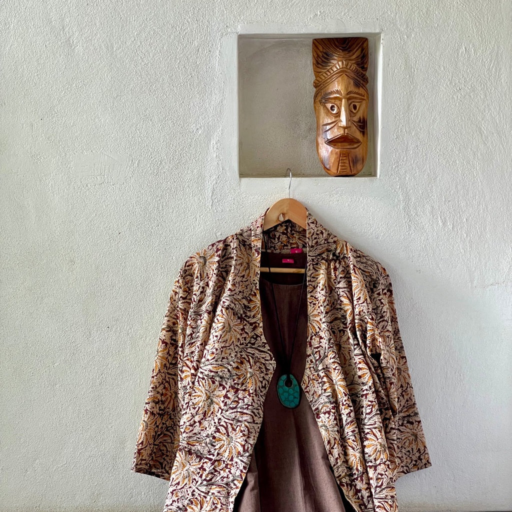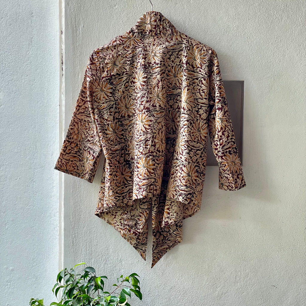These cotton shrugs are a fabulous companion for any occasion, Works as a wonder on any sleeveless clothing- it is effortless to club the combos. Kalamkari cotton shrugs are a perfect example of tradition meeting trend. Crafted using the ancient art of Kalamkari—where natural dyes bring hand-drawn or block-printed motifs to life—these shrugs are more than just garments; they’re stories worn on fabric. Kalamkari designs often feature mythological tales, floral patterns, and intricate borders, all rendered with meticulous detail. Each shrug carries an artistic soul, making every piece unique and full of character. Made from soft, breathable cotton and dyed with plant-based colors, these shrugs are gentle on the skin and kind to the planet. They’re perfect for all-day comfort, whether it’s summer heat or transitional weather. Layer a Kalamkari shrug over a plain dress, kurta, or even a tee-and-jeans combo, and watch the look transform. The earthy tones and rich patterns add instant depth, making your outfit effortlessly stylish. Kalamkari is often handmade by skilled artisans, supporting traditional craft communities and promoting sustainable fashion practices. Wearing one is both a fashion and cultural statement. In essence, Kalamkari cotton shrugs are wearable heritage—elegant, expressive, and endlessly versatile. They’re not just apparel; they’re heirlooms in the making. Shrug Size:( 28 Width x Length 33 x Shoulder 18 x Sleeve 26 ) inches