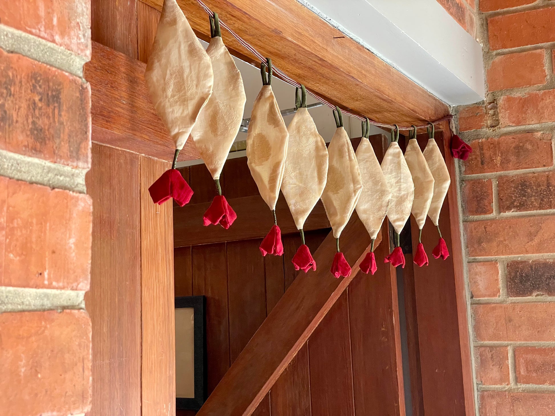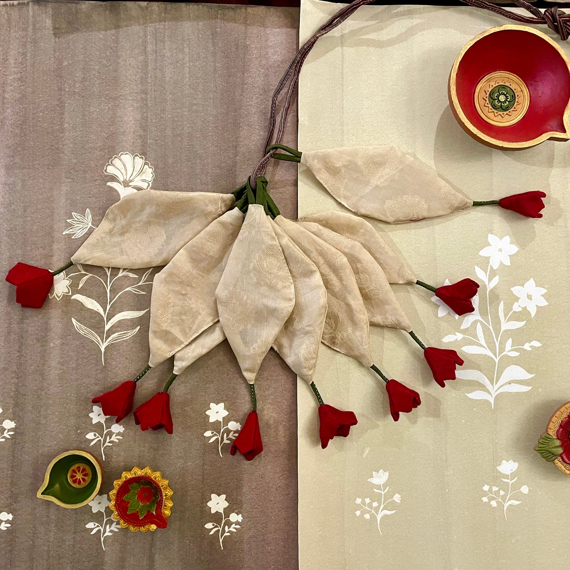 Toran is a decorative gateway hanging traditionally placed at the entrance of Indian homes. Made from vibrant materials like fabrics and fabric flowers, it welcomes guests with warmth and positivity. Symbolically, Toran represents prosperity, good fortune, and the warding off of negative energies. Often used during festivals and auspicious occasions, it enhances the aesthetic appeal of doorways. The presence of a Toran is rooted in the belief that a well-decorated entrance invites happiness and divine blessings into the home. It stands as a beautiful blend of tradition, spirituality, and hospitality.